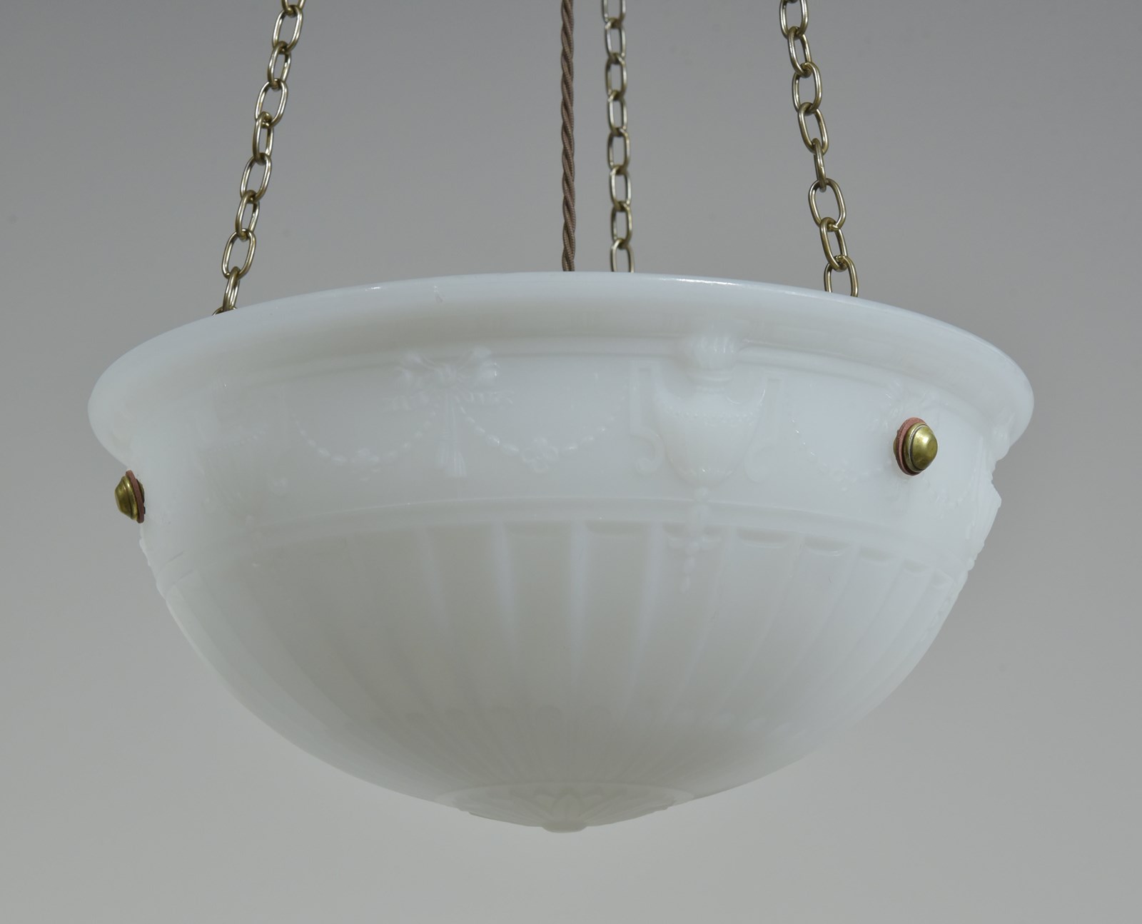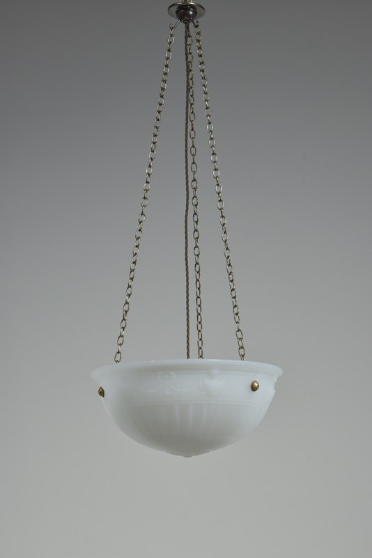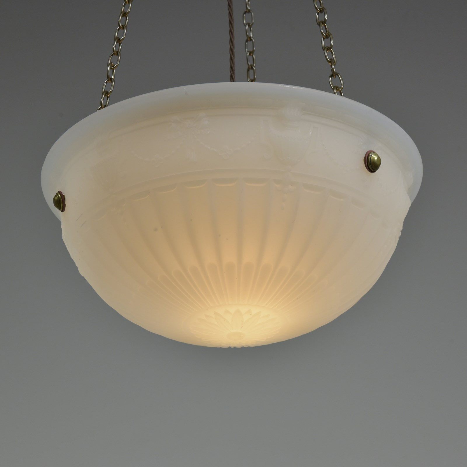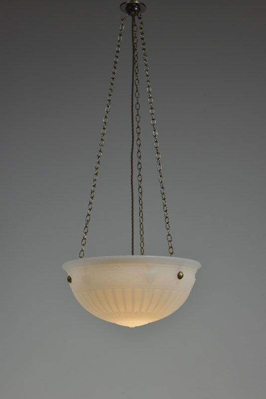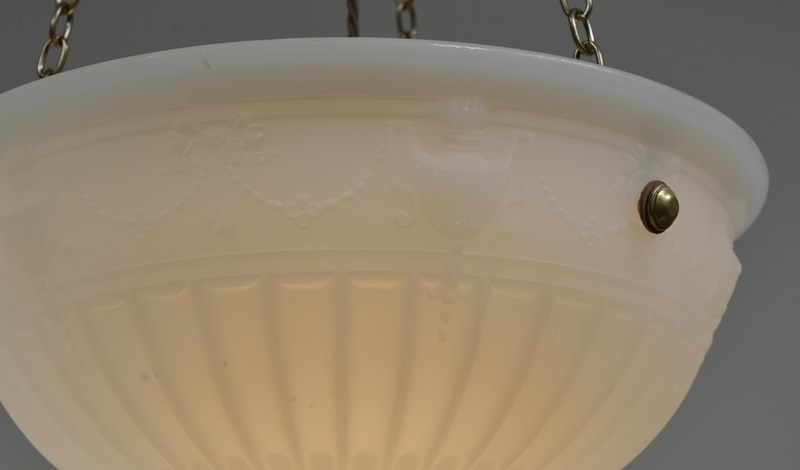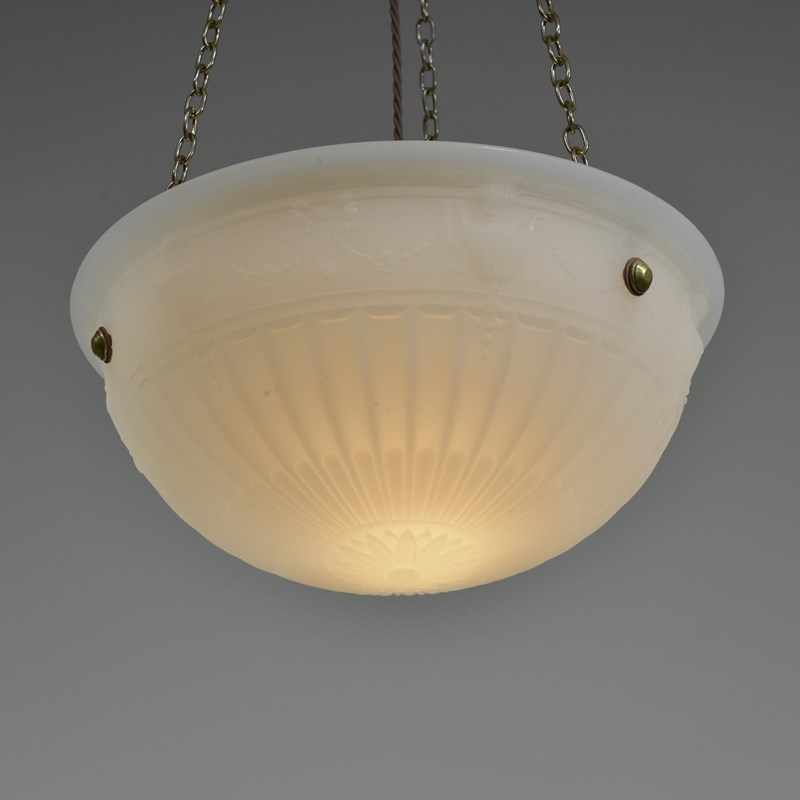 An antique moonstone glass bowl plafonnier light with repeating urn, ribbon and bellflower swag decoration to the perimeter and radial fluting. English early 20th century.