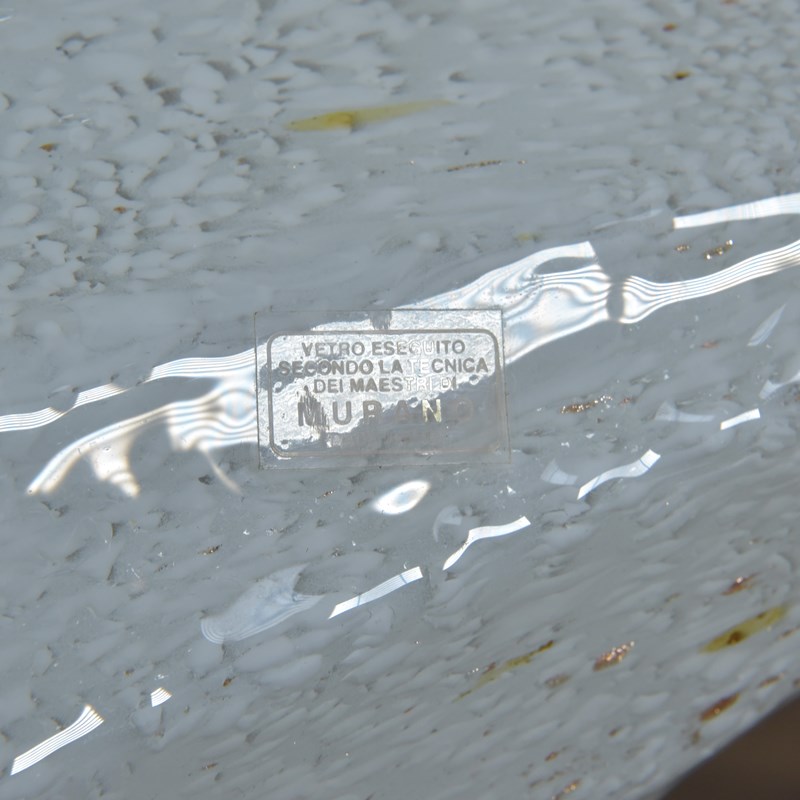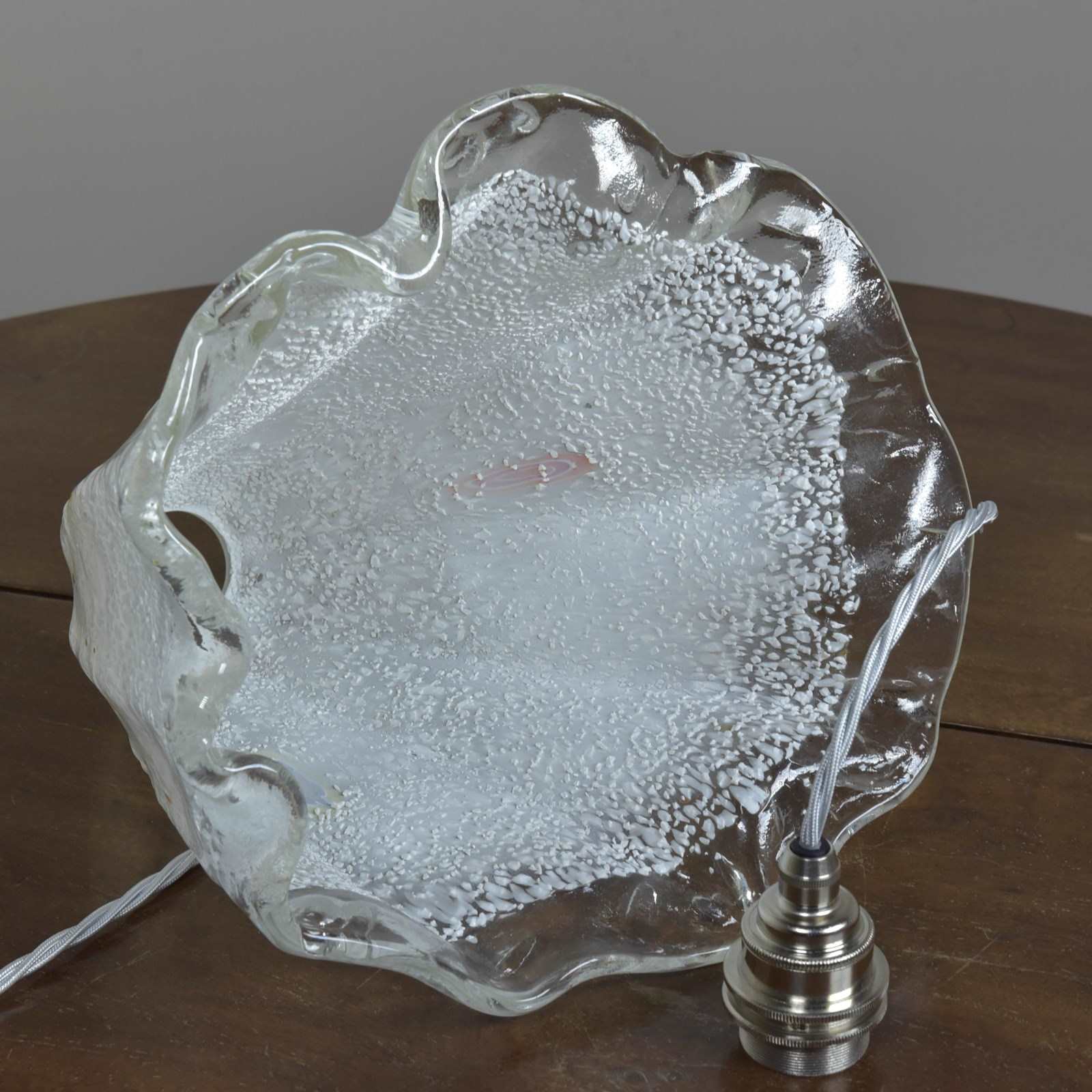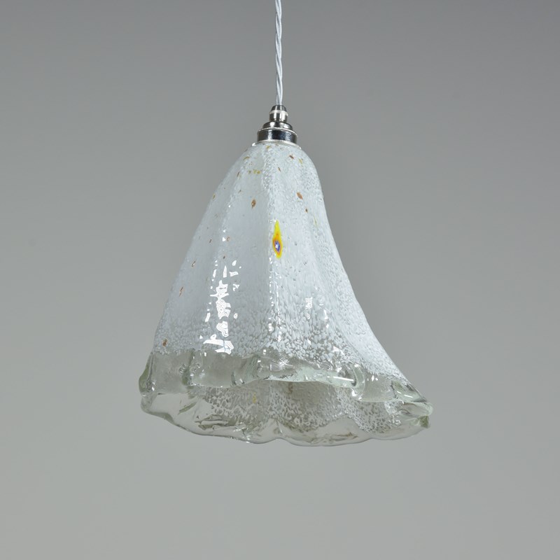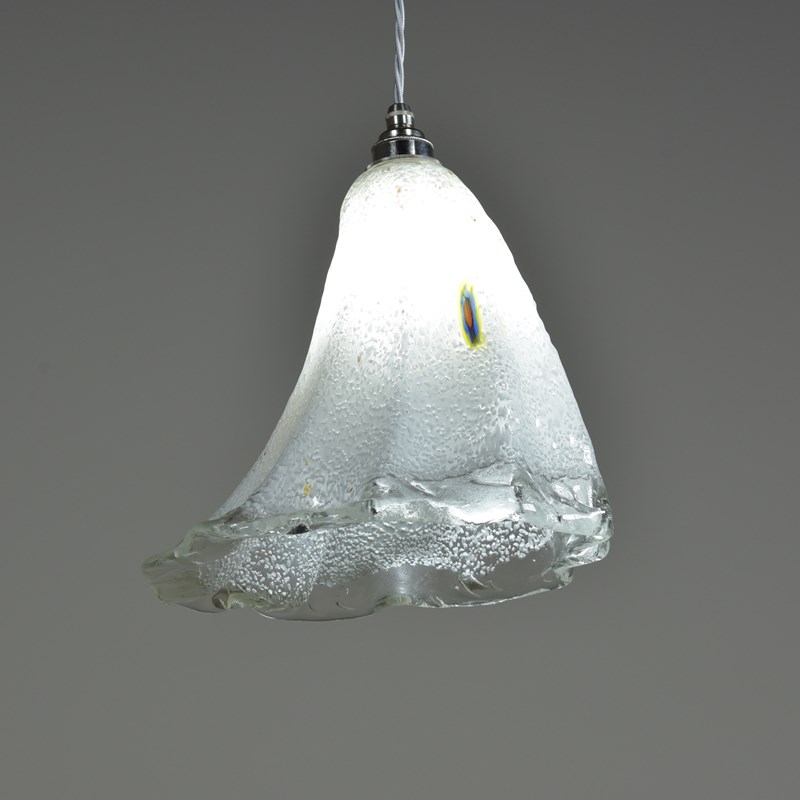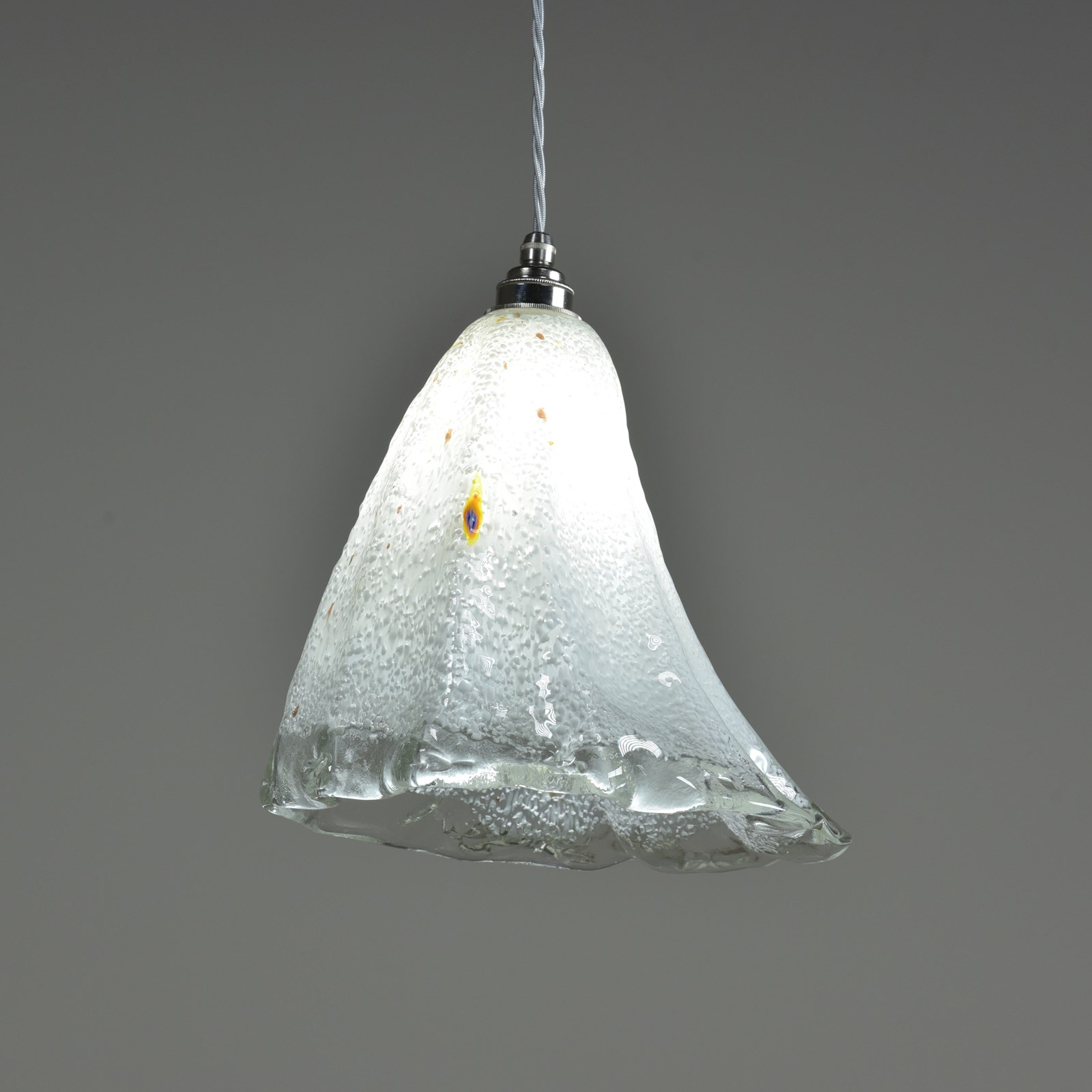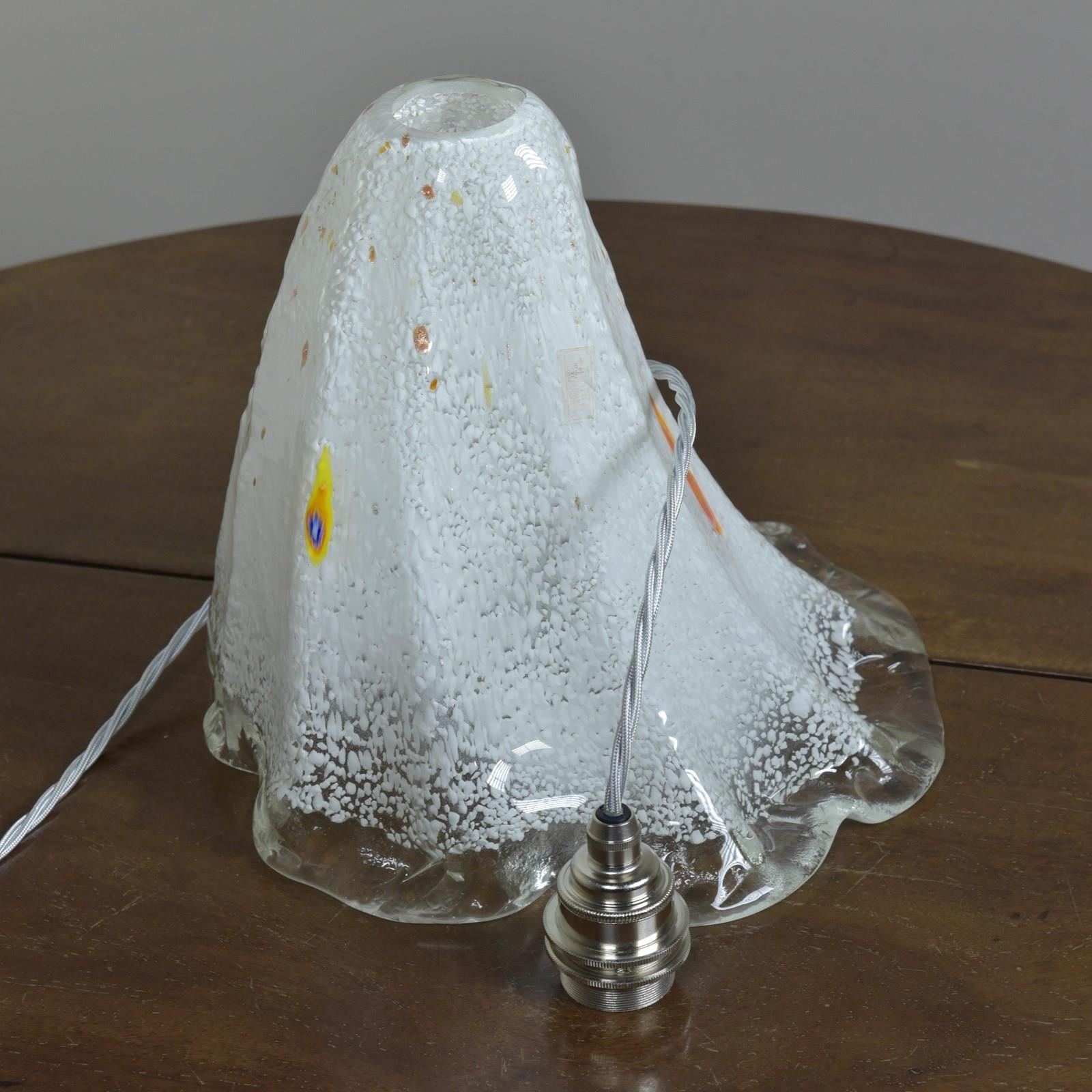 An orchid flower shaped Murano glass pendant light shade having gold flecks and coloured streaks within the glass, the inside covered with white glass frits.