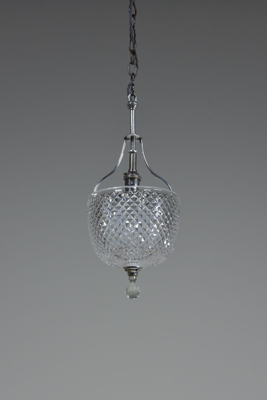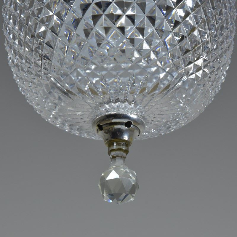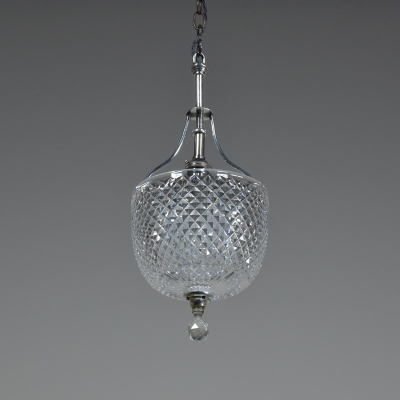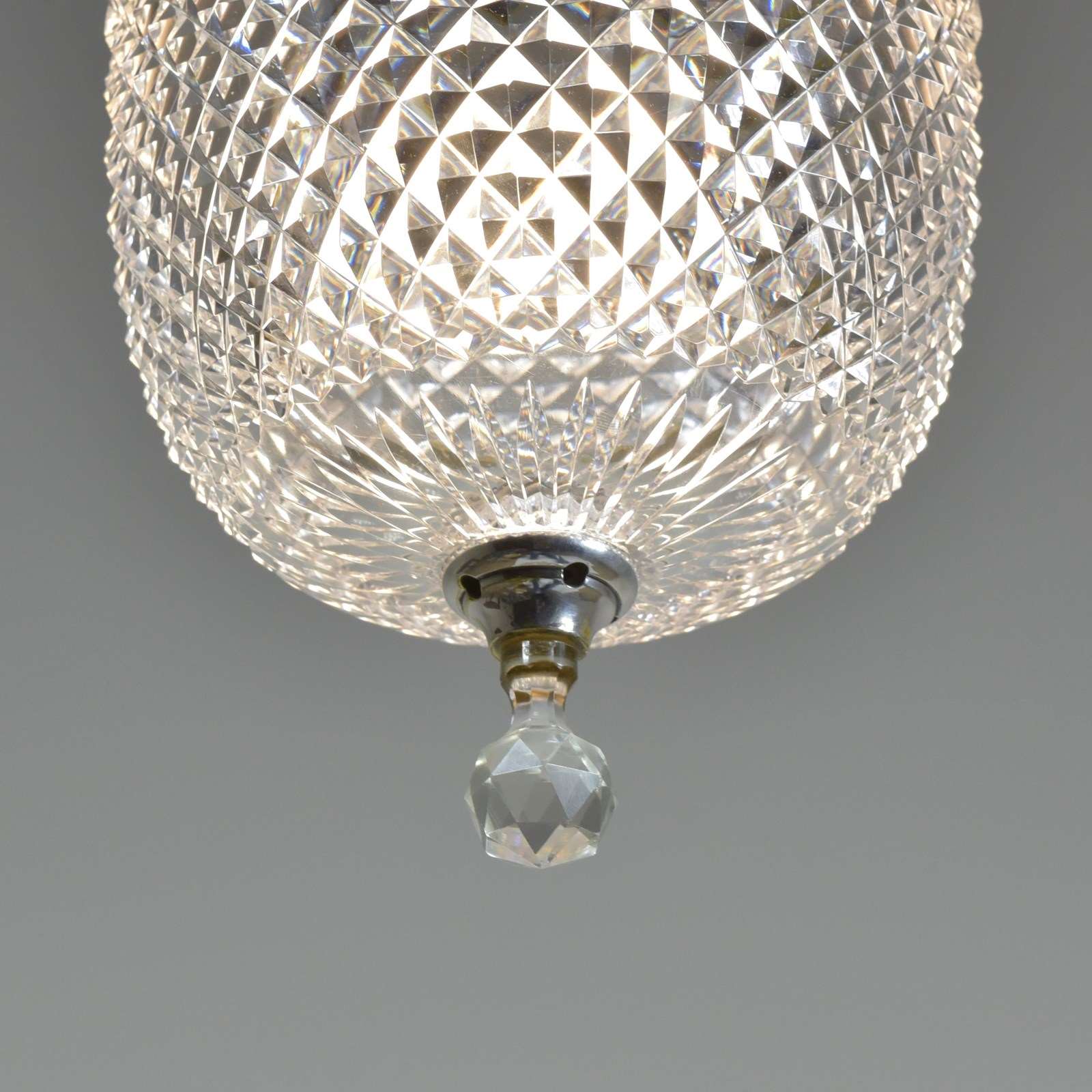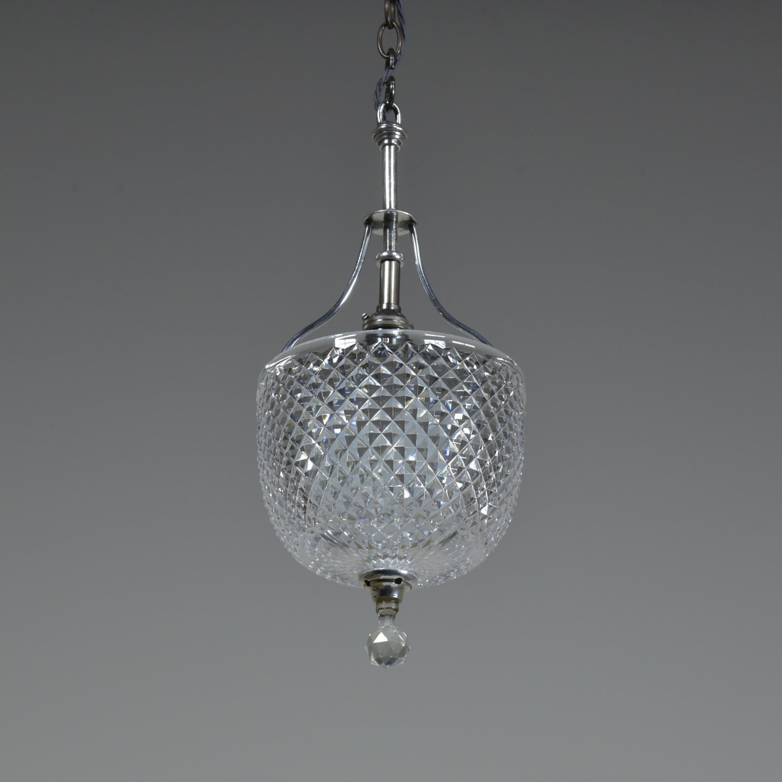 A small silver mounted cut glass hobnail bowl pendant light / lantern with a cut glass finial probably by Osler. Edwardian 1900.