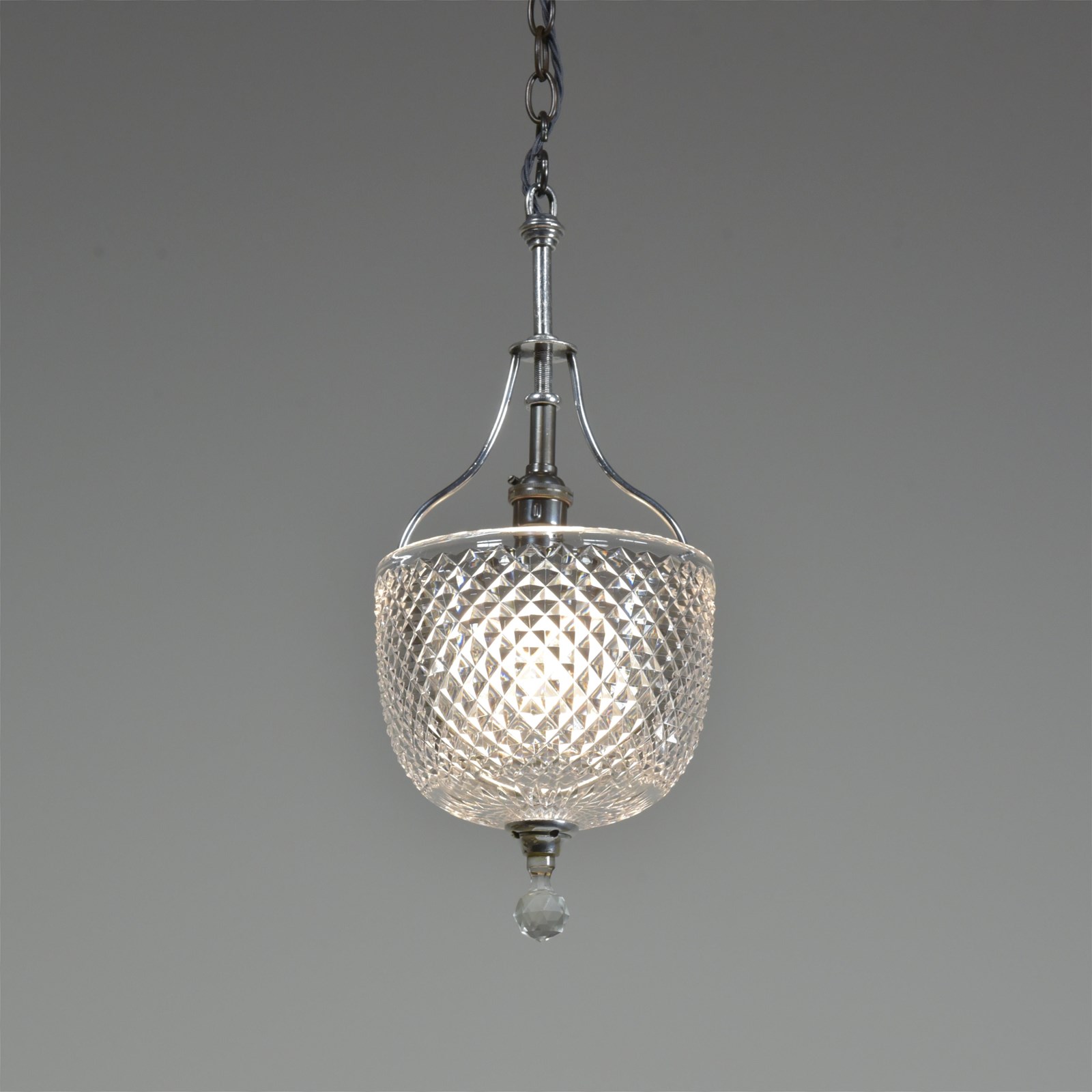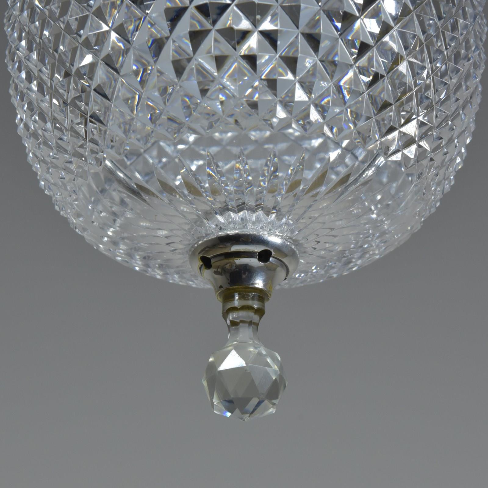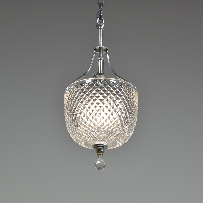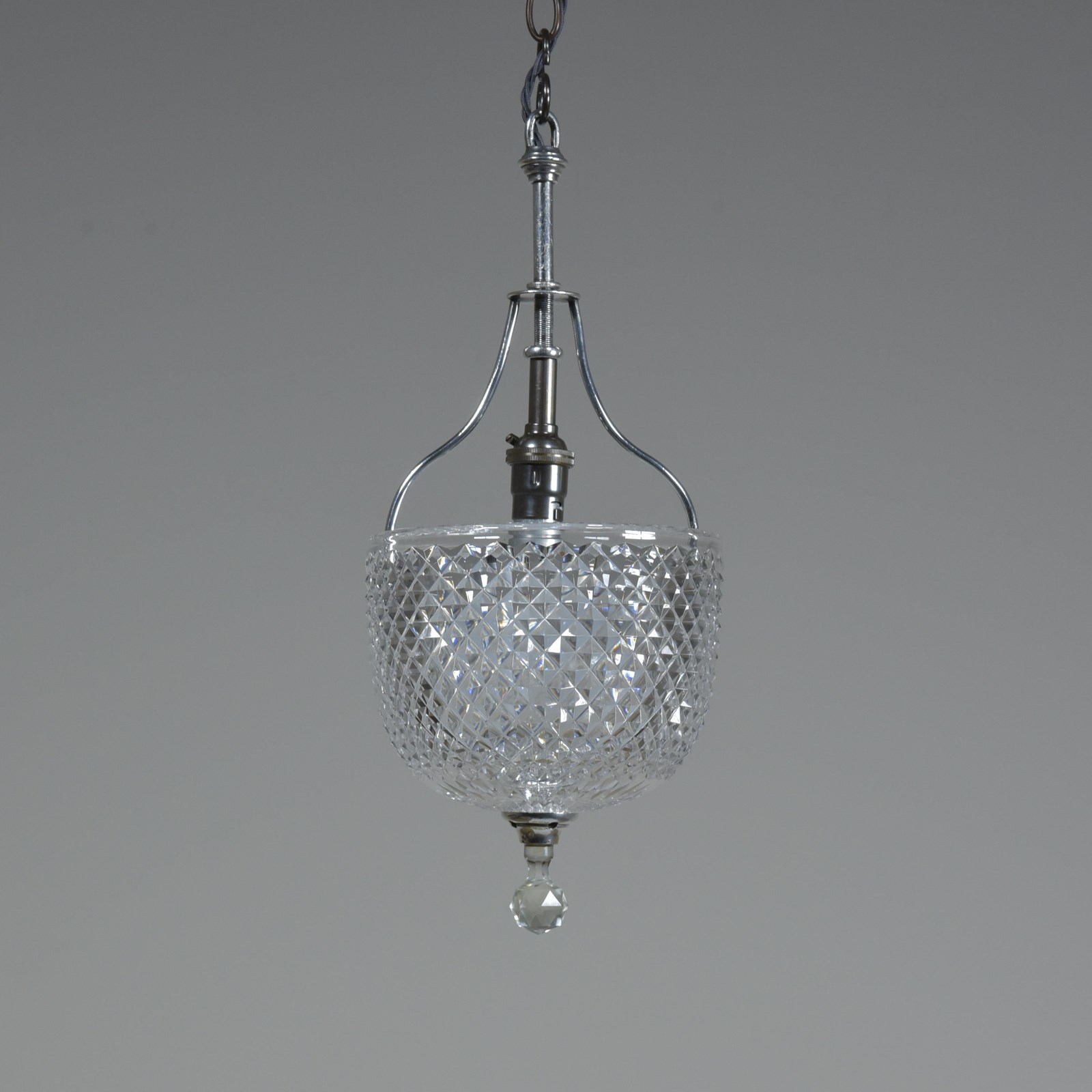 A small silver mounted cut glass hobnail bowl pendant light / lantern with a cut glass finial probably by Osler. Edwardian 1900.