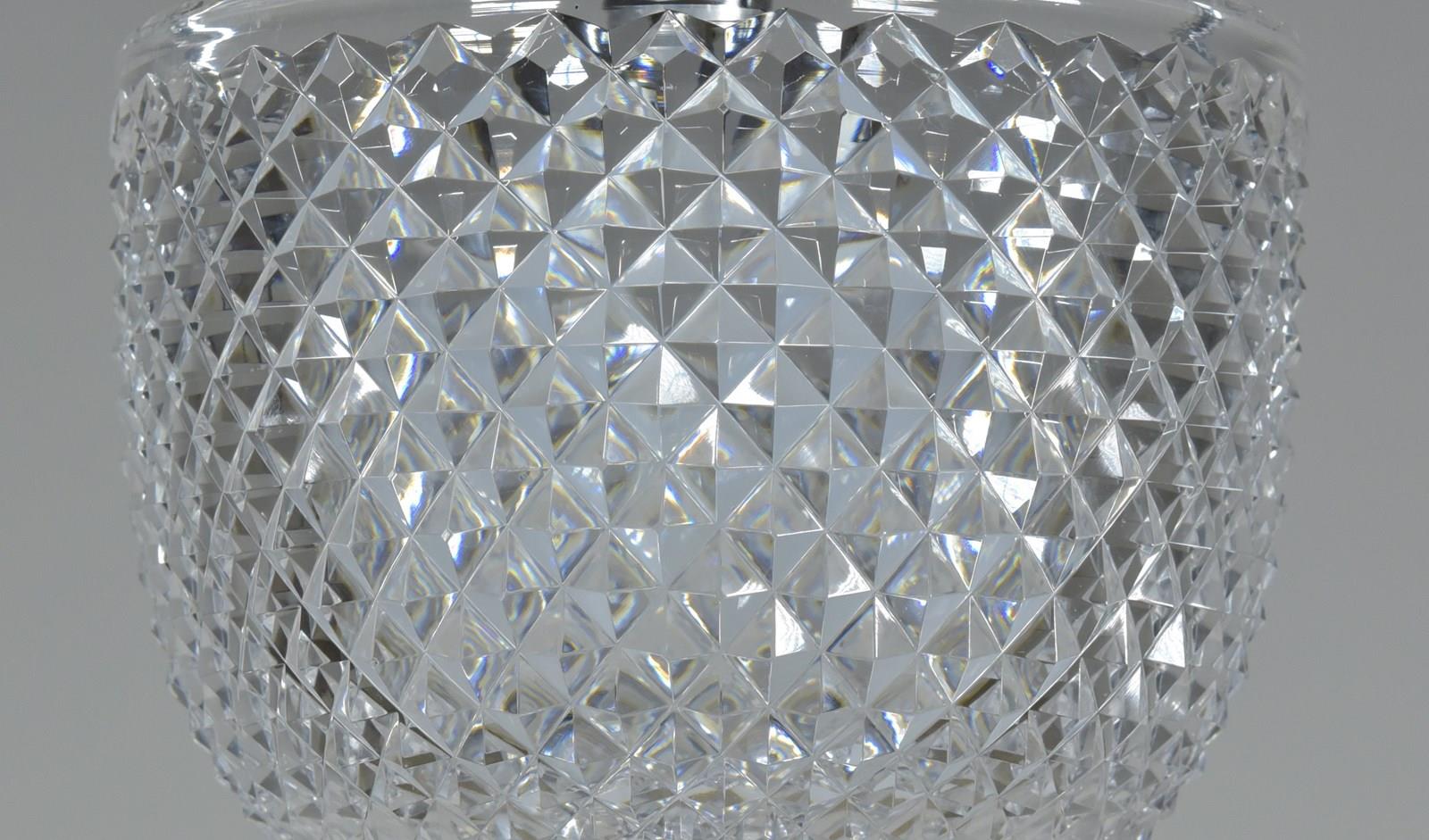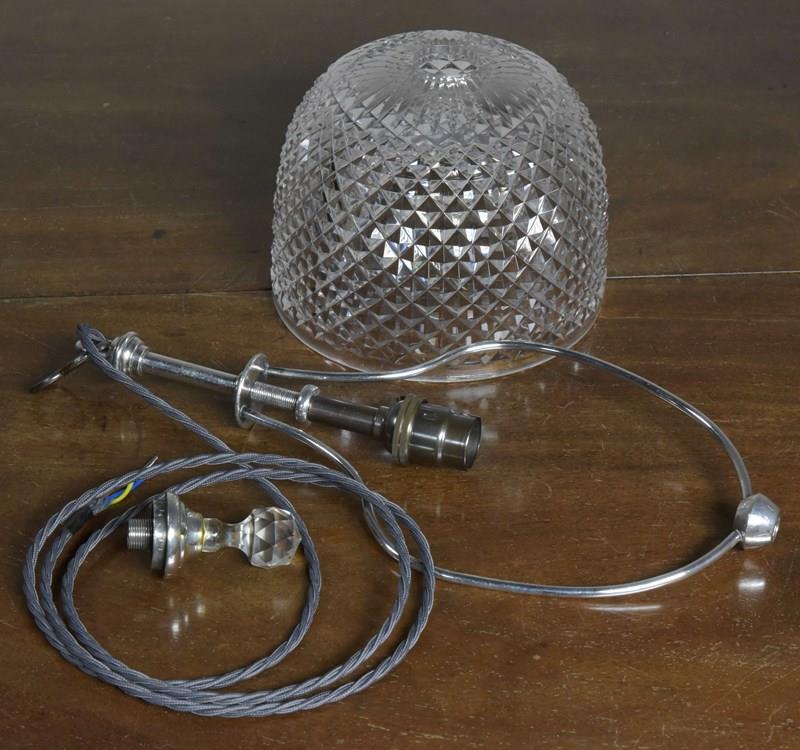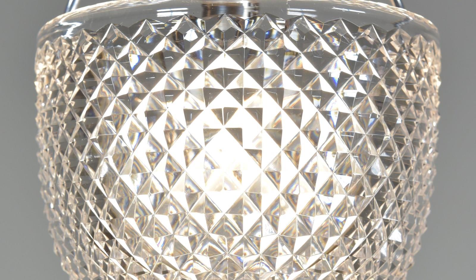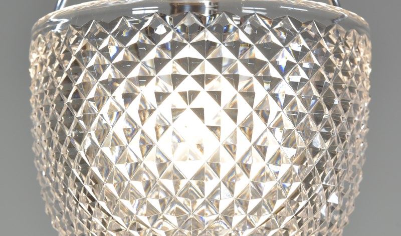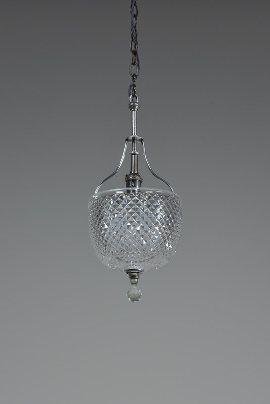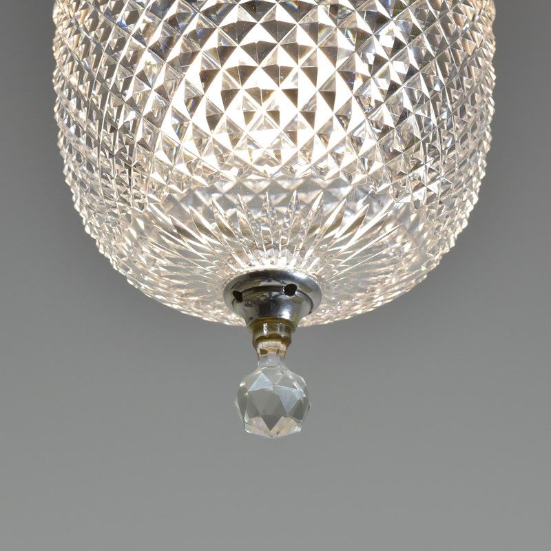 A small silver mounted cut glass hobnail bowl pendant light / lantern with a cut glass finial probably by Osler. Edwardian 1900.
