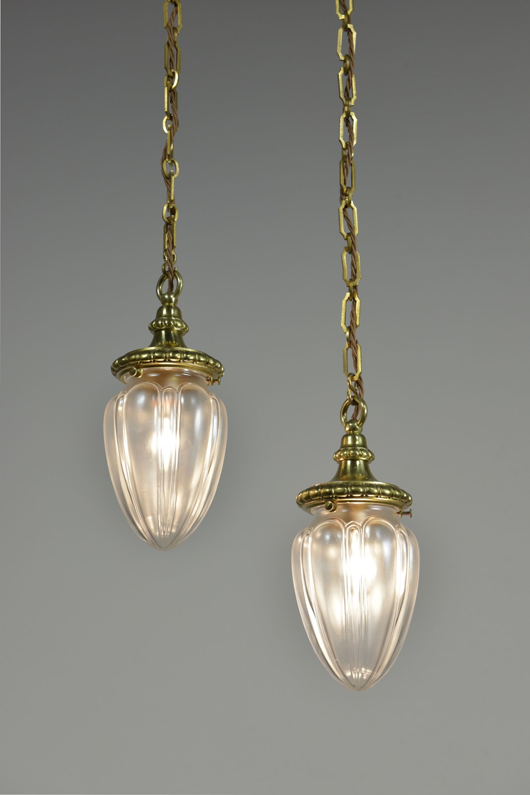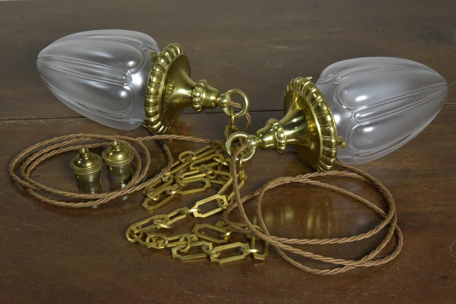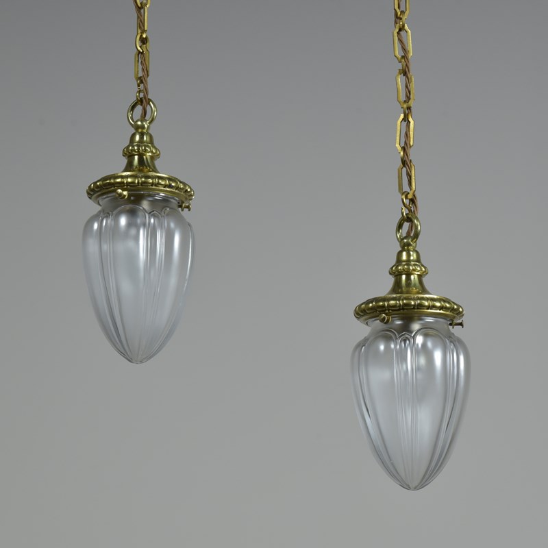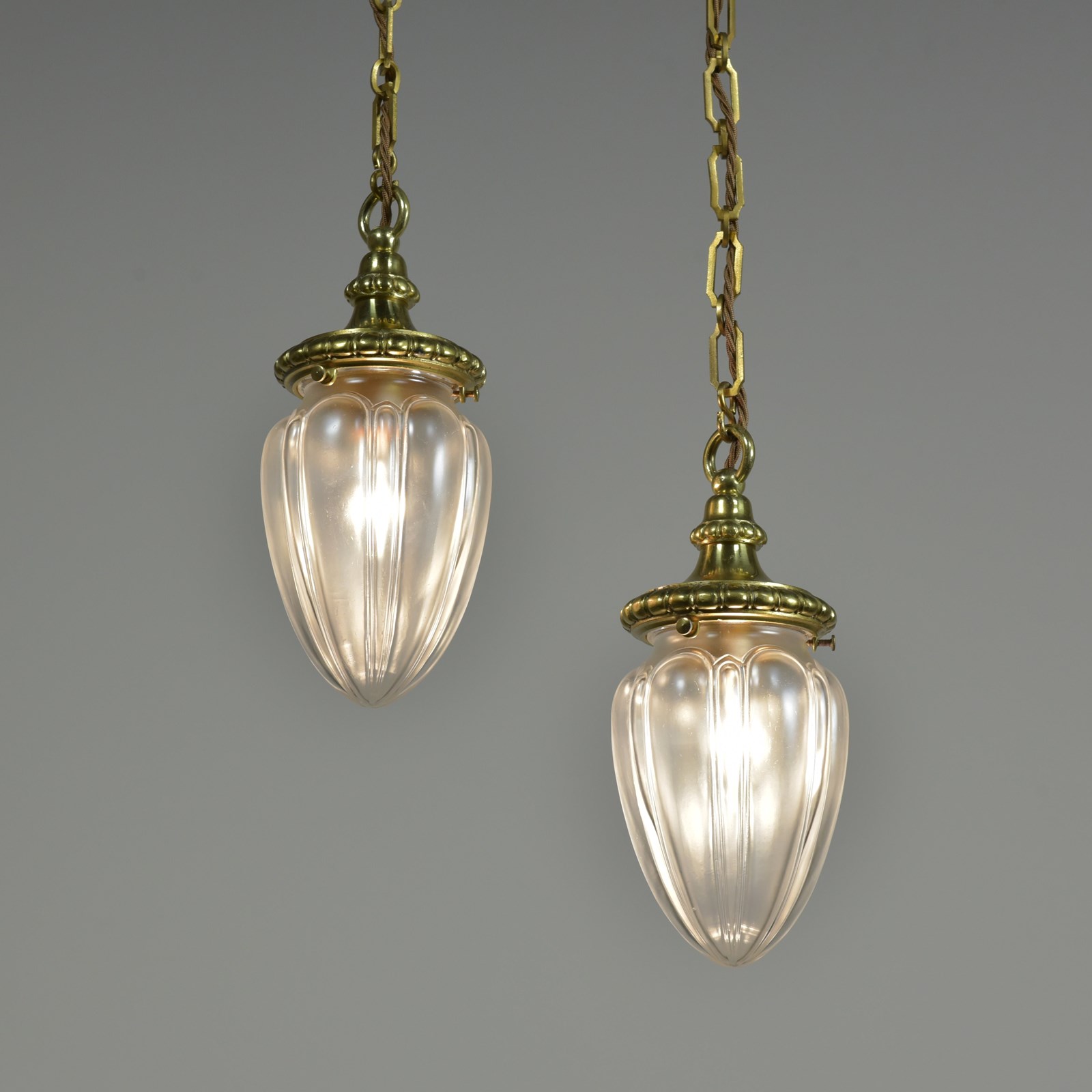 An antique pair of moulded satin etched art nouveau lobed shade pendant lights with their original cast gilt brass gadrooned looped galleries and cut oblong linked chain. English 1910-20.