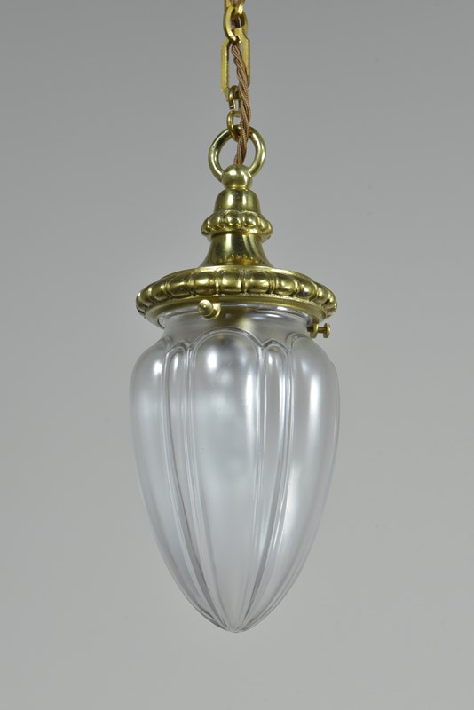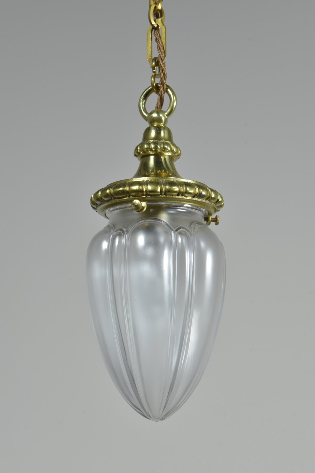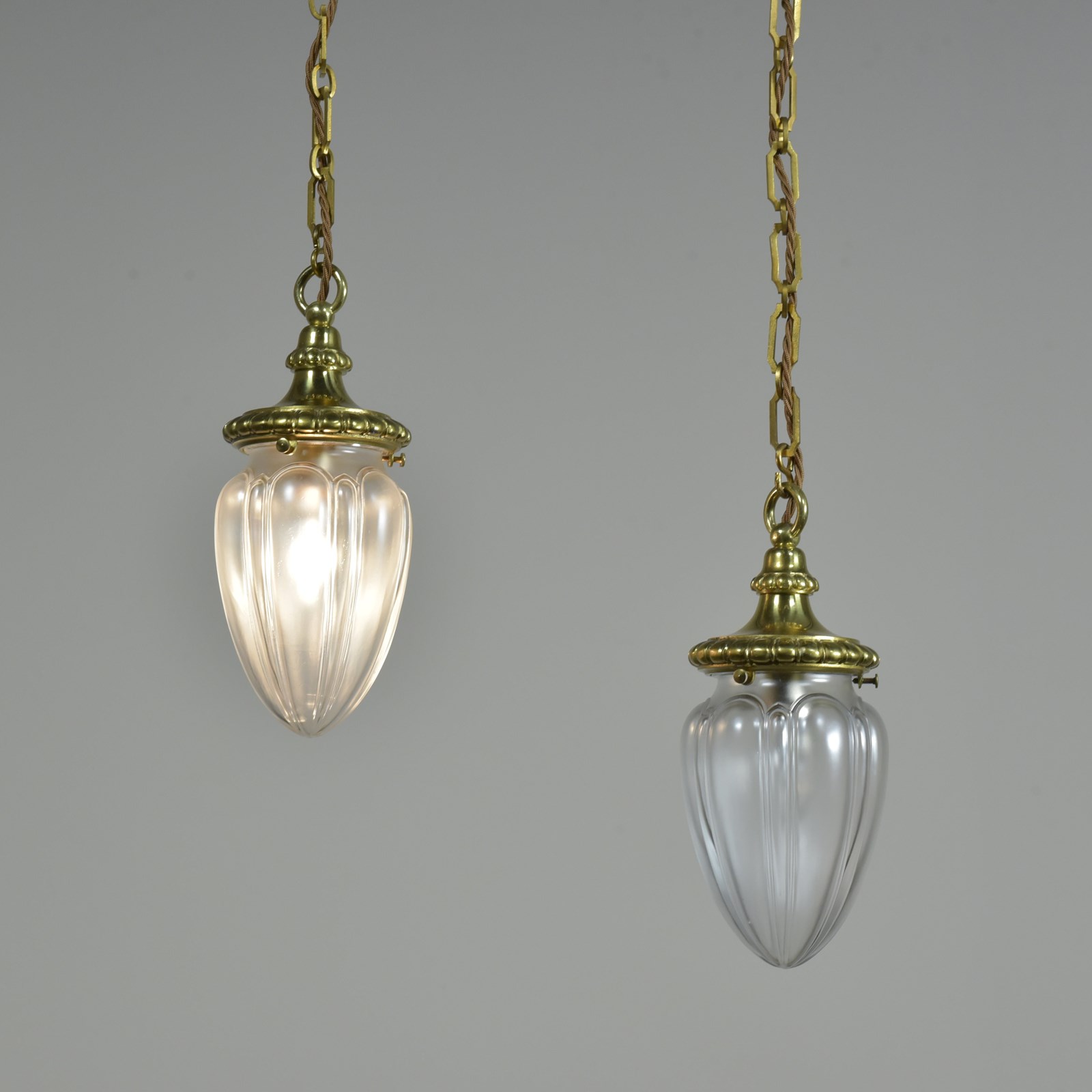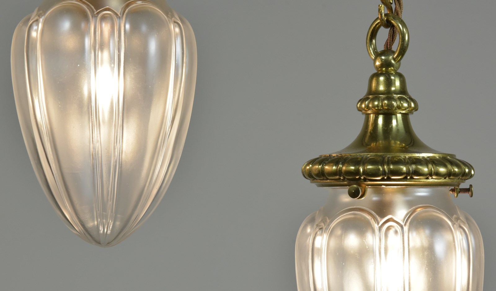An antique pair of moulded satin etched art nouveau lobed shade pendant lights with their original cast gilt brass gadrooned looped galleries and cut oblong linked chain. English 1910-20.
