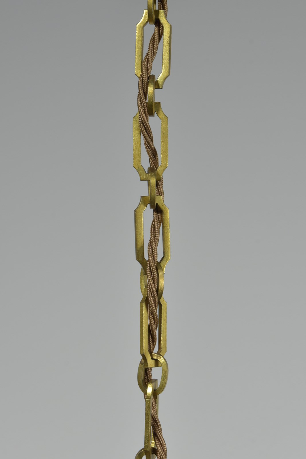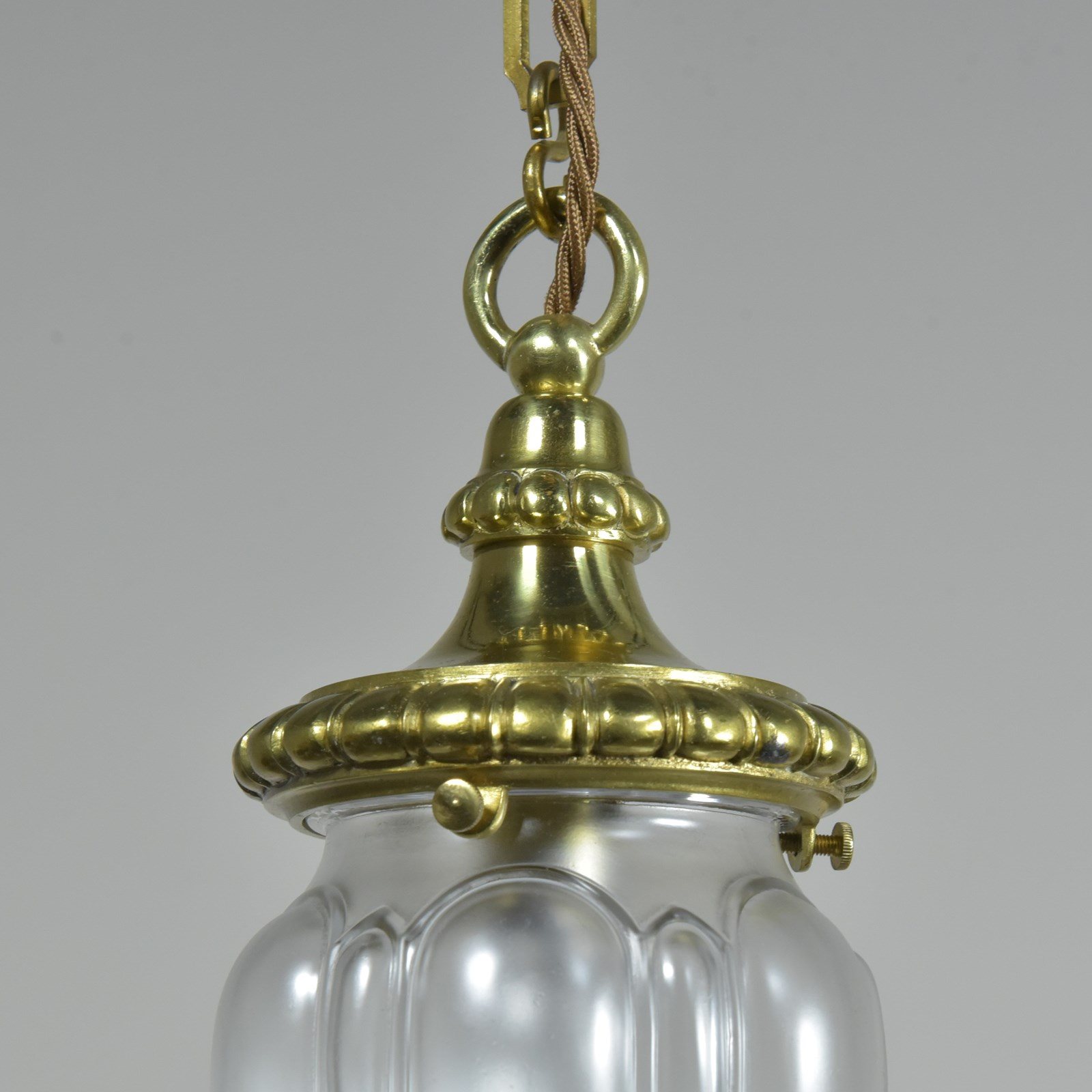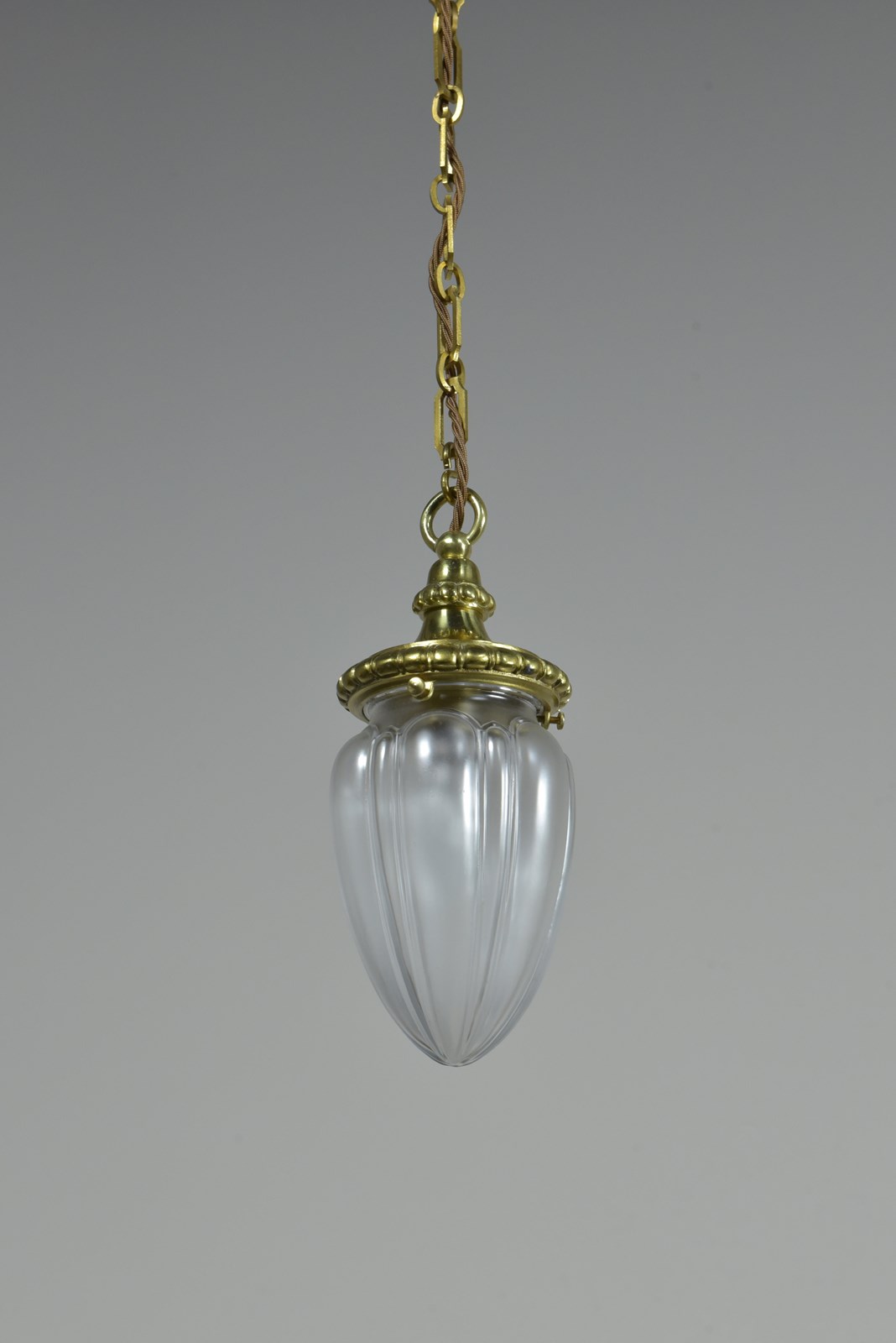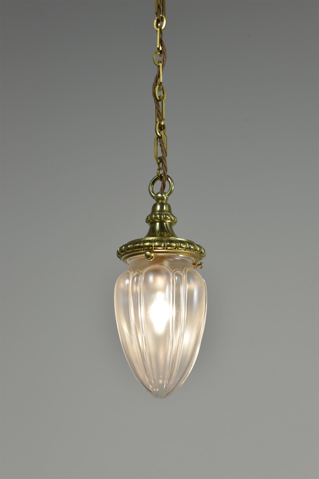 An antique pair of moulded satin etched art nouveau lobed shade pendant lights with their original cast gilt brass gadrooned looped galleries and cut oblong linked chain. English 1910-20.