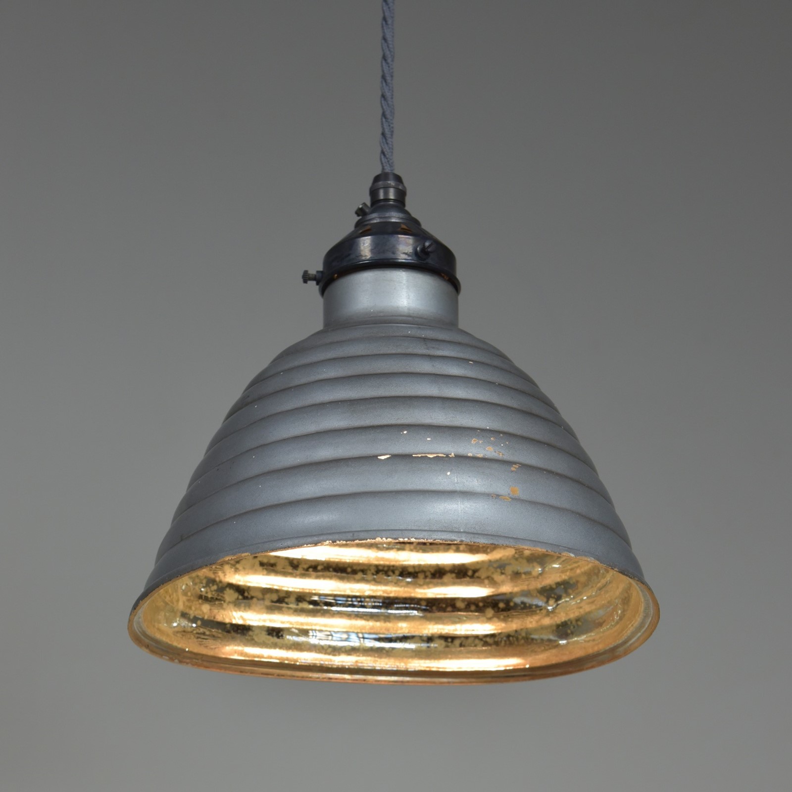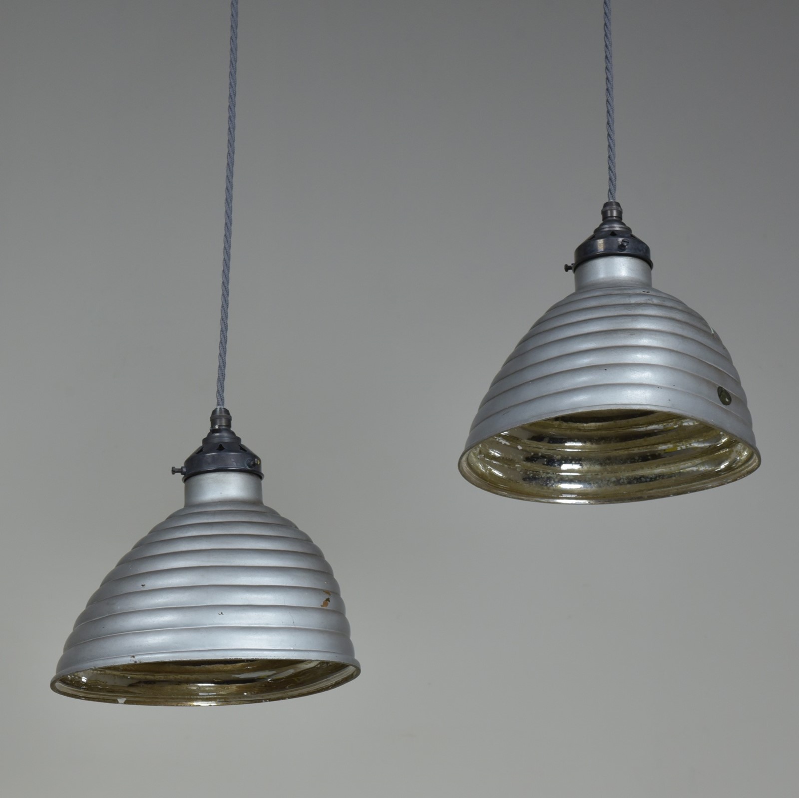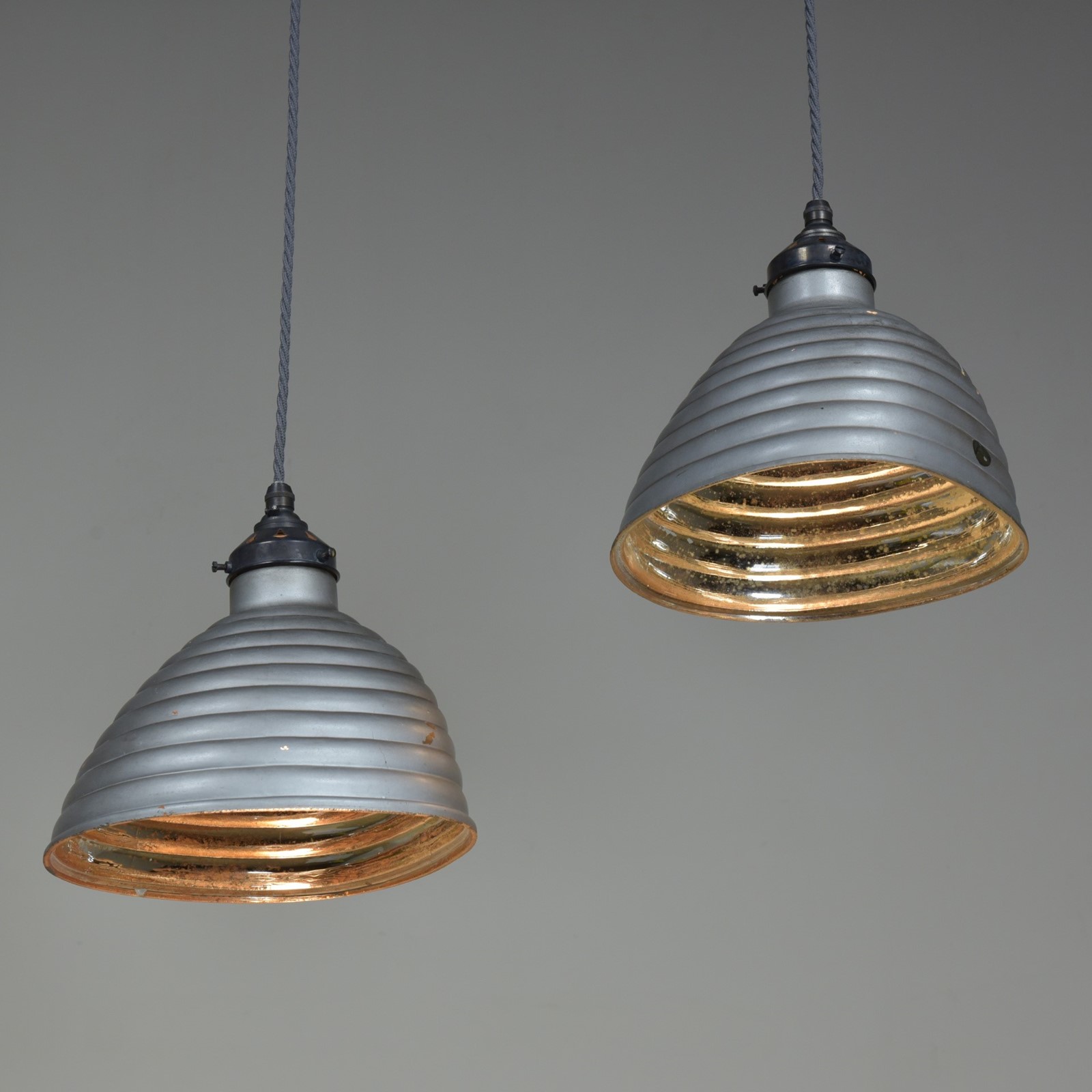 A pair of antique beehive silvered / mirrored asymmetric shaped pendant light shades c1930. In good condition with some tarnishing to the silvering, the outer silver grey paint and copper layers sound with very minor losses.They have oval makers labels attached. They have been cleaned and rewired with bronzed brass galleries and cordgripped lampholders (new, British made) and 1.25 meters "dusty" grety fabric flex. Priced for the pair. Dimensions in inches/cm; Shades max 9"/23cm x 9.25"/23.5cm width / depth 8.5"/21.5cm tall to top of cord grip.