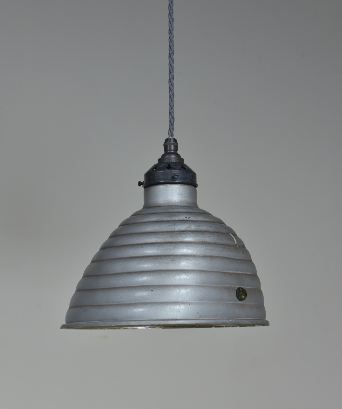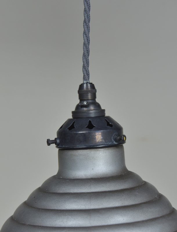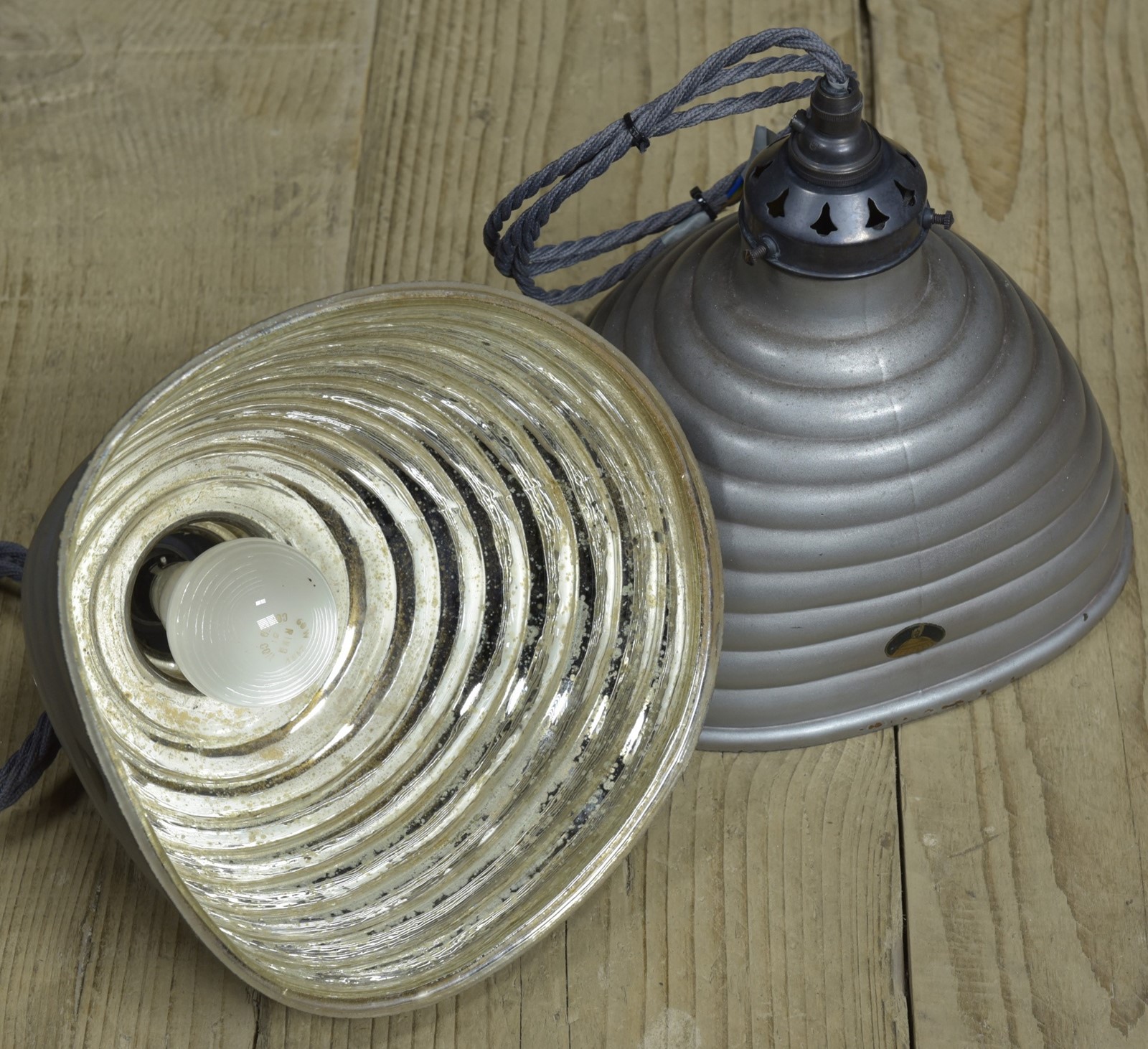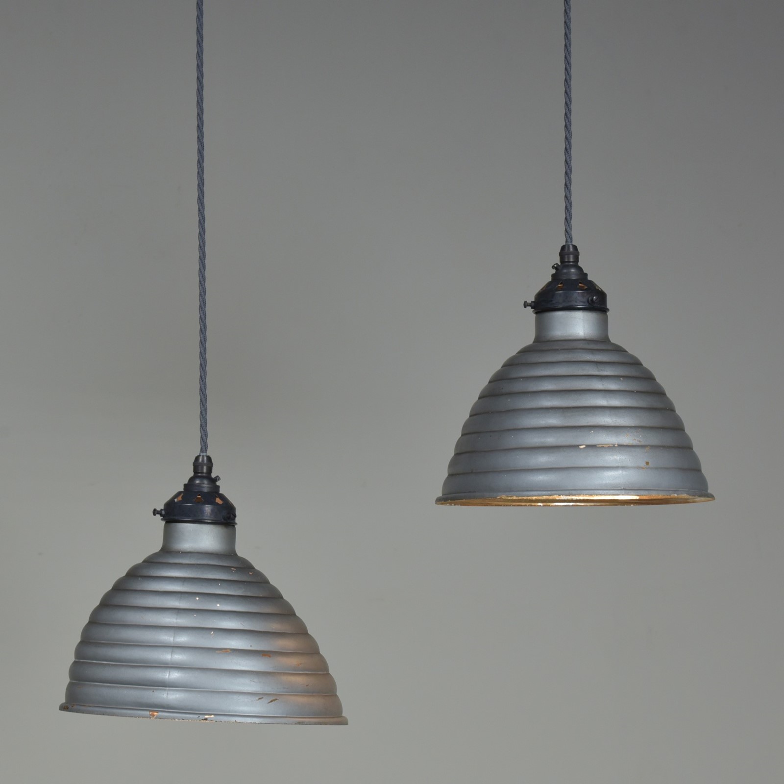 A pair of antique beehive silvered / mirrored asymmetric shaped pendant light shades c1930. In good condition with some tarnishing to the silvering, the outer silver grey paint and copper layers sound with very minor losses.They have oval makers labels attached. They have been cleaned and rewired with bronzed brass galleries and cordgripped lampholders (new, British made) and 1.25 meters "dusty" grety fabric flex. Priced for the pair. Dimensions in inches/cm; Shades max 9"/23cm x 9.25"/23.5cm width / depth 8.5"/21.5cm tall to top of cord grip.