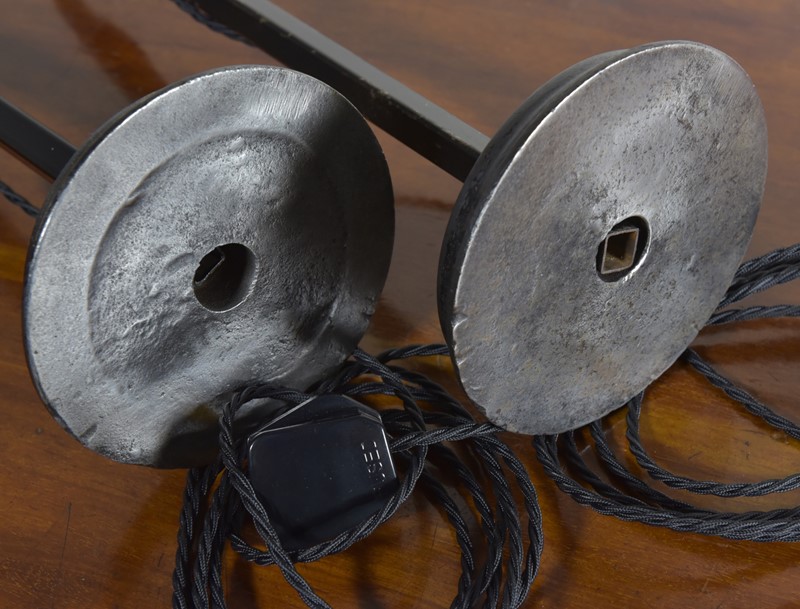 A good pair of antique task / desk / work lamps with flexible upper brass necks attached to square steel stems supported on circular moulded iron bases, paired with similar period large nickel plated brass scalloped edged clam shell shades.Cast brass fittings. English early 20th century. The original switched lampholders, and shades, attach to the flexible neck with an adjustable joint. In excellent condition; every part has been cleaned and polished whilst retaining the original black paint. Clear waxed for protection. Rewired with 3 meters (exposed) black fabric flex and new hard plastic plugs.