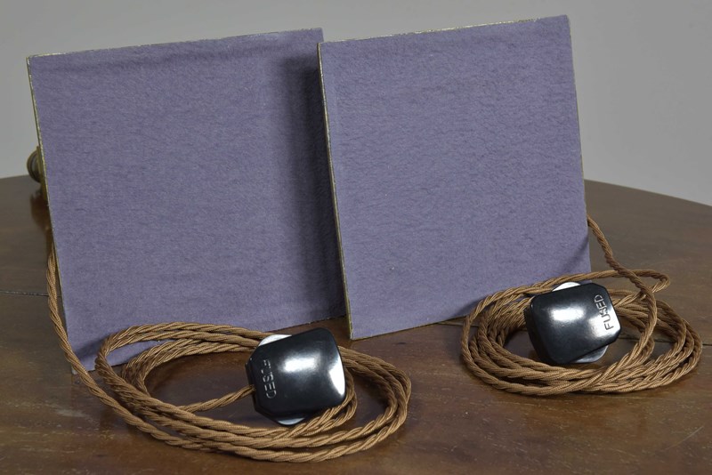Rewired with 3m fabric flex, patinated safety-switched lampholders, 3amp traditional phenolic plug. Original grommets / guides to bases. New quality fabric to bases. Pat tested.