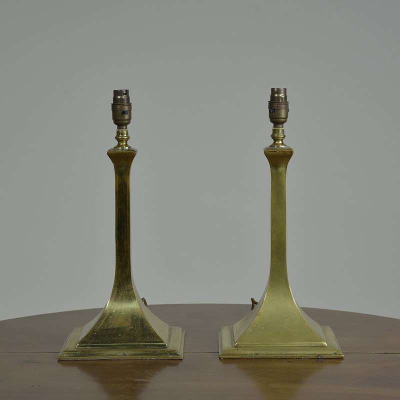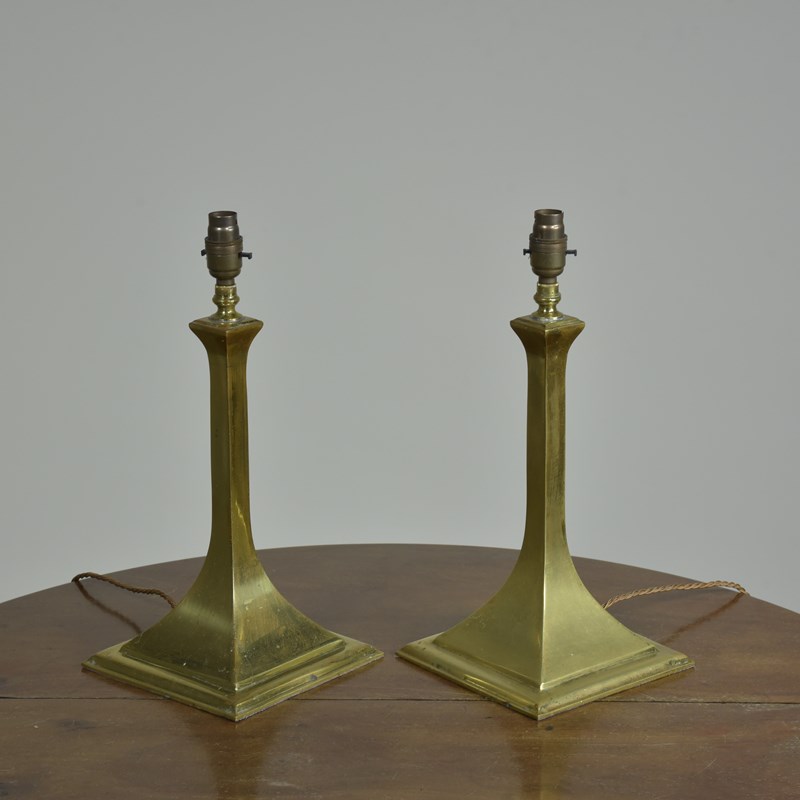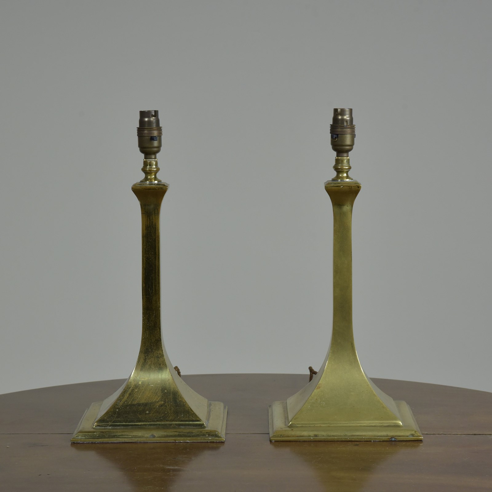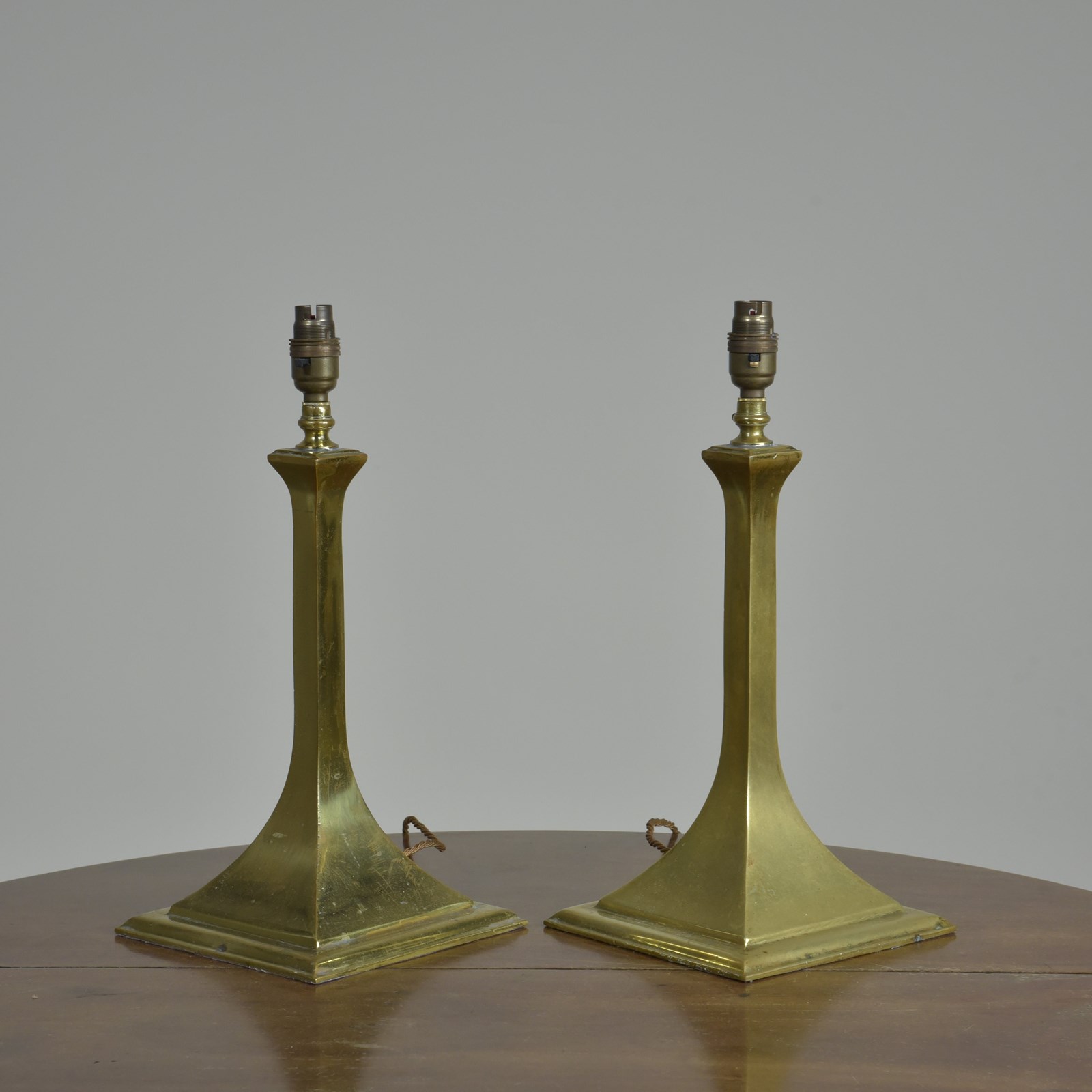 An antique pair of cast brass table lamps with square shafts and spreading concave pyramidal bases. English, approx. 1920s-30s.