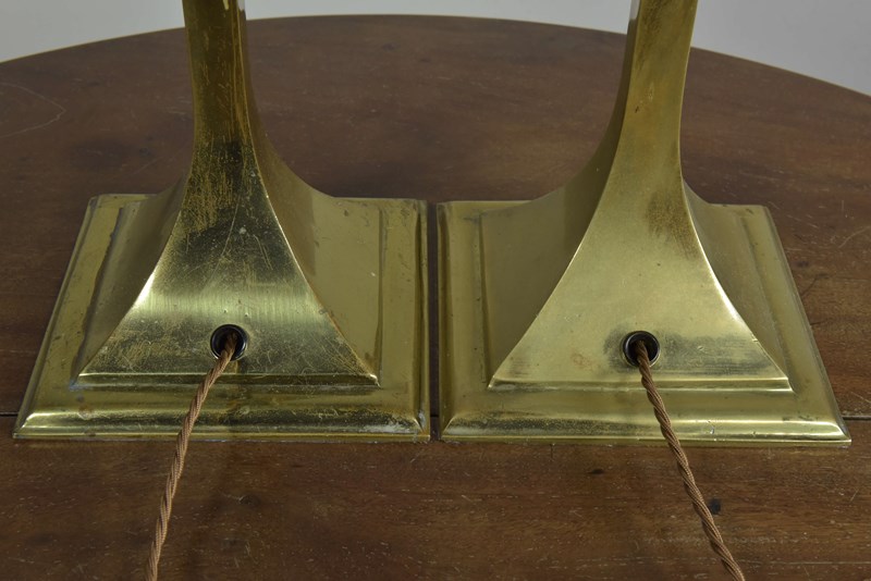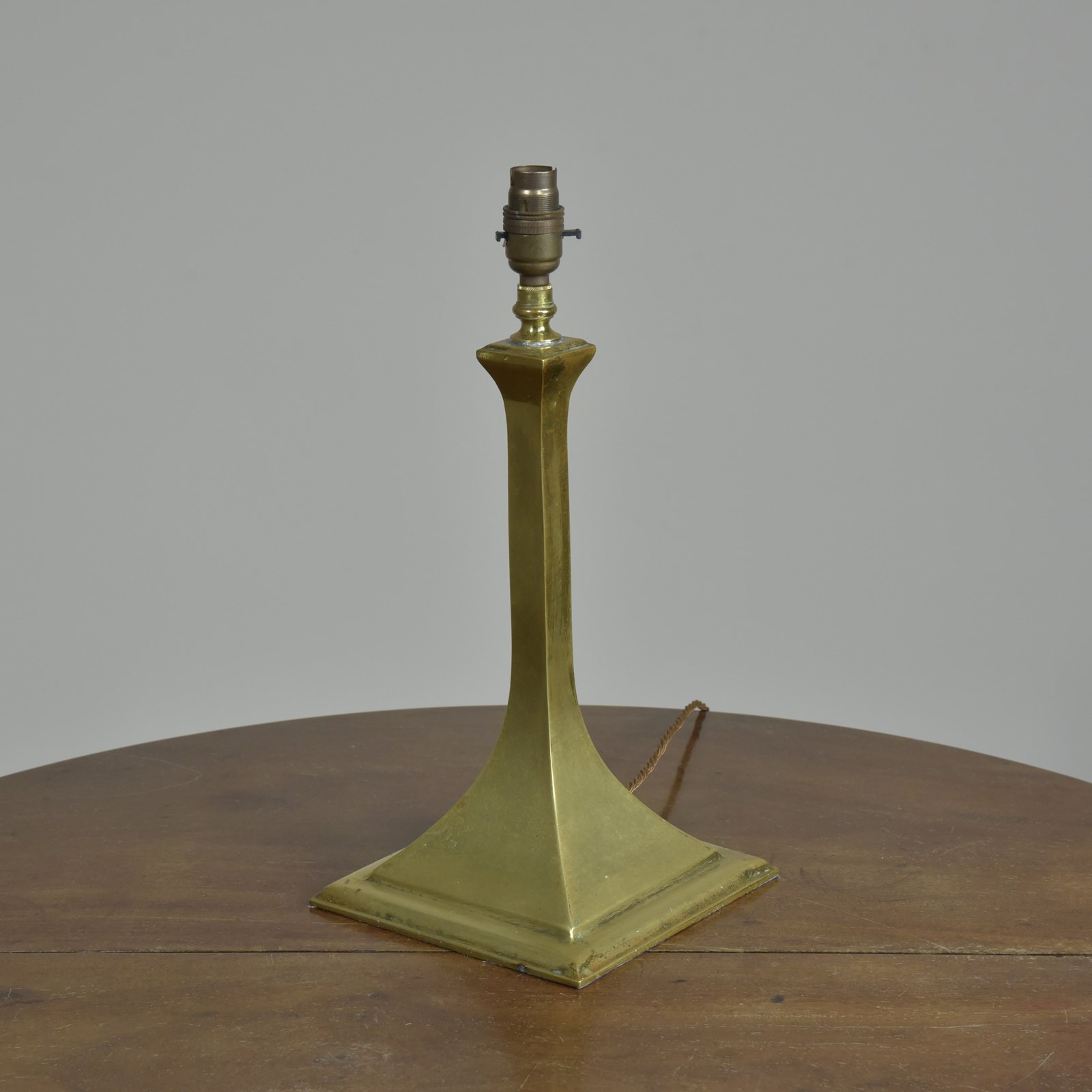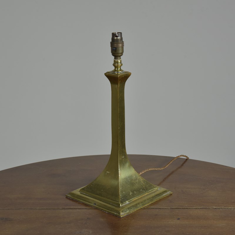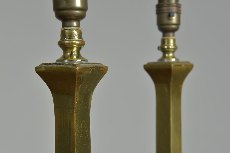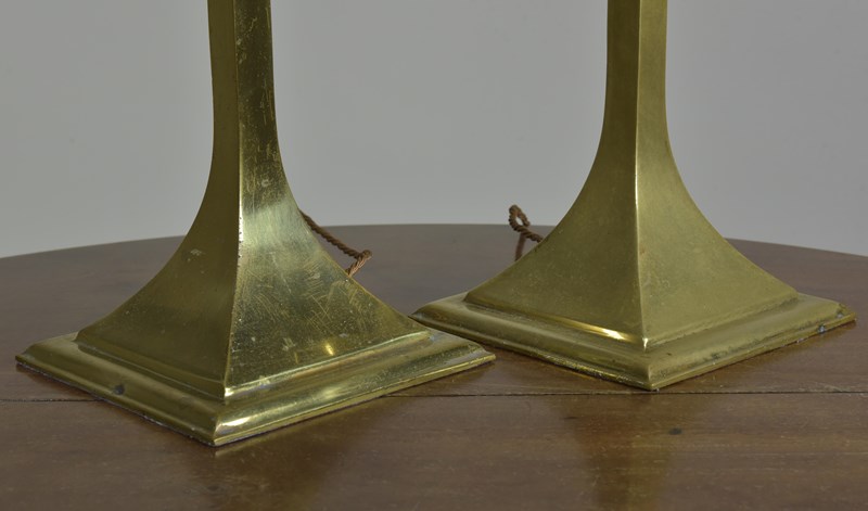An antique pair of cast brass table lamps with square shafts and spreading concave pyramidal bases. English, approx. 1920s-30s.