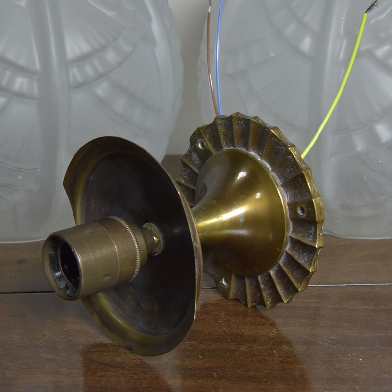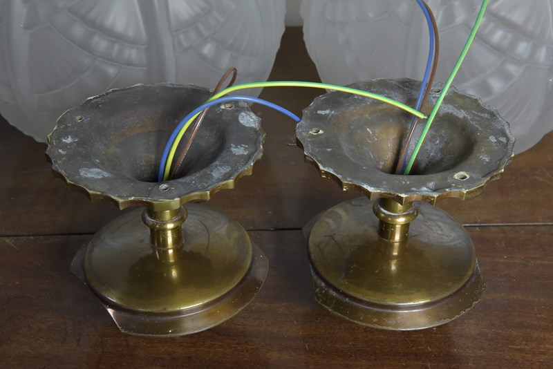 With their original brass cap mounts and cast brass fluted perimeter ceiling plates. It is possible they could be converted to hanging lights to give a longer drop (retaining the ceiling plates/mounts) using chain (or brass tube).