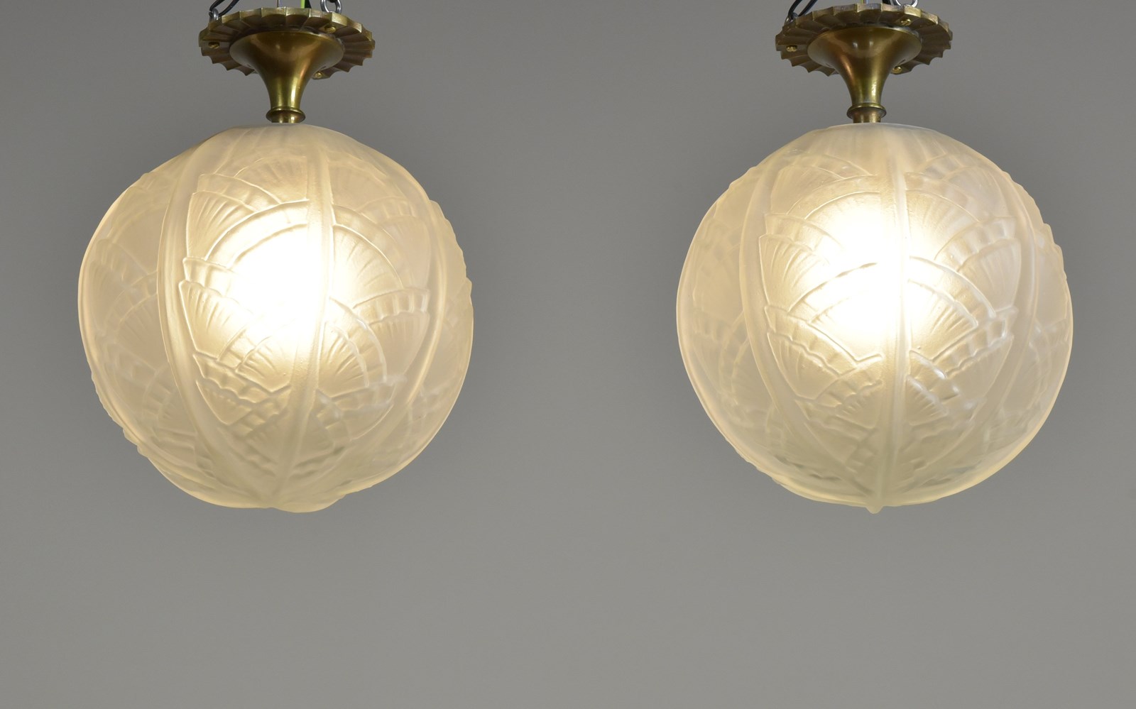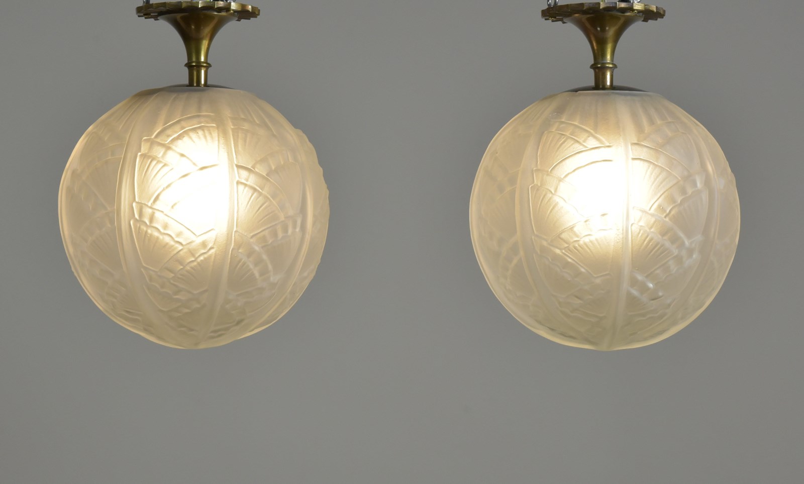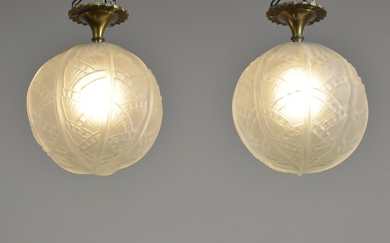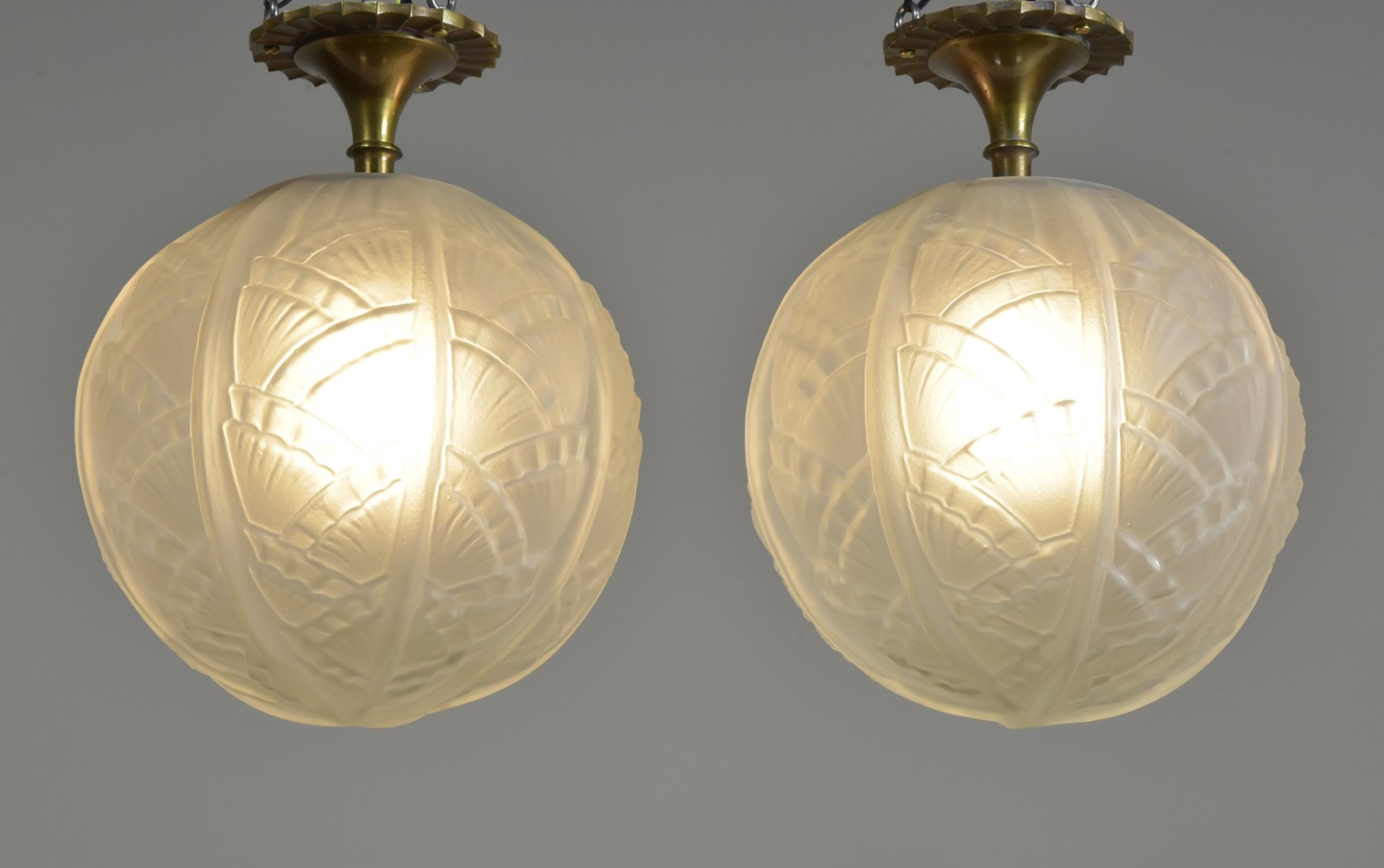 A pair of satin etched moulded glass globes the overlapping fan/shell design segments divided by ribs. French, c1930.