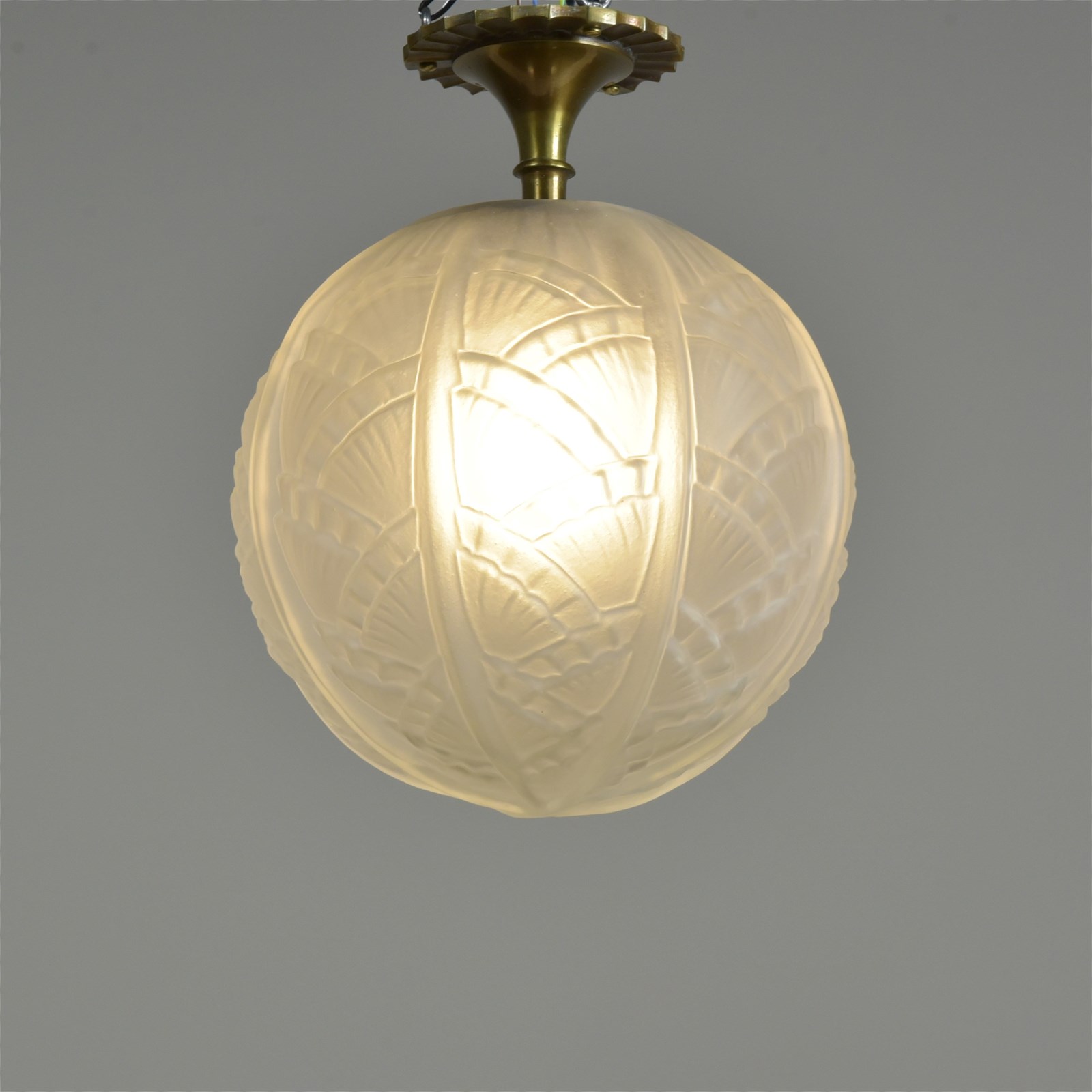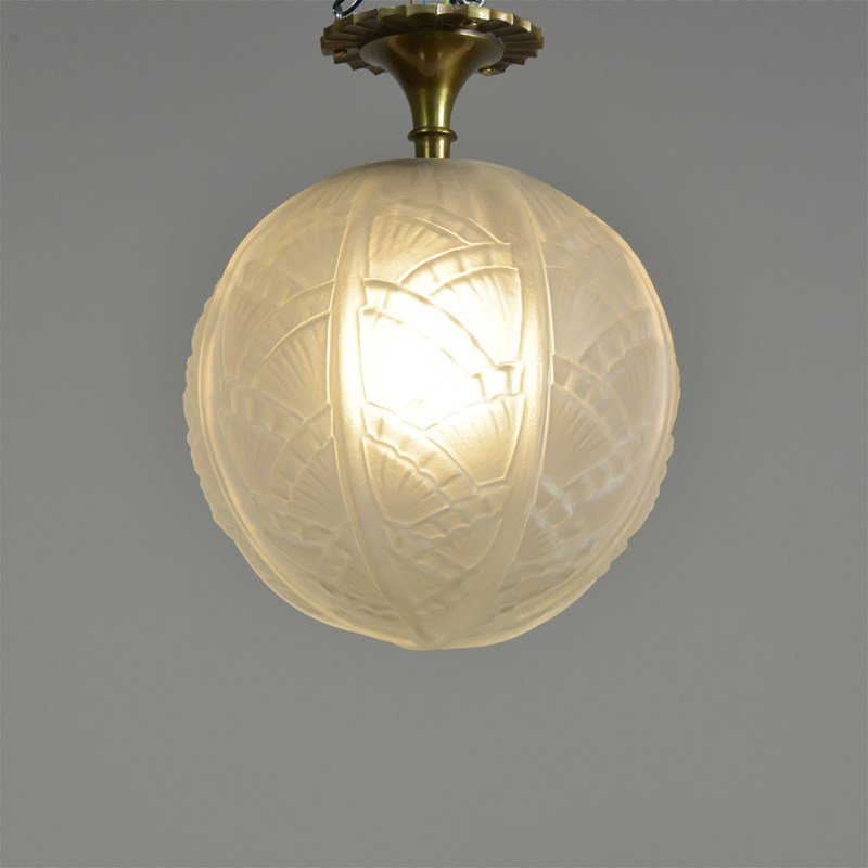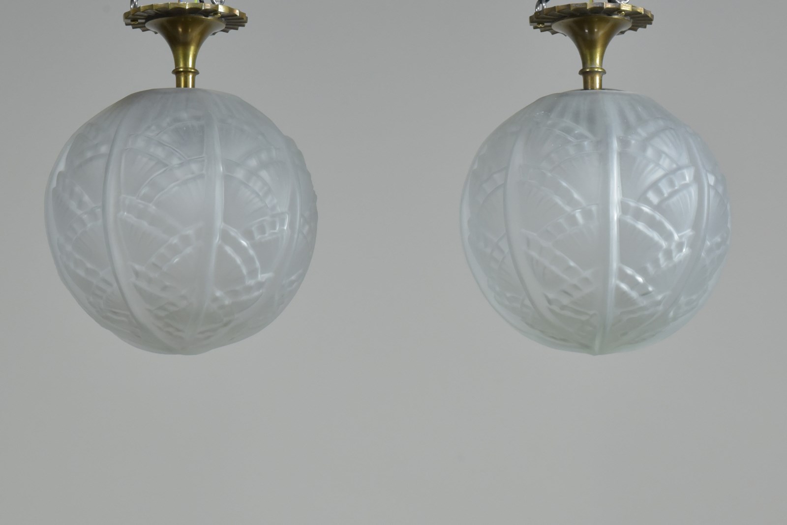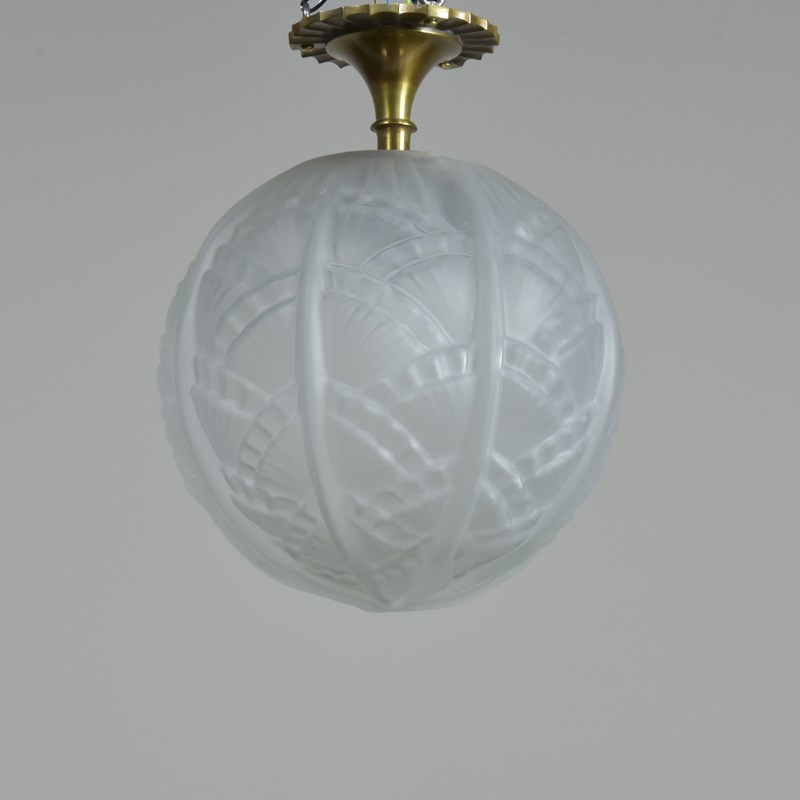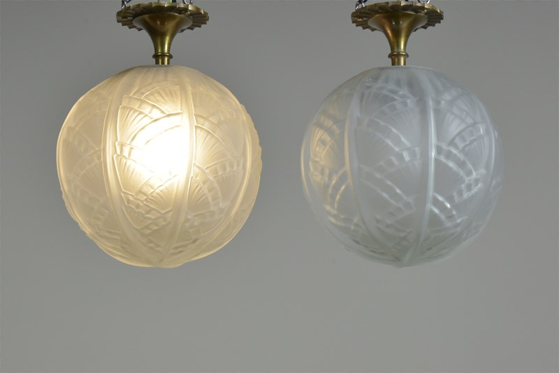 A pair of satin etched moulded glass globes the overlapping fan/shell design segments divided by ribs. French, c1930.