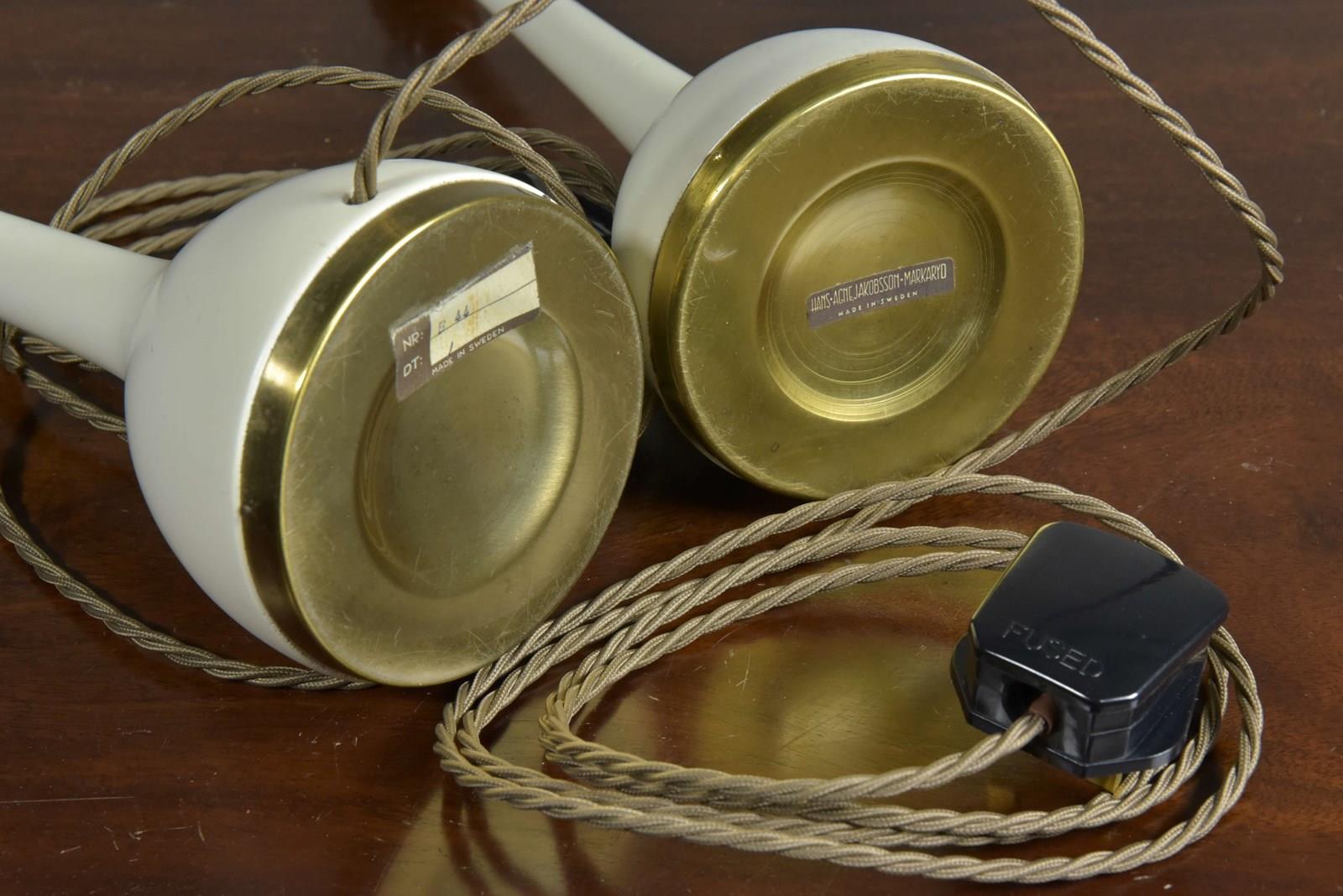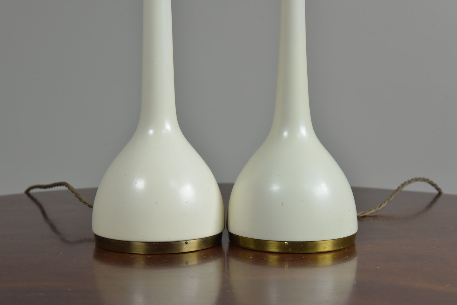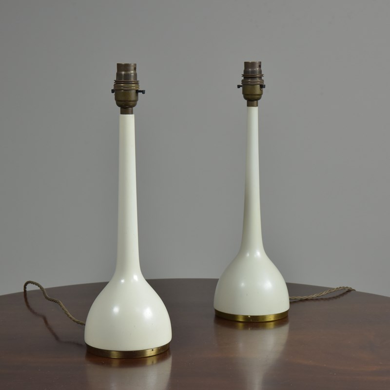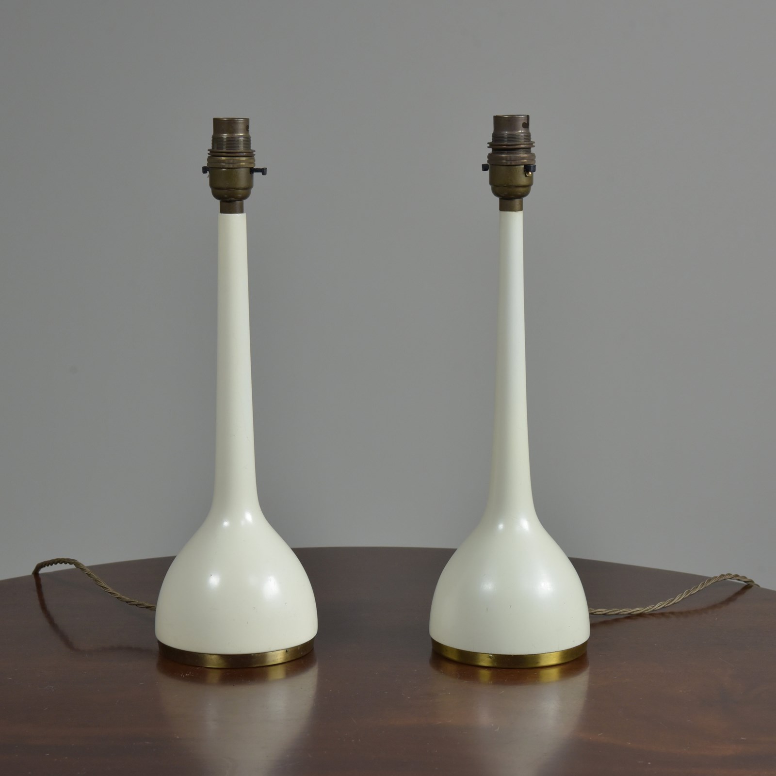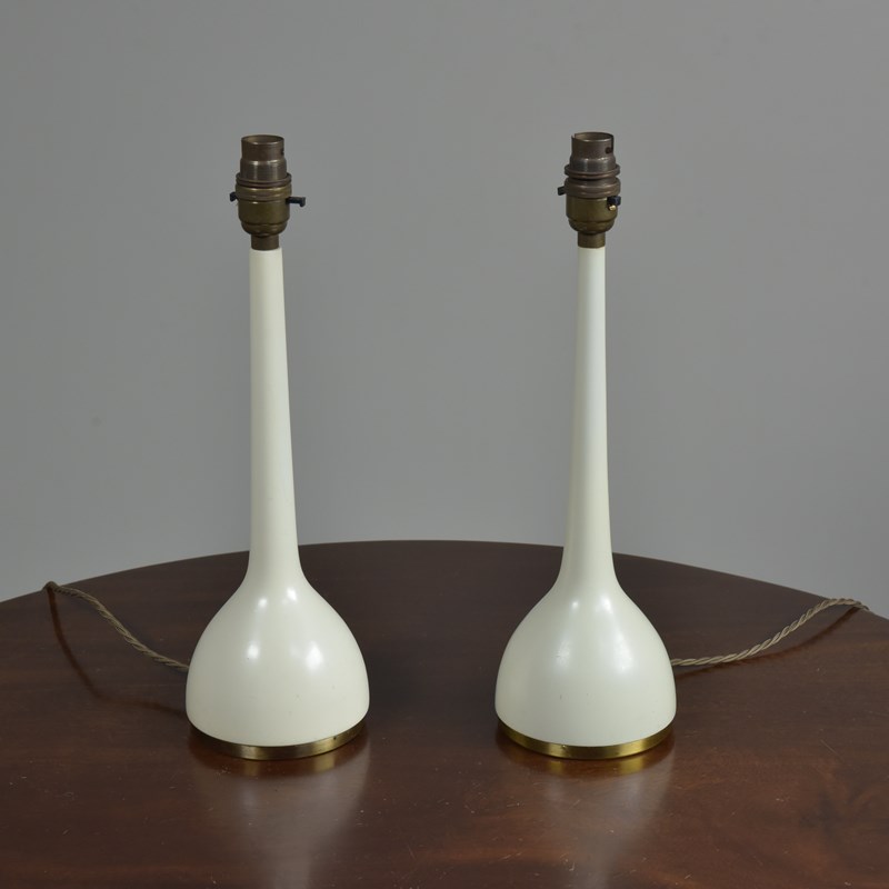 A fine pair of 1960s table lamps by Hans Agne Jakobsson (for Markaryd, Sweden, model B44) made from turned and painted beech (original ivory paint) with brass "tray" bases. This pair in great order (few tiny paint marks) and both with original labels to the bases.