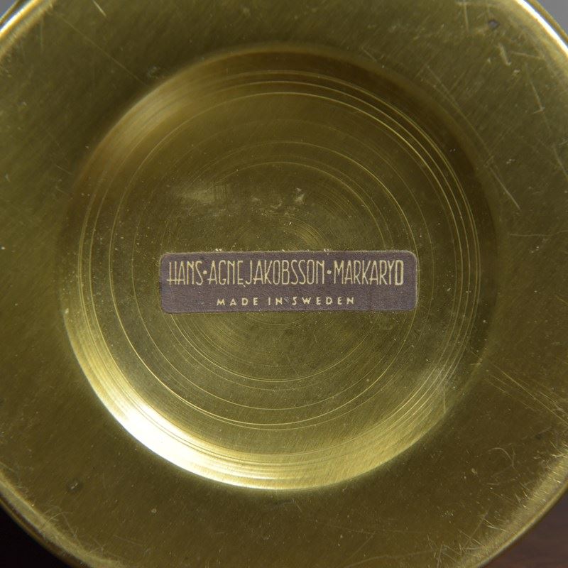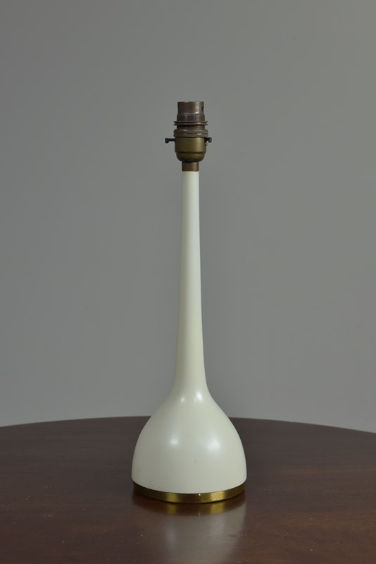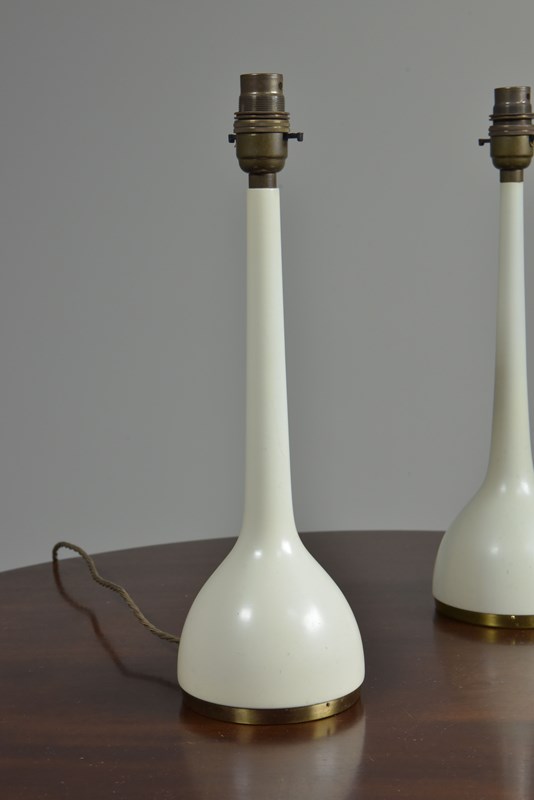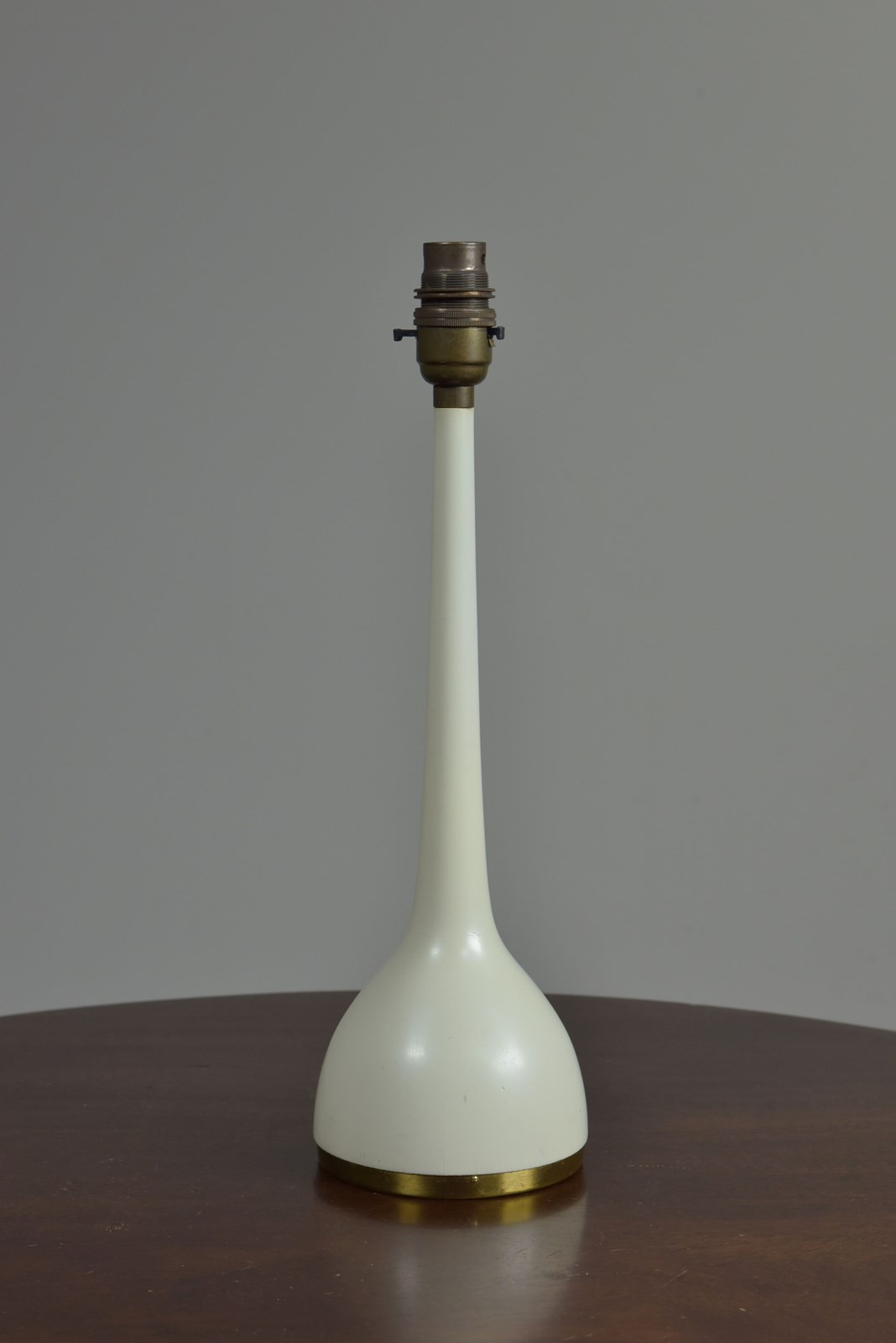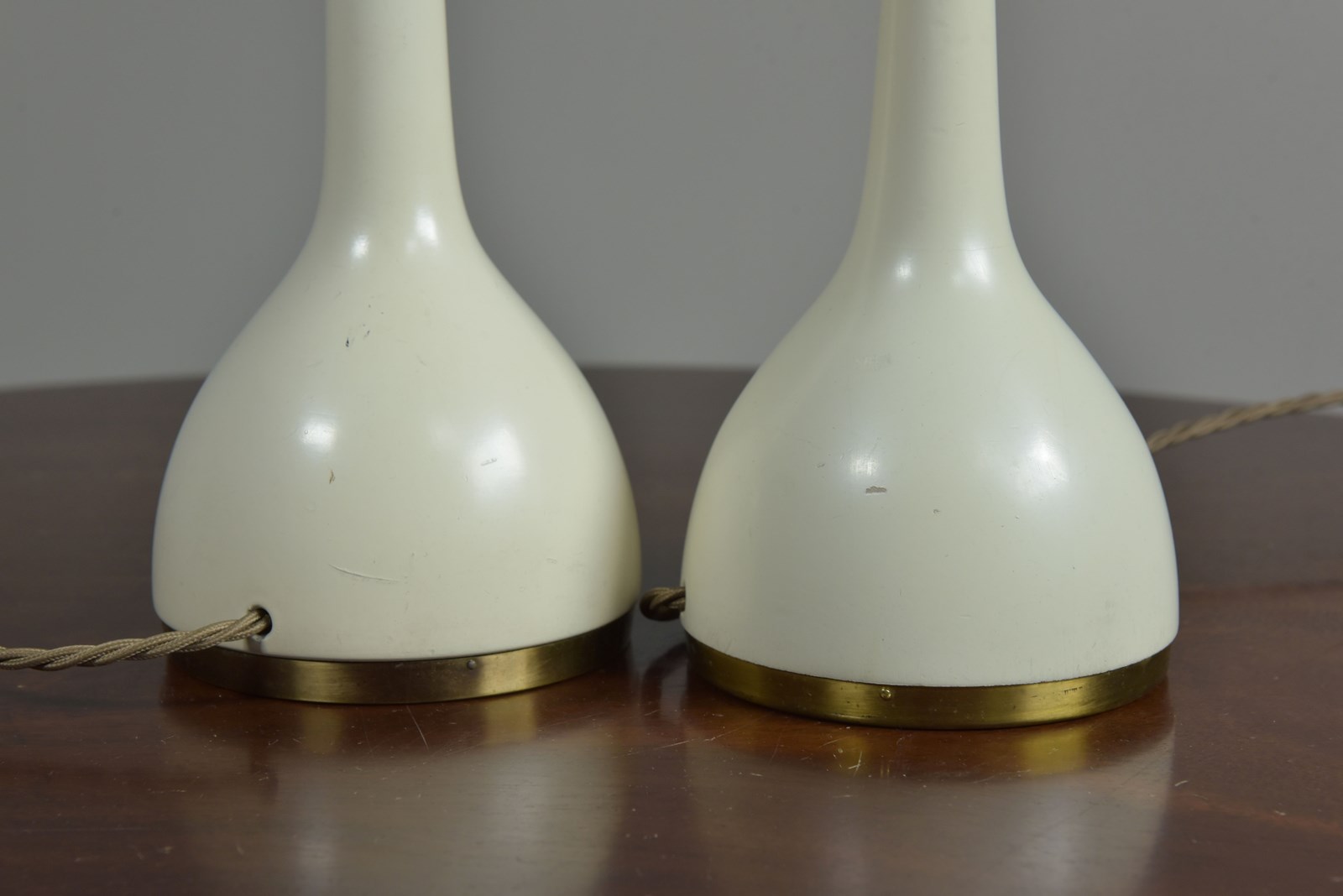 A fine pair of 1960s table lamps by Hans Agne Jakobsson (for Markaryd, Sweden, model B44) made from turned and painted beech (original ivory paint) with brass "tray" bases. This pair in great order (few tiny paint marks) and both with original labels to the bases.