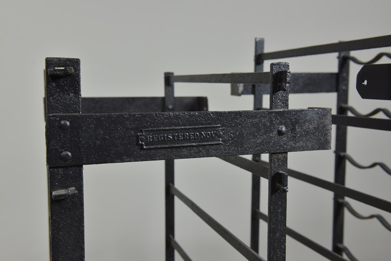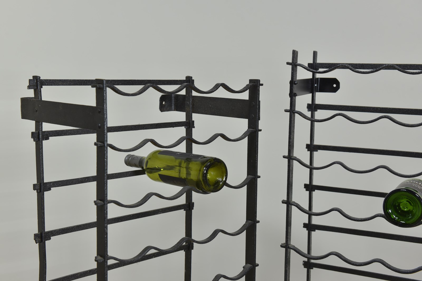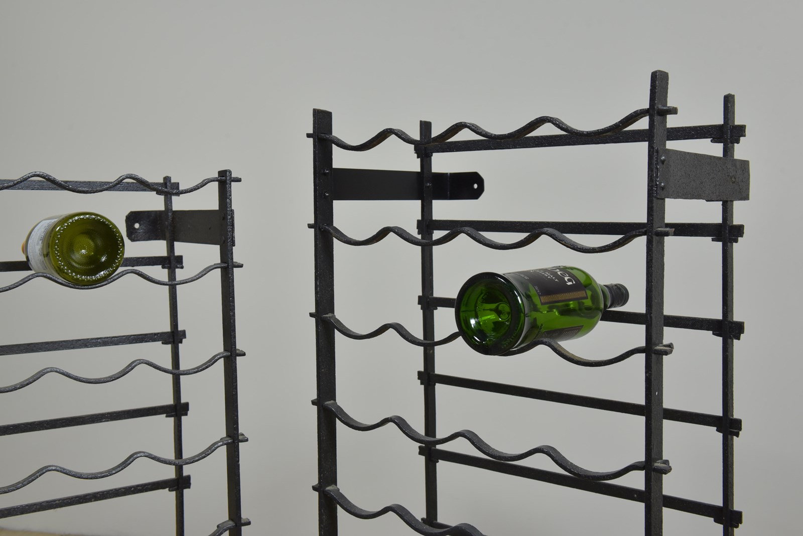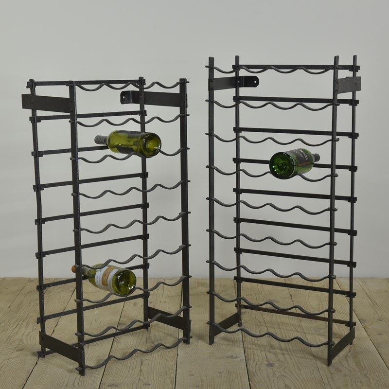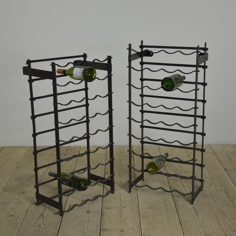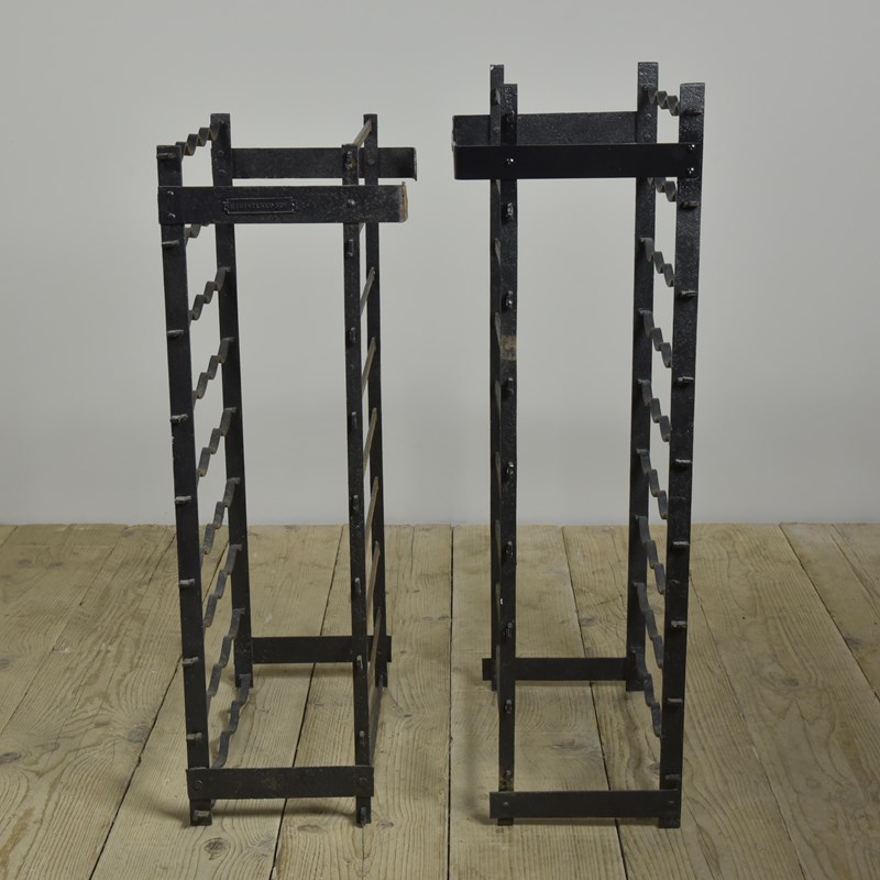 A small near pair of antique iron wine racks of wedged tenon construction. English, 19th century.