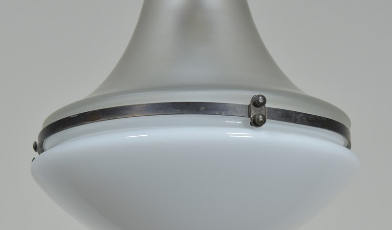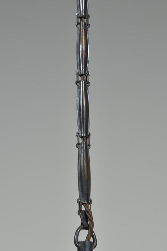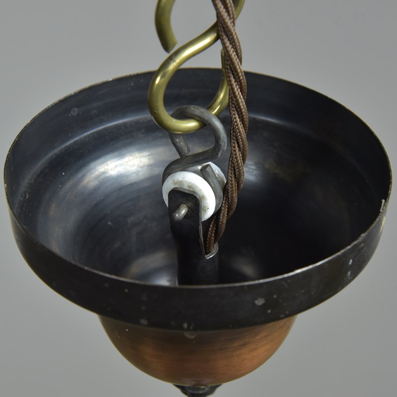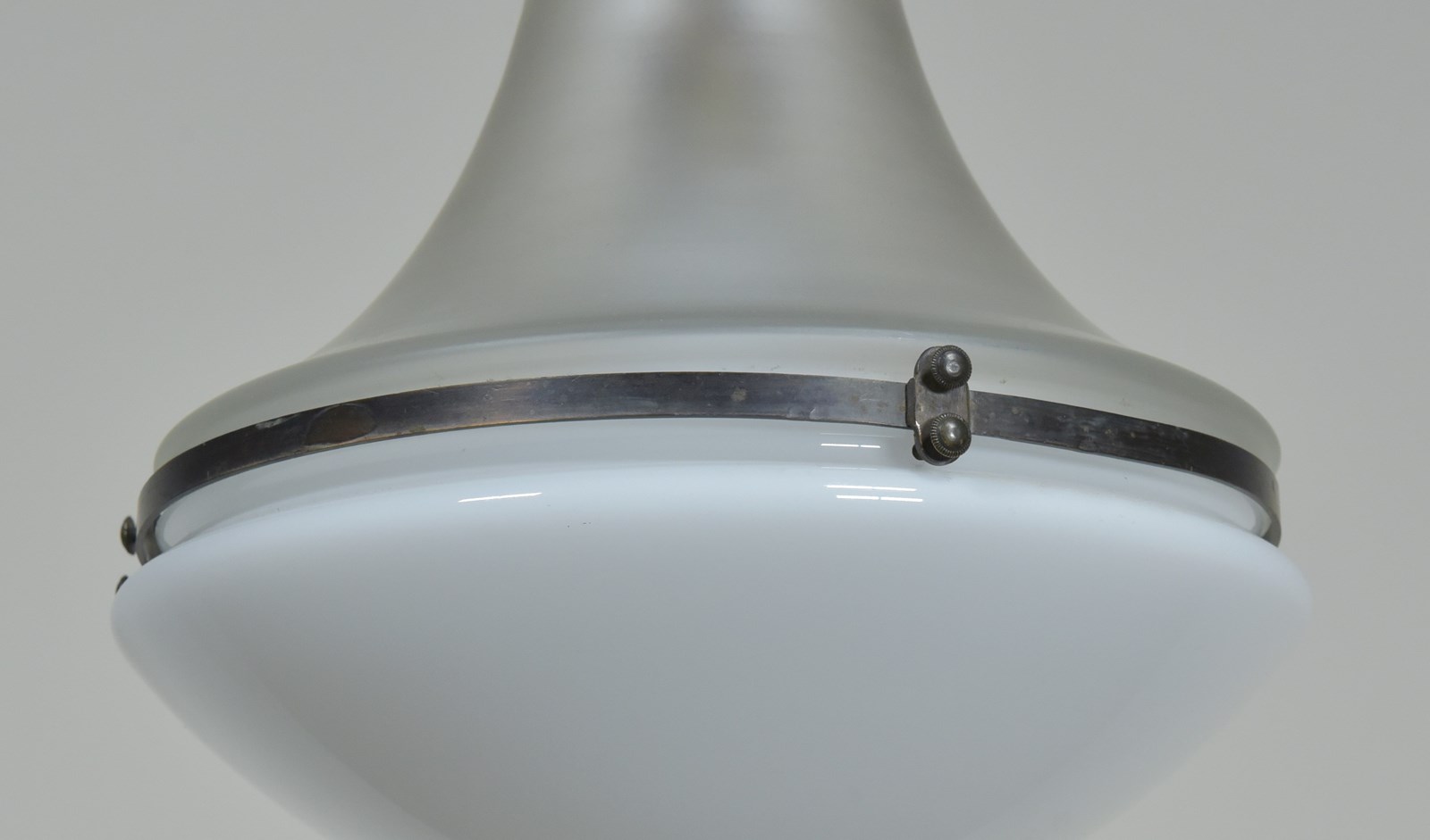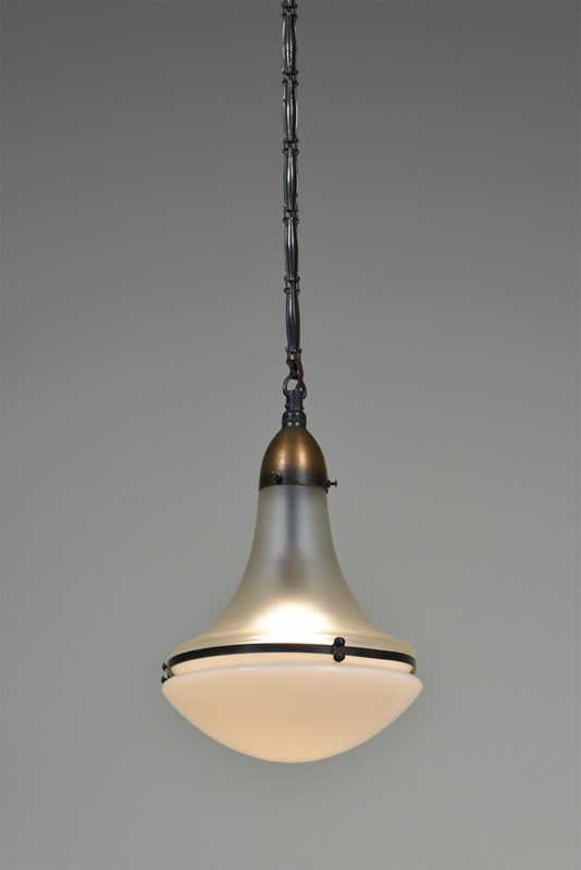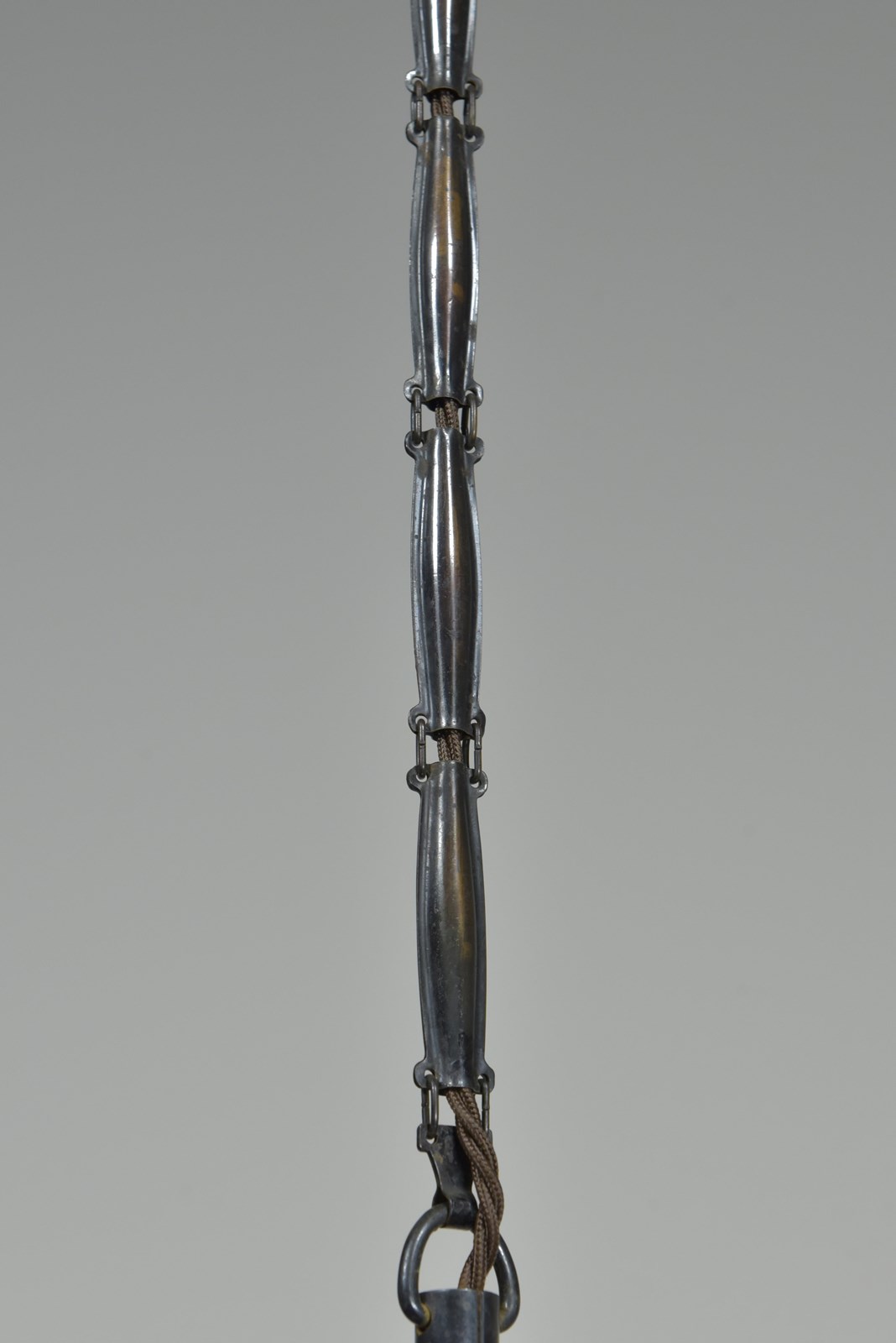 It features two glass parts; an upper etched conical and a lower opaline glass joined by a brass band, has it's original patinated gallery, unusual "tubes" chain and ceiling plate (with "hanger" within)
