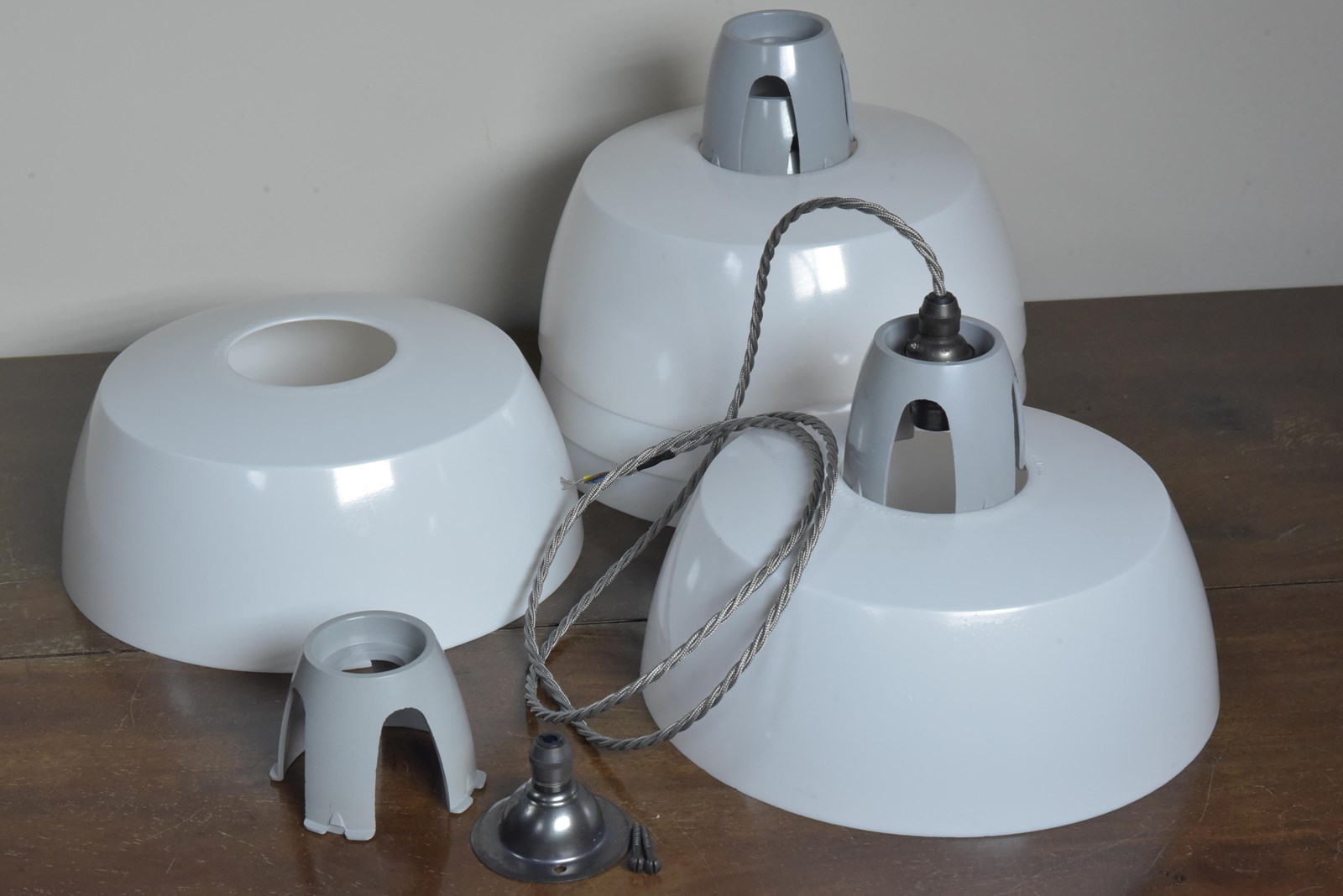 Mid century ish. White shades, grey snap in galleries. Plastic is not brittle or misshapen or discoloured.