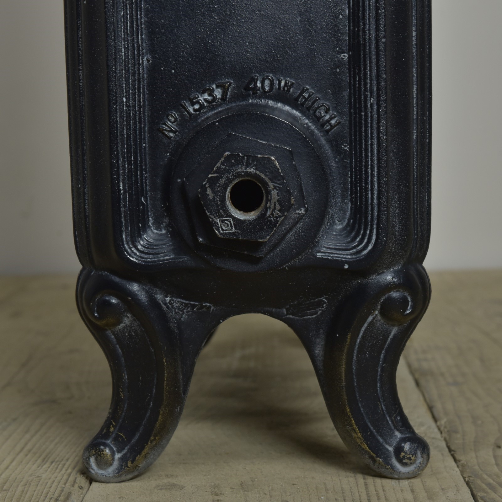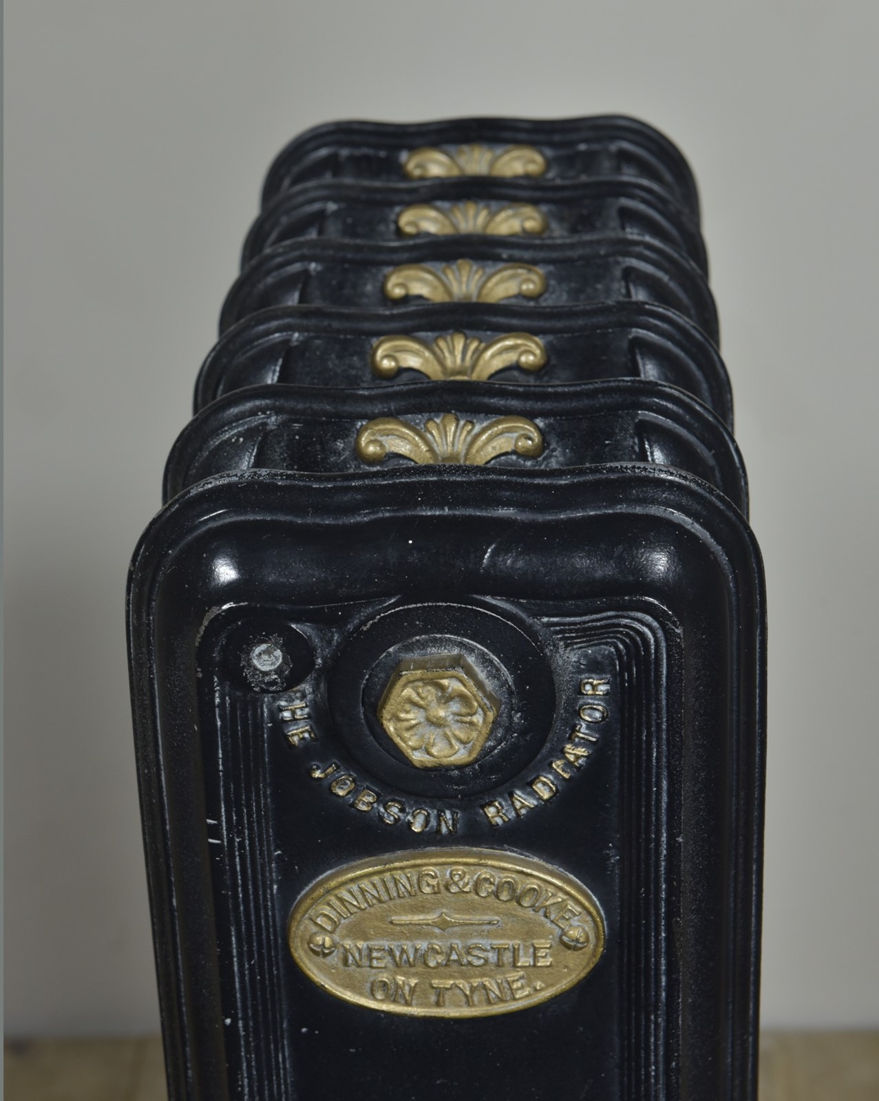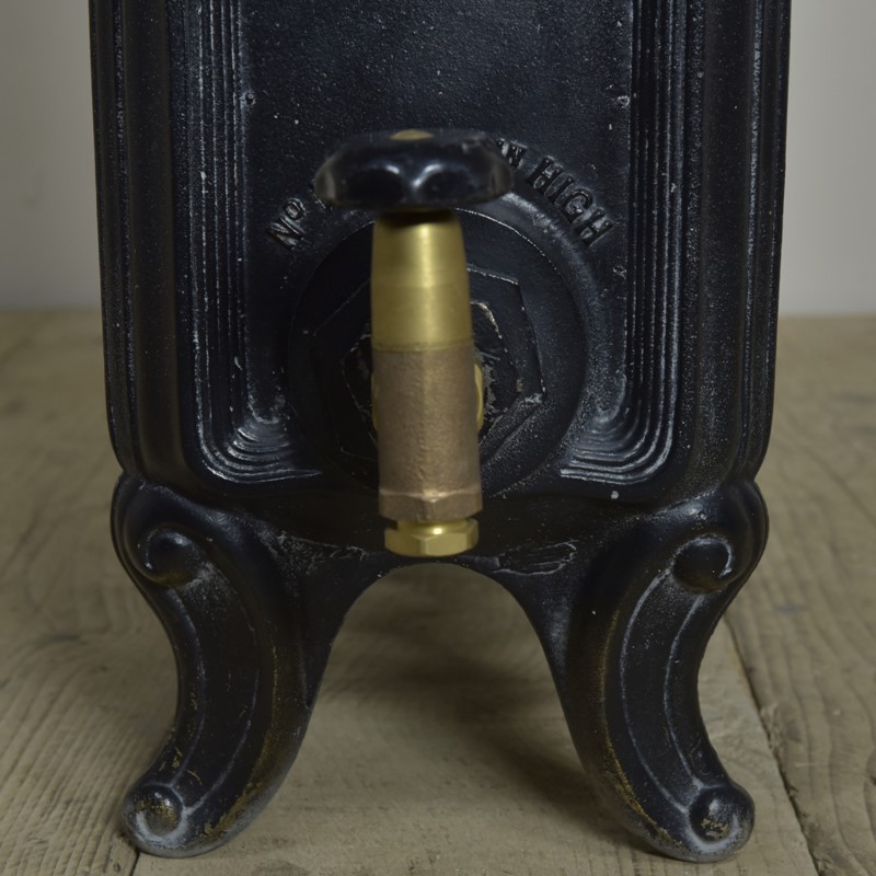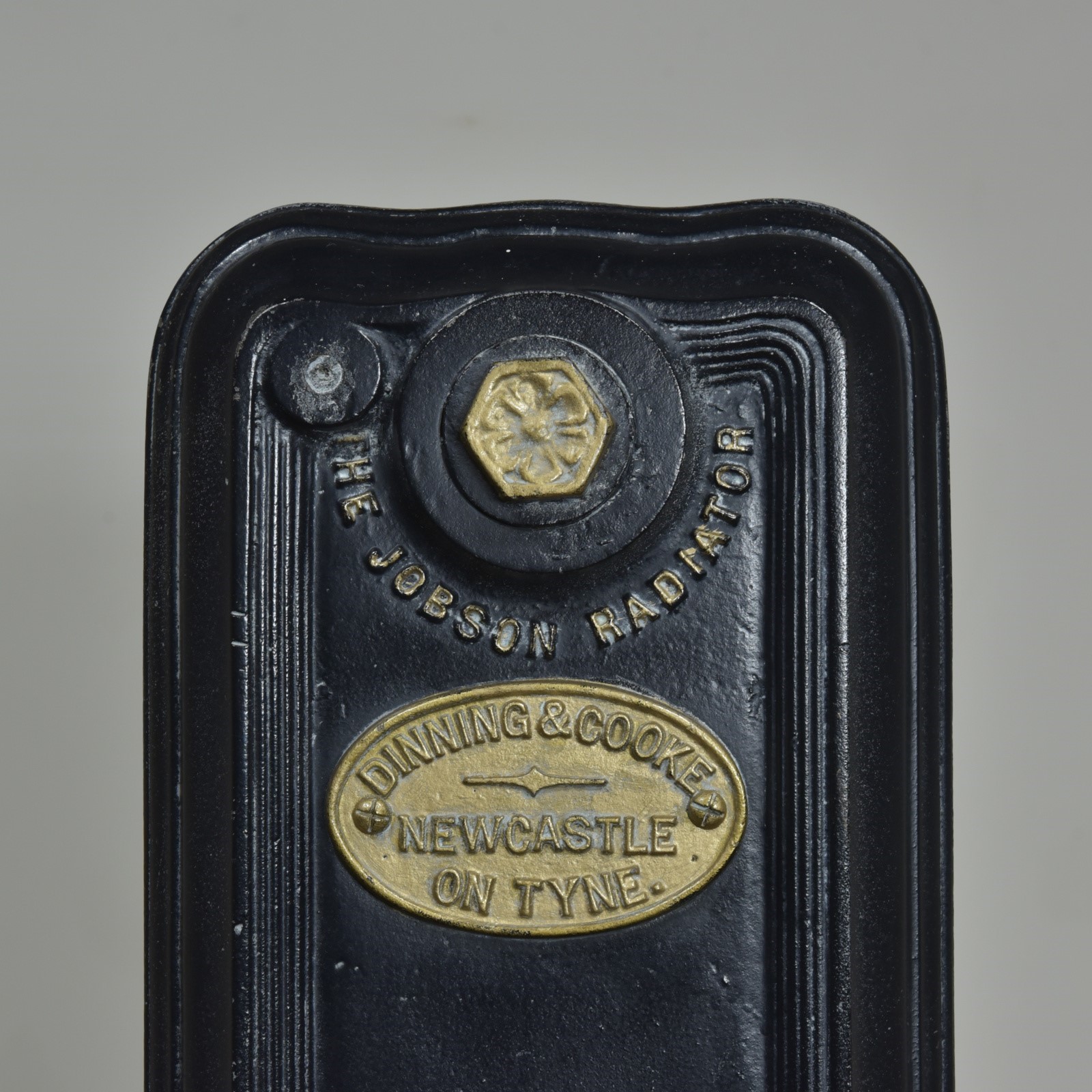 A rare model antique cast iron radiator made by Jobson with an oval cast iron plaque bearing the company name Dinning & Cooke (heating and ventilation engineers). Standing on integral scrolled feet. Priced in this condition (thoroughlly rubbed down and waxed) pressure tested and with a bleeder valve and the inlet and outlet ready for modern plumbing (half inch). Would make a good hall radiator. This model is the only one i have owned or seen. Dimensions in inches/cm; 40"/101.5cm tall. 20"/51cm wide (26.5"/67cm wide including sample pair of valves0 8.25"/21cm deep.
