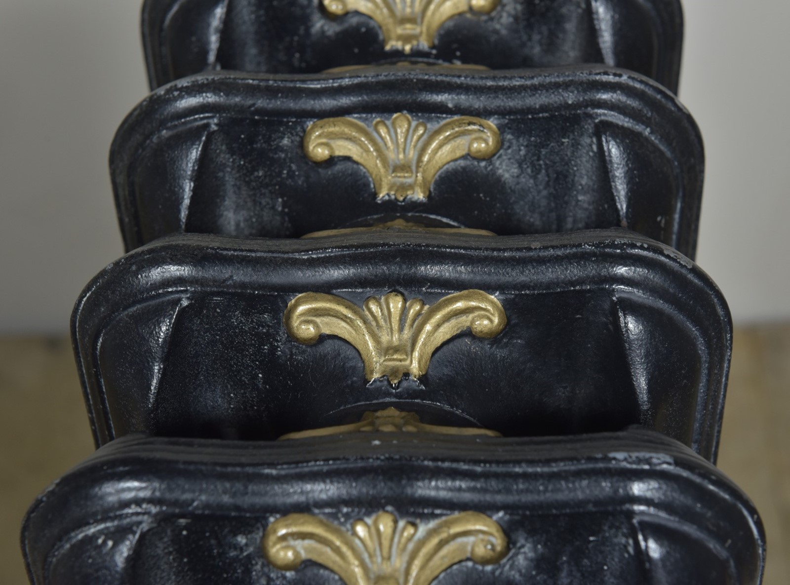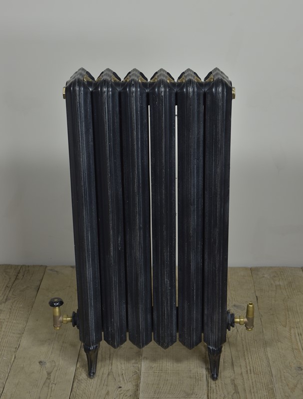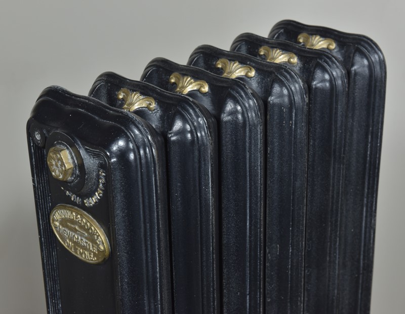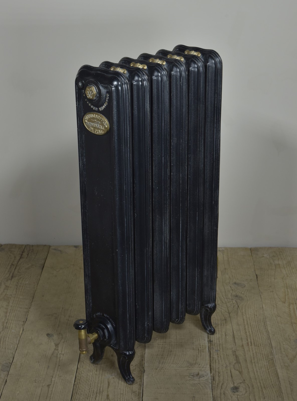 A rare model antique cast iron radiator made by Jobson with an oval cast iron plaque bearing the company name Dinning & Cooke (heating and ventilation engineers). Standing on integral scrolled feet. Priced in this condition (thoroughlly rubbed down and waxed) pressure tested and with a bleeder valve and the inlet and outlet ready for modern plumbing (half inch). Would make a good hall radiator. This model is the only one i have owned or seen. Dimensions in inches/cm; 40"/101.5cm tall. 20"/51cm wide (26.5"/67cm wide including sample pair of valves0 8.25"/21cm deep.