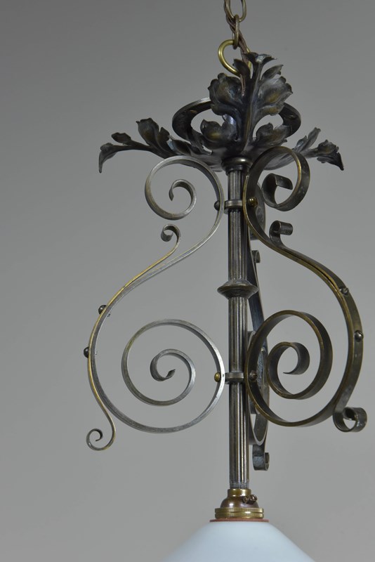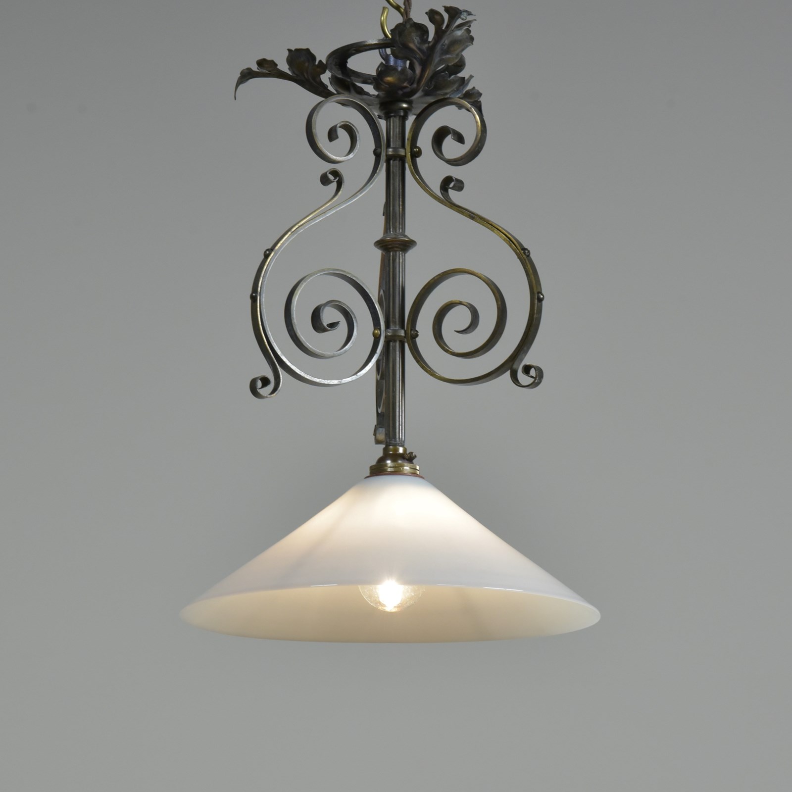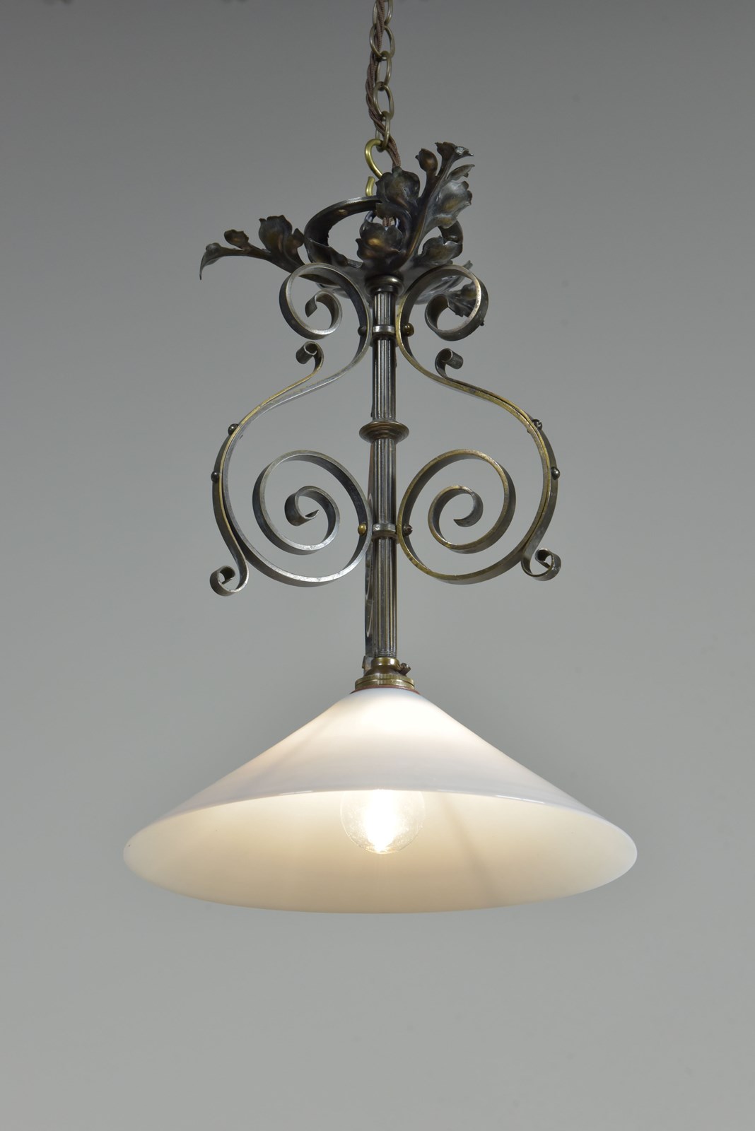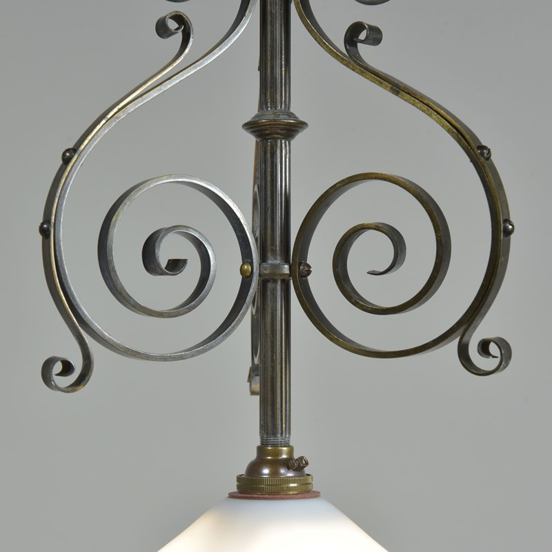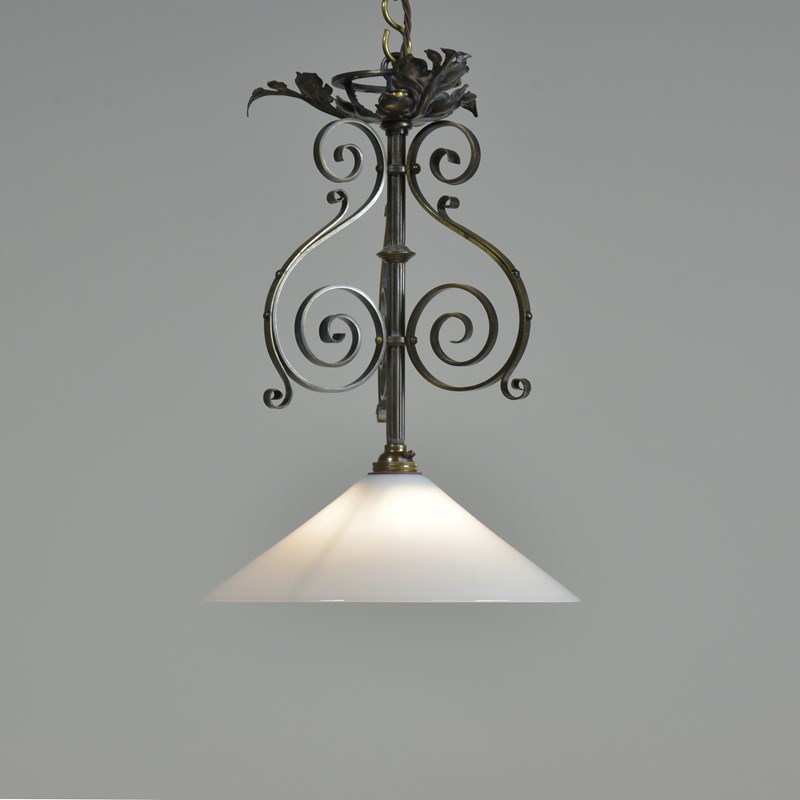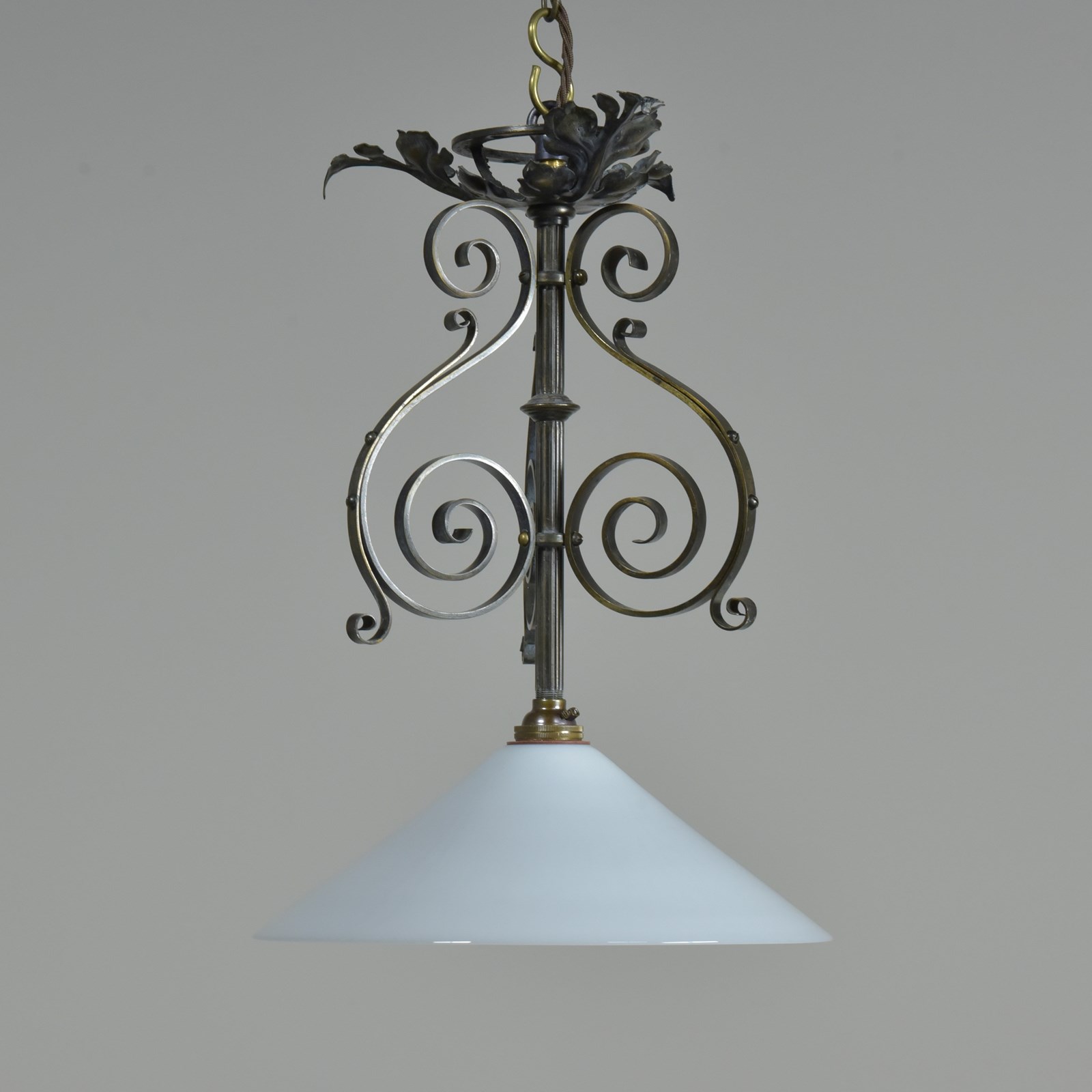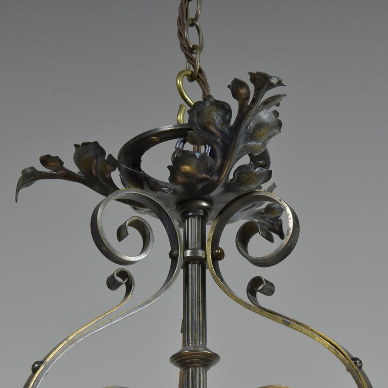A lovely antique arts & crafts brass light fitting with original patination , the central reeded and knopped stem surrounded by three scrolled arms below a leaf canopy. English c1900.