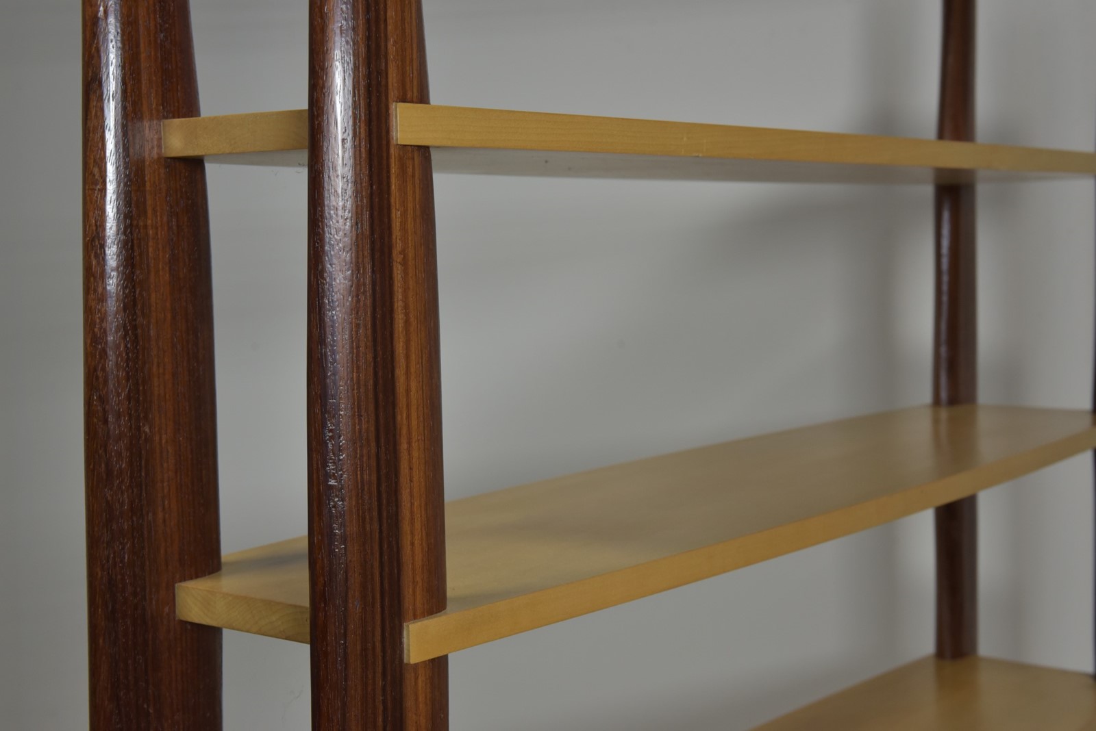 A nautically themed sculptural shelving / display with shaped corner posts supporting bowed maple graduated shelves. c1960s. A quality designer maker piece in very good sturdy condition. Dimensions in inches/cms; 48"/122cm tall x 48"/122cm wide x 10.375"/26.5cm max depth (8.25"/21cm min depth at ends). Useable shelf height: Lower; 10.25"/26cm, Middle; 9.5"/24cm, Upper; 9"/23cm.