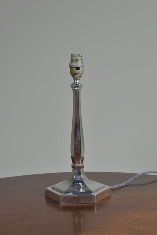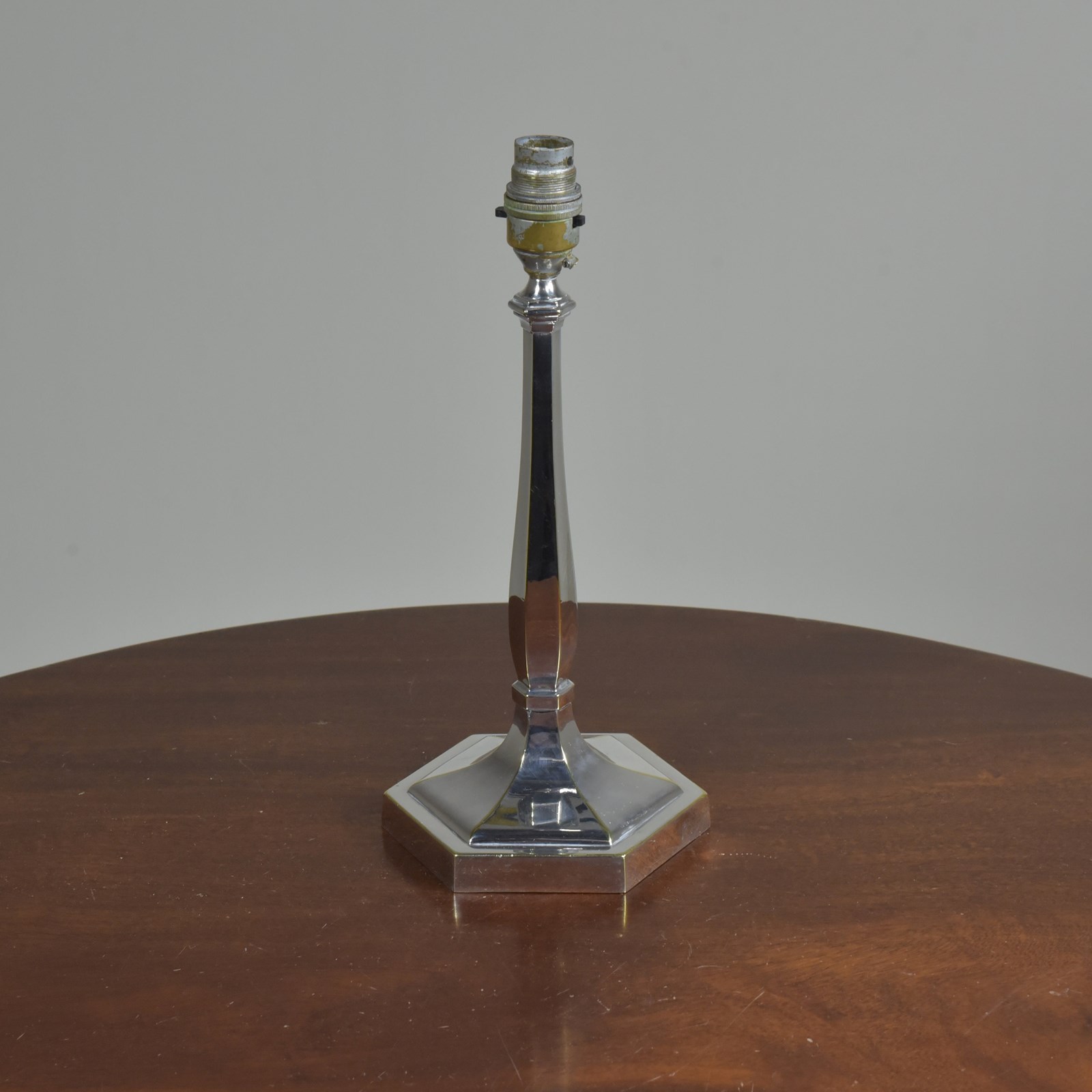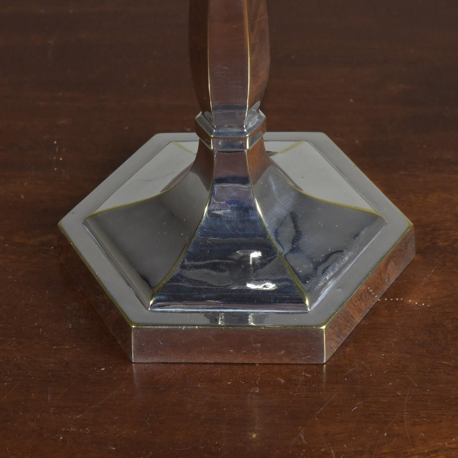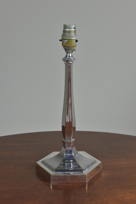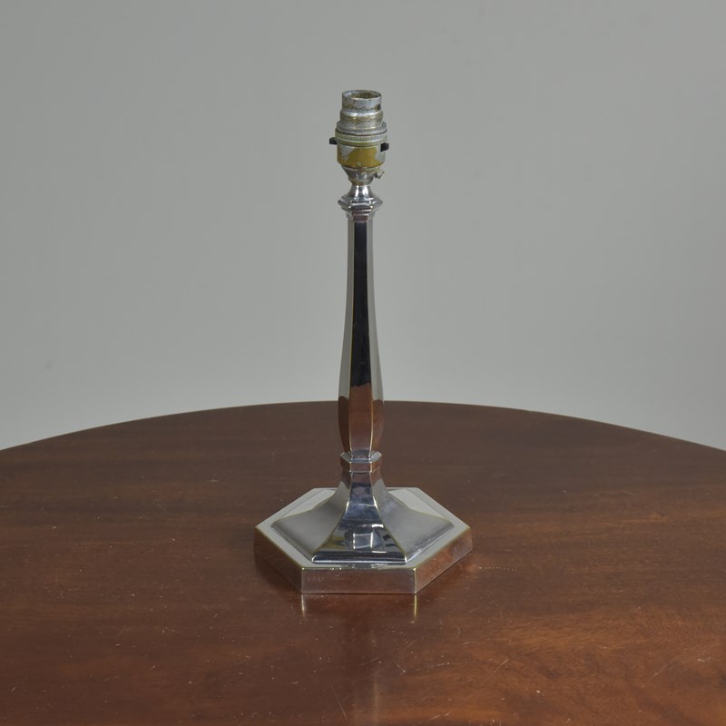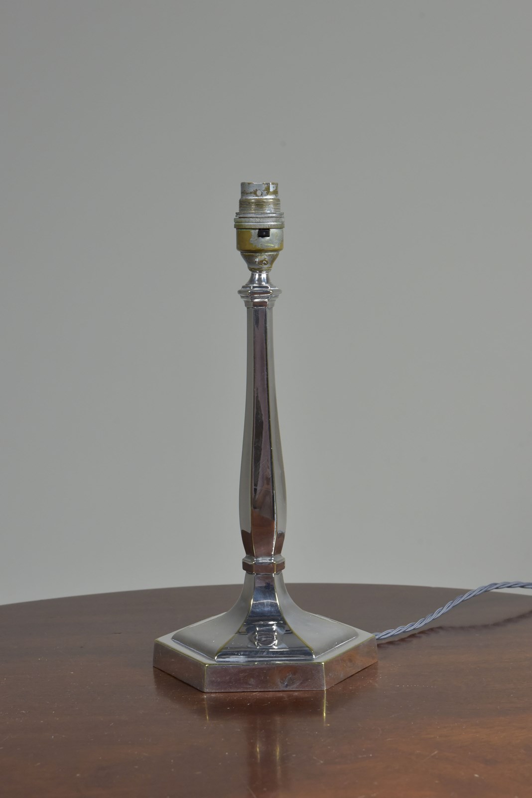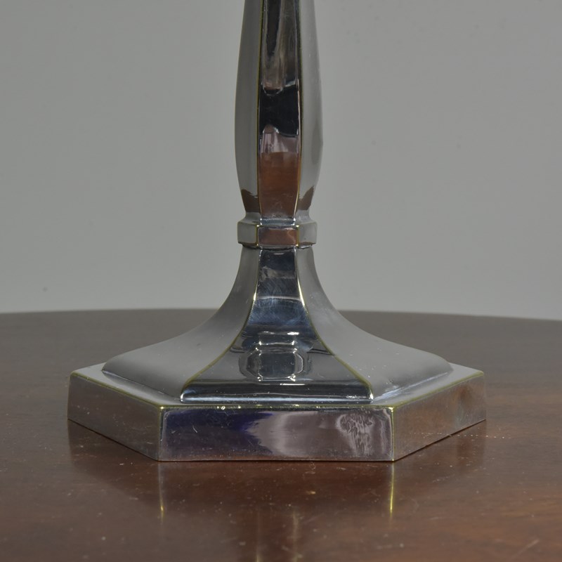 An antique silver plated brass hexagonal baluster stem and base lamp. English, 1920s.