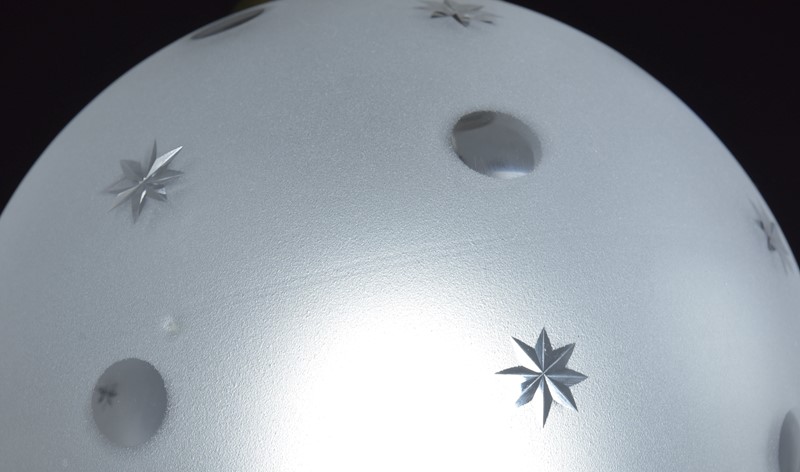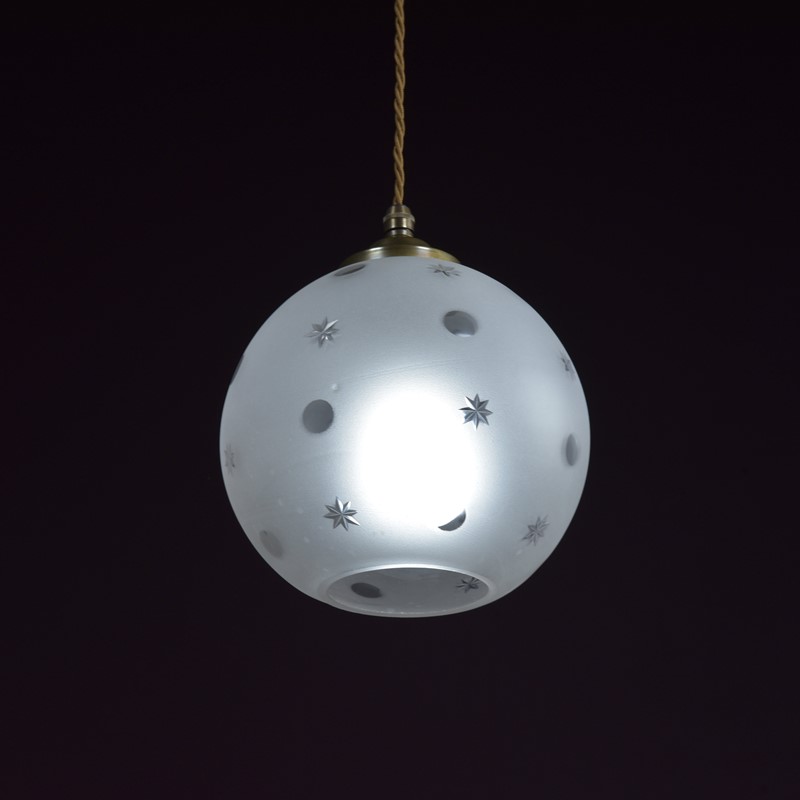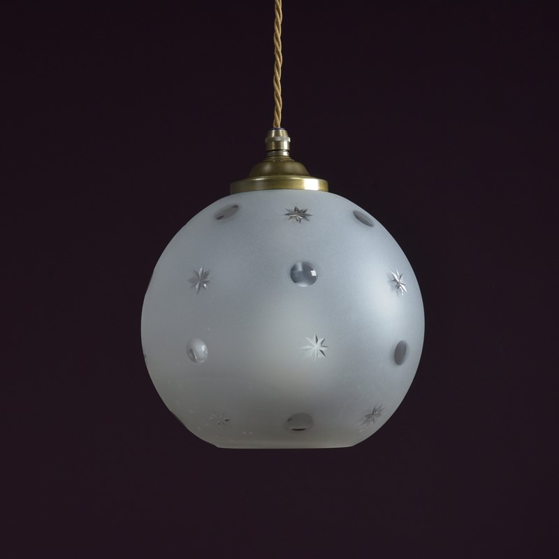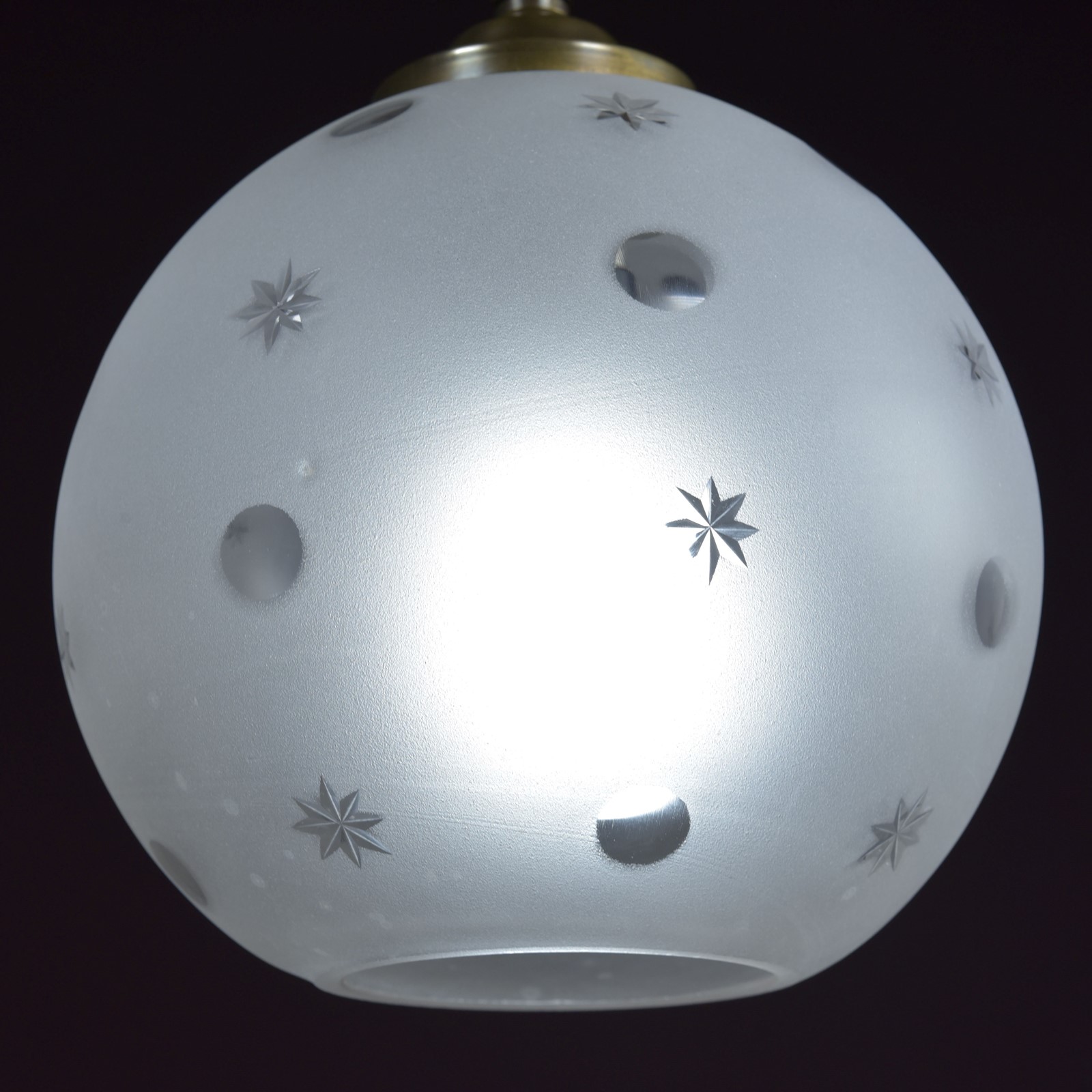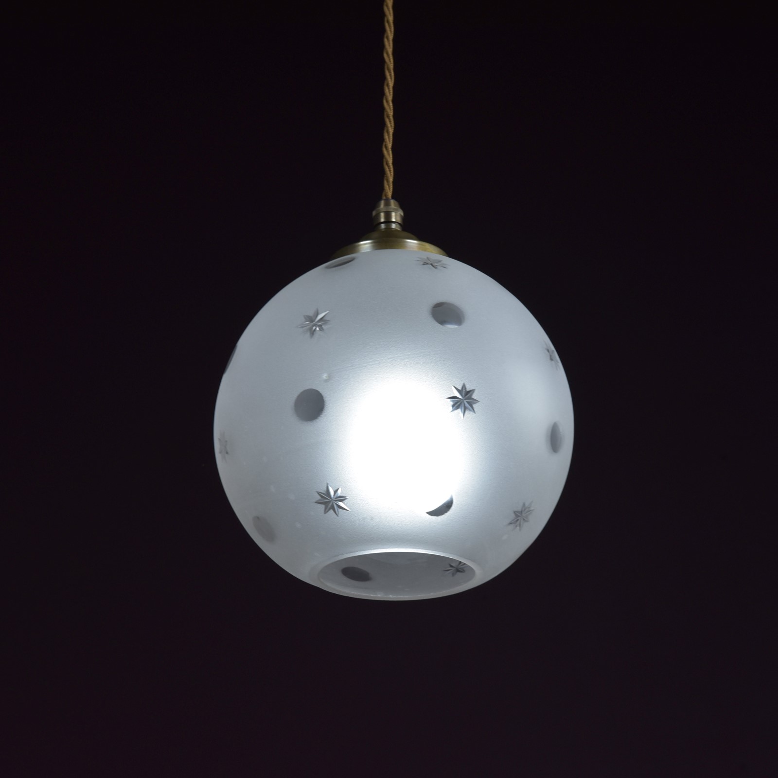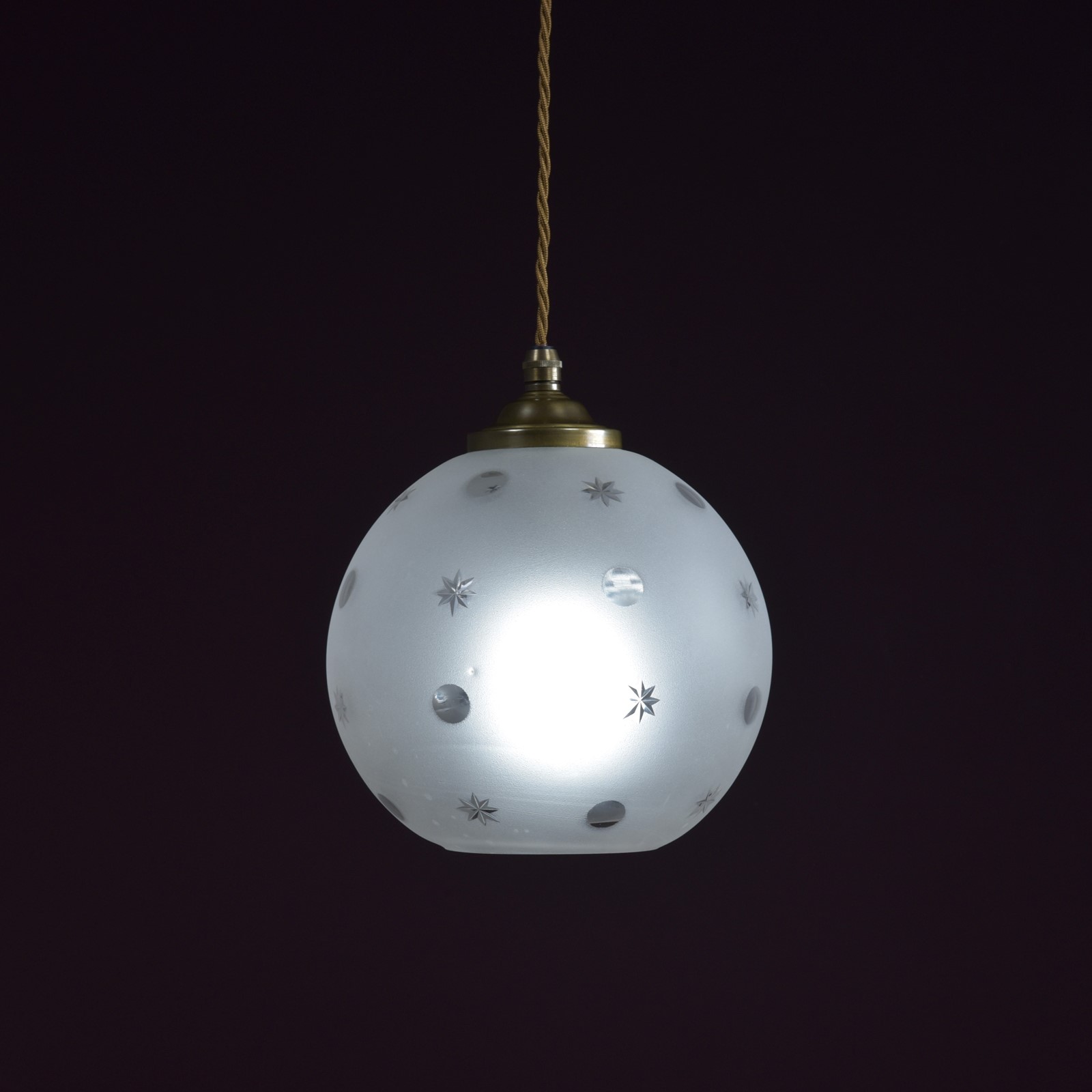 An antique etched and cut globe with cut stars and roundels - 12 of each. Early 20th century. Probably been an oil lamp shade. Rewired with 1.5m fabric flex and new patinated brass fittings (BC lampholder). Dimensions in inches/cms; 8"/20cm diameter. 9"/23cm tall inc. cordgrip. 3.25"/8.5cm opening to base of globe. 1.1kg. I have another star cut globed available, slightly smaller and not open bottomed.