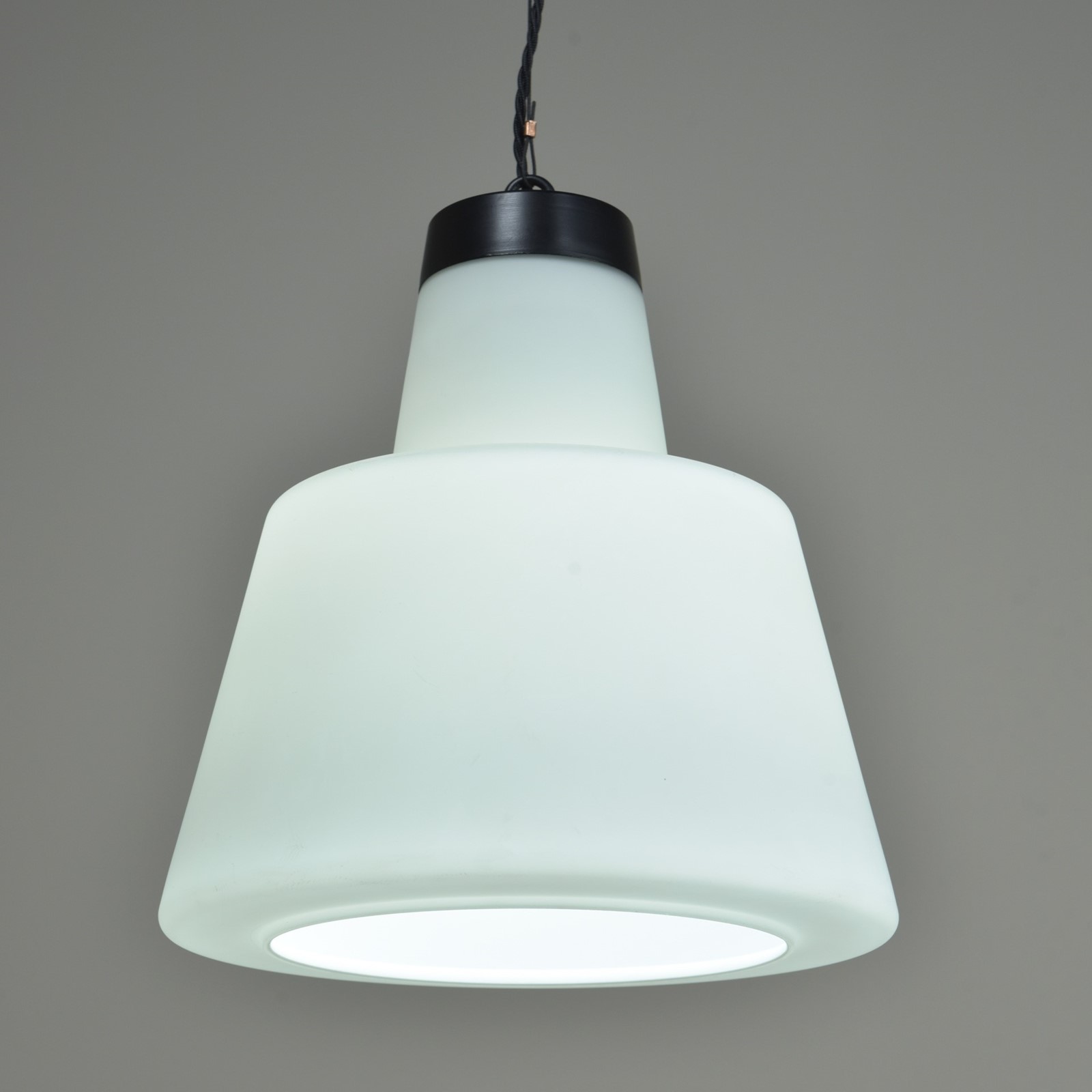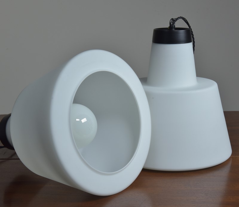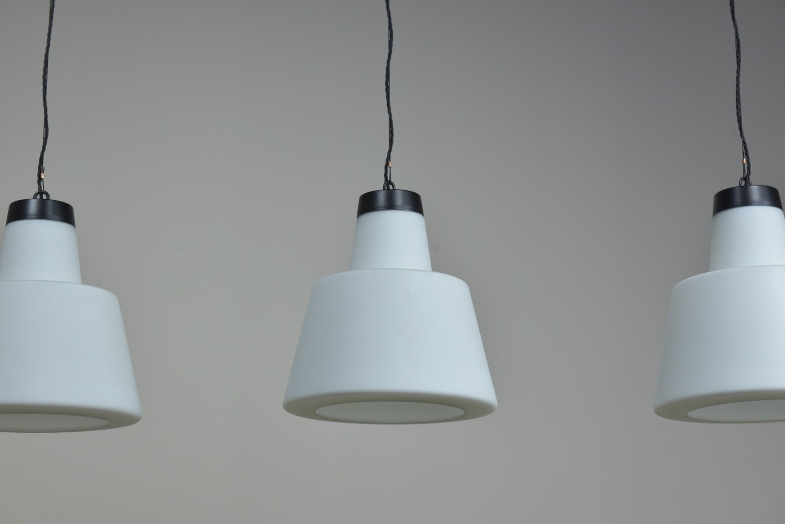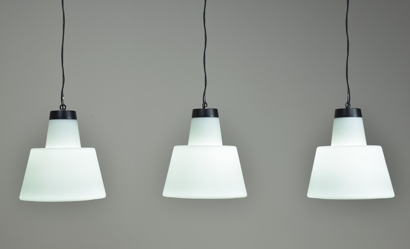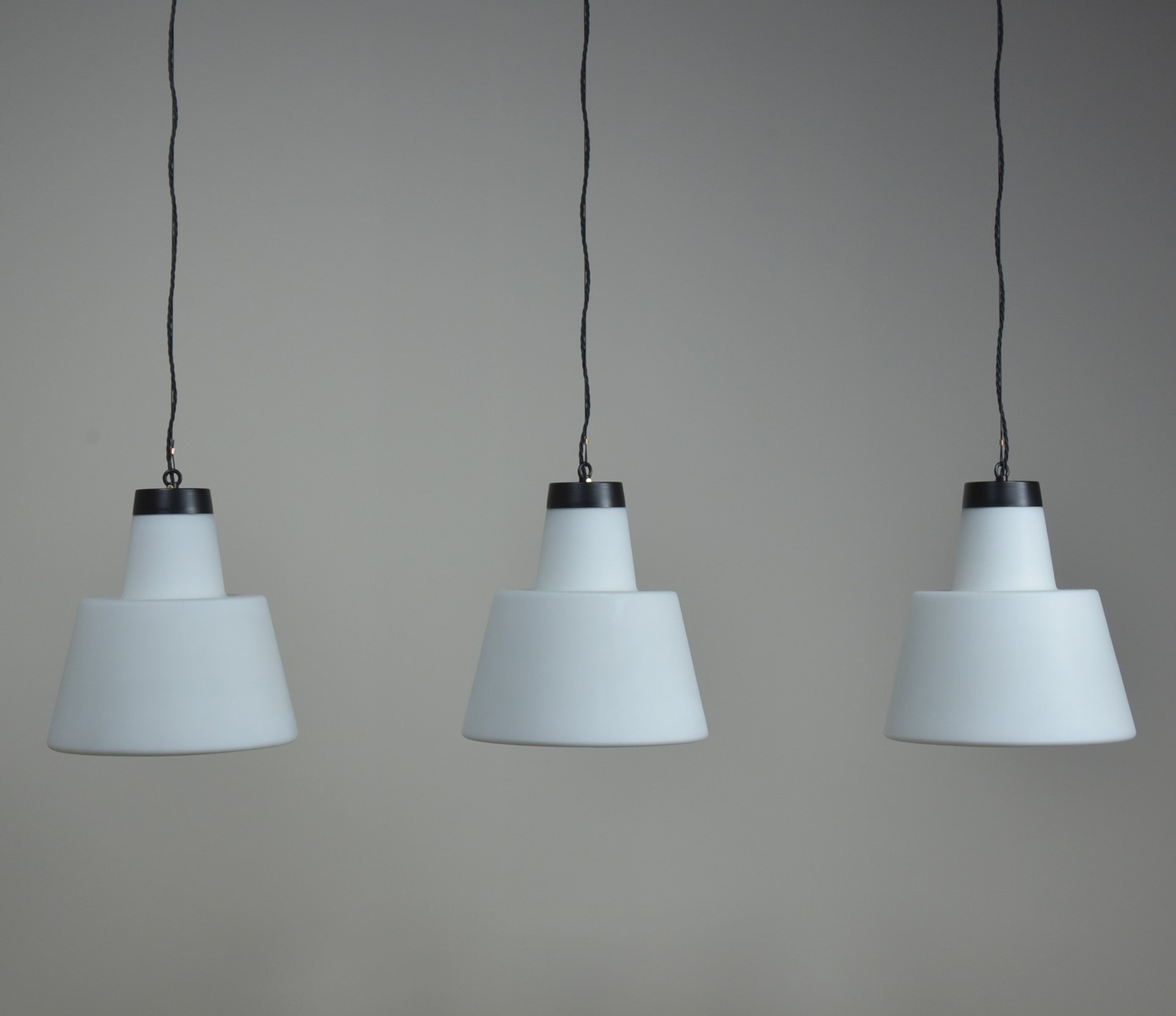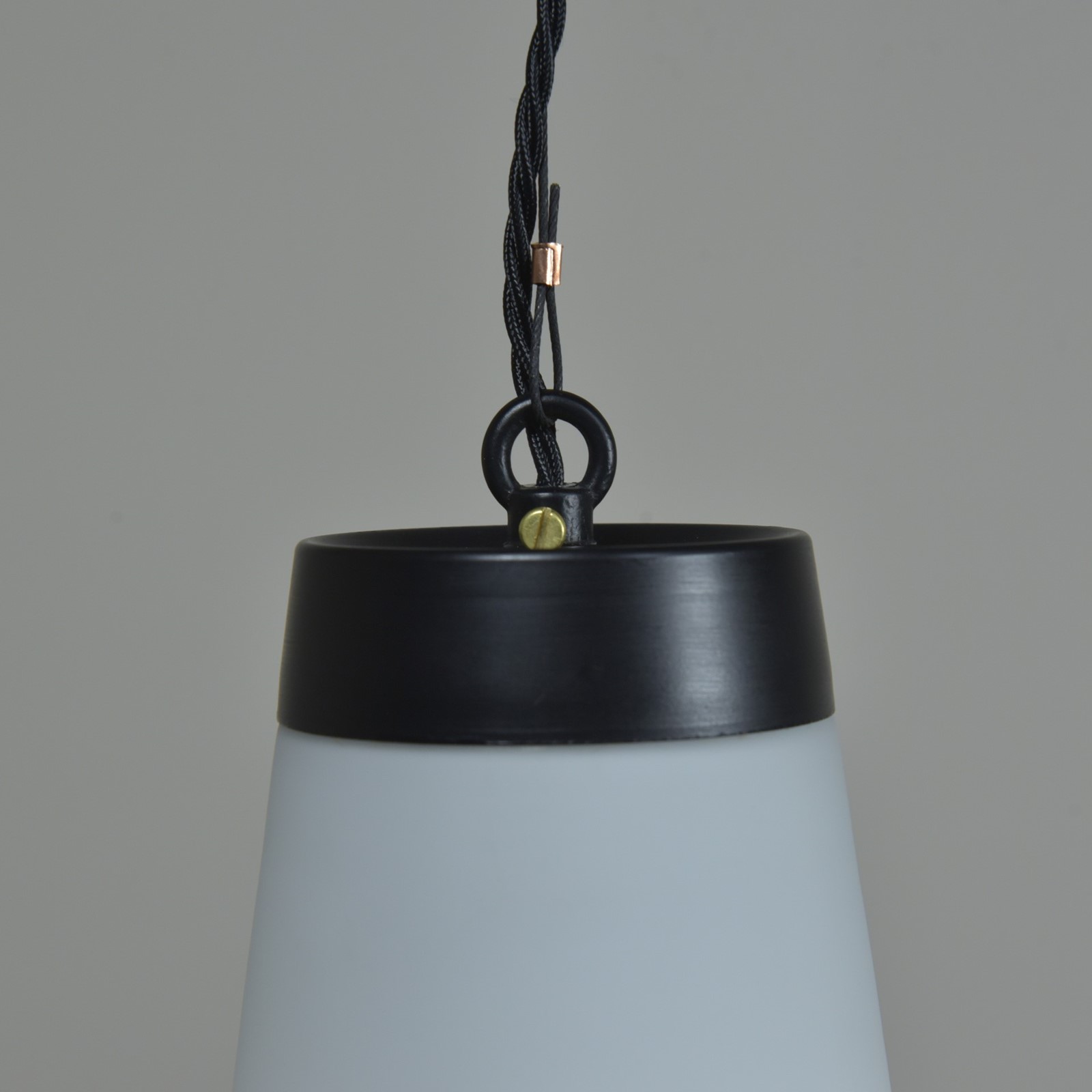 A run of matt white glass / opaline stepped conical light fittings with original steel galleries marked Faulks. English c1950s. Quality hand blown large glass shades. They have been fully cleaned, restored and are shown hanging on fine steel cable. They will be supplied with black patinated brass ceiling plates with hanging loops to match the galleries/ hanging loops on the light fittings. They can be supplied with a custom length of steel cable already attached to the gallery and ceiling loops or with a crimp. Alternatively they could be hung with chain. I have a wide variety of flex colours. The ones shown are wired with 1.25m of cable and 1.5m fabric flex. These lengths are included in the price. They have brass ES lampholders (British made) that have been sited within the shade to postition a globe style light bulb centrally for ideal lighting. Dimensions in inches/cm; 11.5"/29cm diameter. 11.5"/29cm tall inc loop. The base opening is 7.75"/19.5cm diameter.