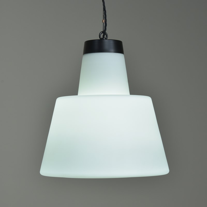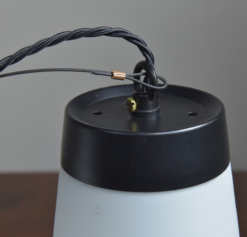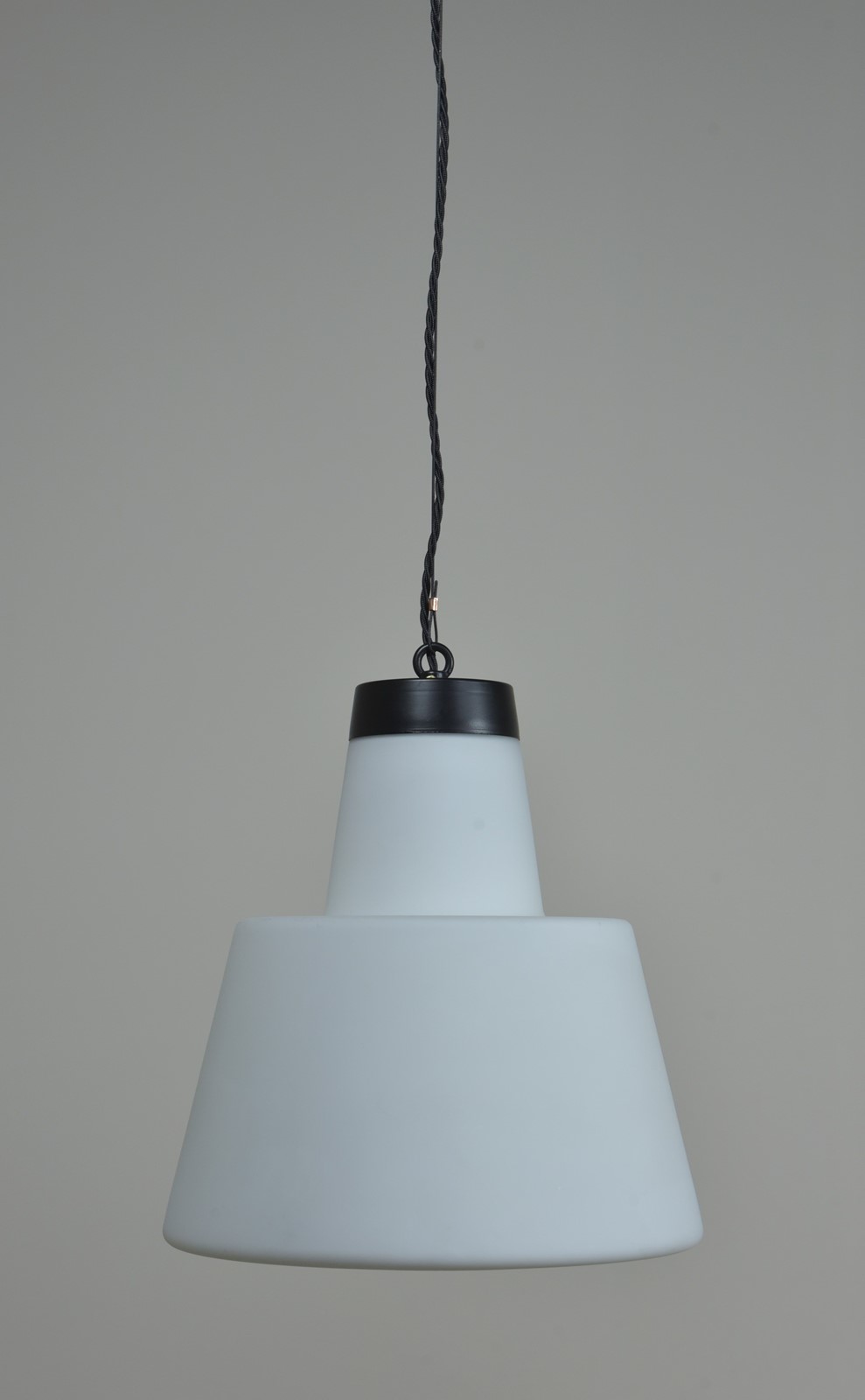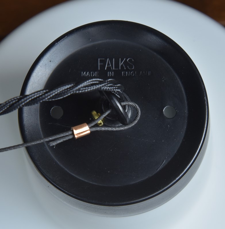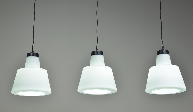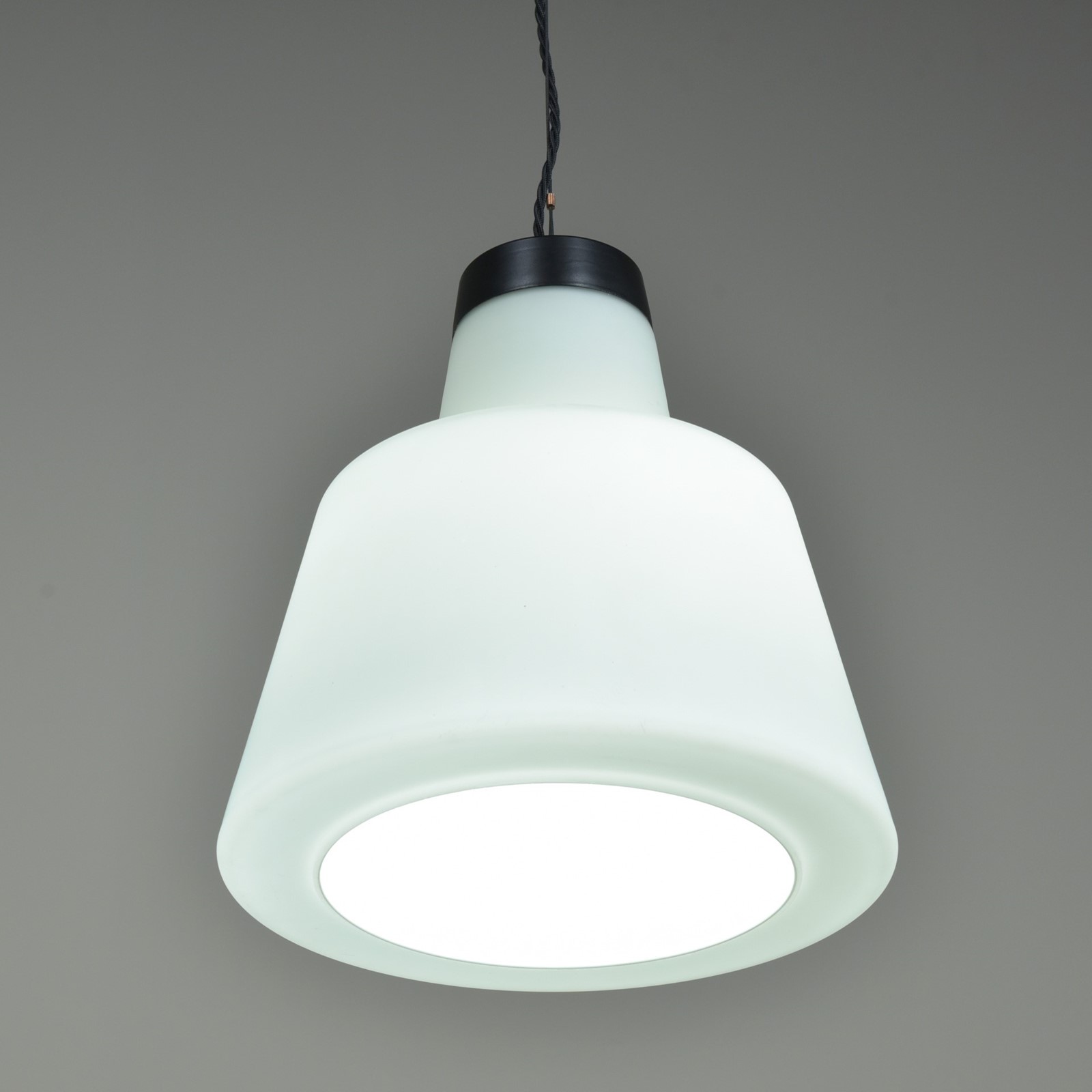 A run of matt white glass / opaline stepped conical light fittings with original steel galleries marked Faulks. English c1950s. Quality hand blown large glass shades. They have been fully cleaned, restored and are shown hanging on fine steel cable. They will be supplied with black patinated brass ceiling plates with hanging loops to match the galleries/ hanging loops on the light fittings. They can be supplied with a custom length of steel cable already attached to the gallery and ceiling loops or with a crimp. Alternatively they could be hung with chain. I have a wide variety of flex colours. The ones shown are wired with 1.25m of cable and 1.5m fabric flex. These lengths are included in the price. They have brass ES lampholders (British made) that have been sited within the shade to postition a globe style light bulb centrally for ideal lighting. Dimensions in inches/cm; 11.5"/29cm diameter. 11.5"/29cm tall inc loop. The base opening is 7.75"/19.5cm diameter.