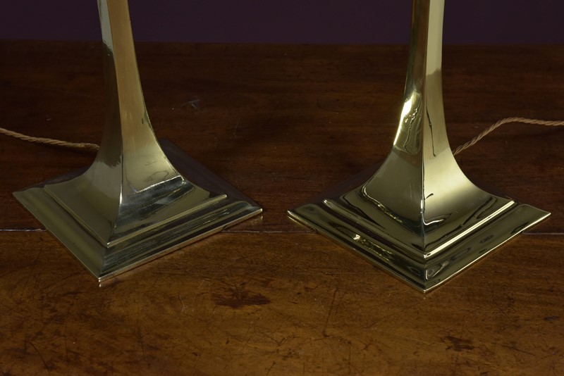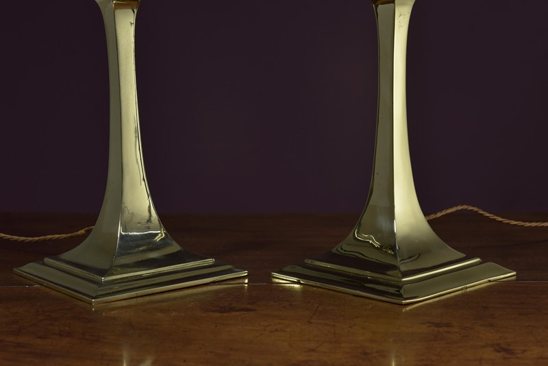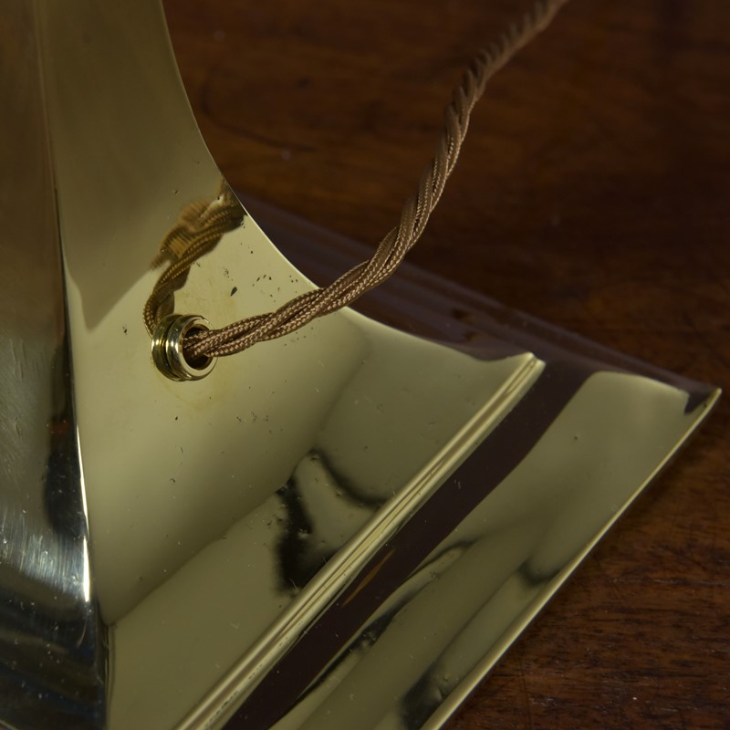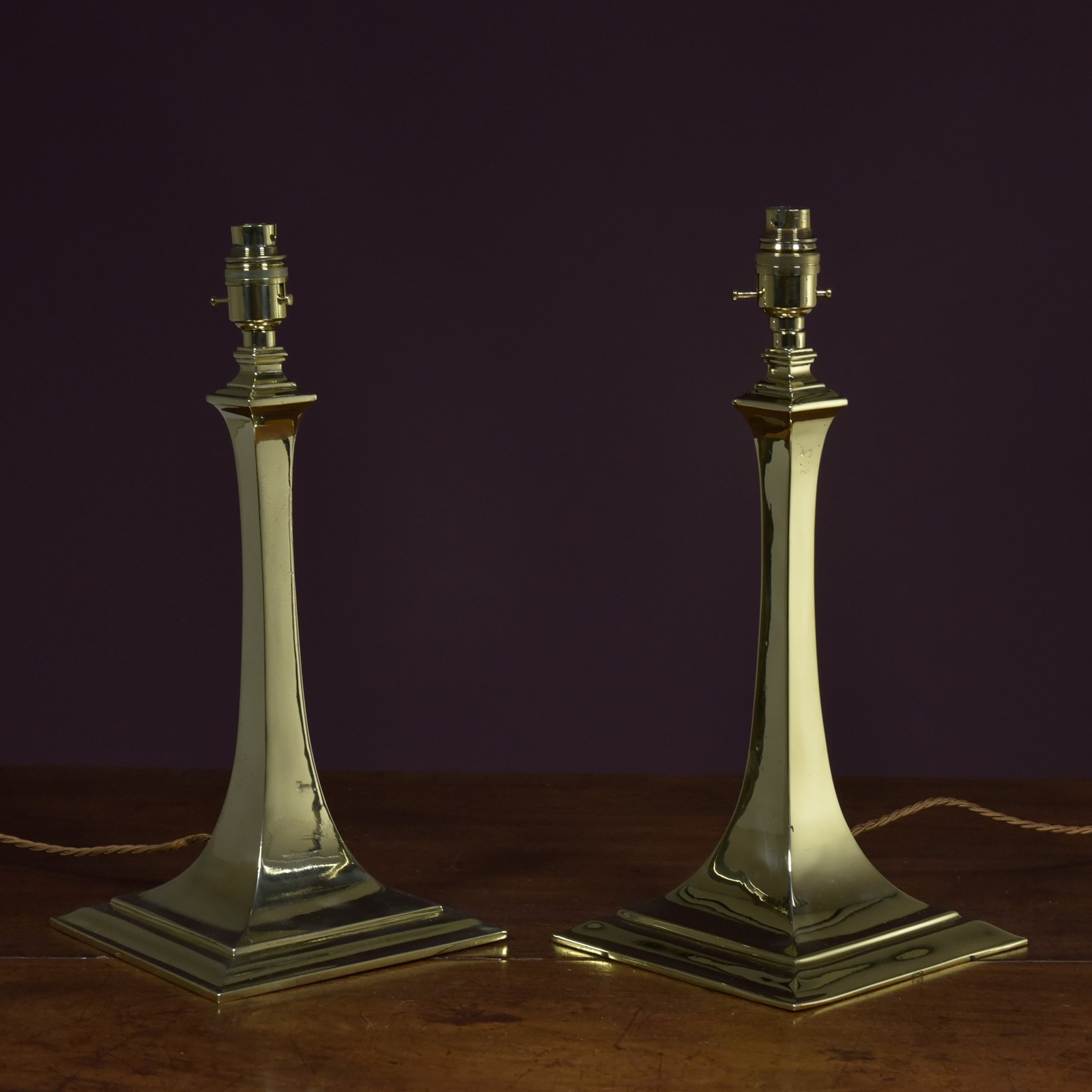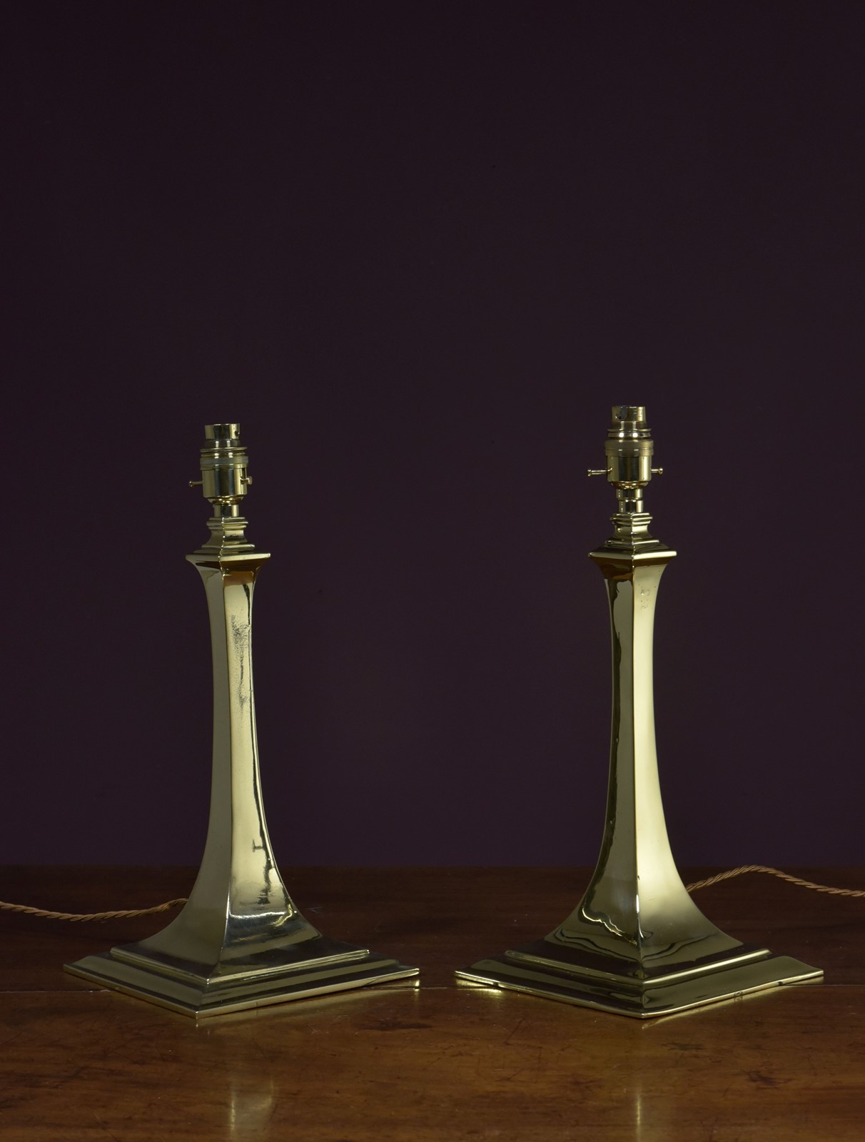 A pair of fabulous quality and design antique cast brass lamps, the square waisted stems spreading concavely to wide moulded bases. English, c1920. The undersides are filled in with a thick brass plate (pics). The odd one of these surfaces from time to time and can be marked REVO (so either made or distributed by them). Maybe these were designed for a specific ship or for use on boats in general, i don't know but they are very stable and could possibly have also been fastened down. I have highly polished these (including the bases to make them smooth so as to not scratch surfaces - they could have fabric added too). Rewired with 3m fabric flex and new traditional phenolic 3A plugs. Original switched brass lampholders (lovely quality). Price is per light, sold as a pair. Dimensions in inches/cms; 16"/40.5cm tall. 7.25"/18.75cm square base. 3.4kg and 3.2kg.