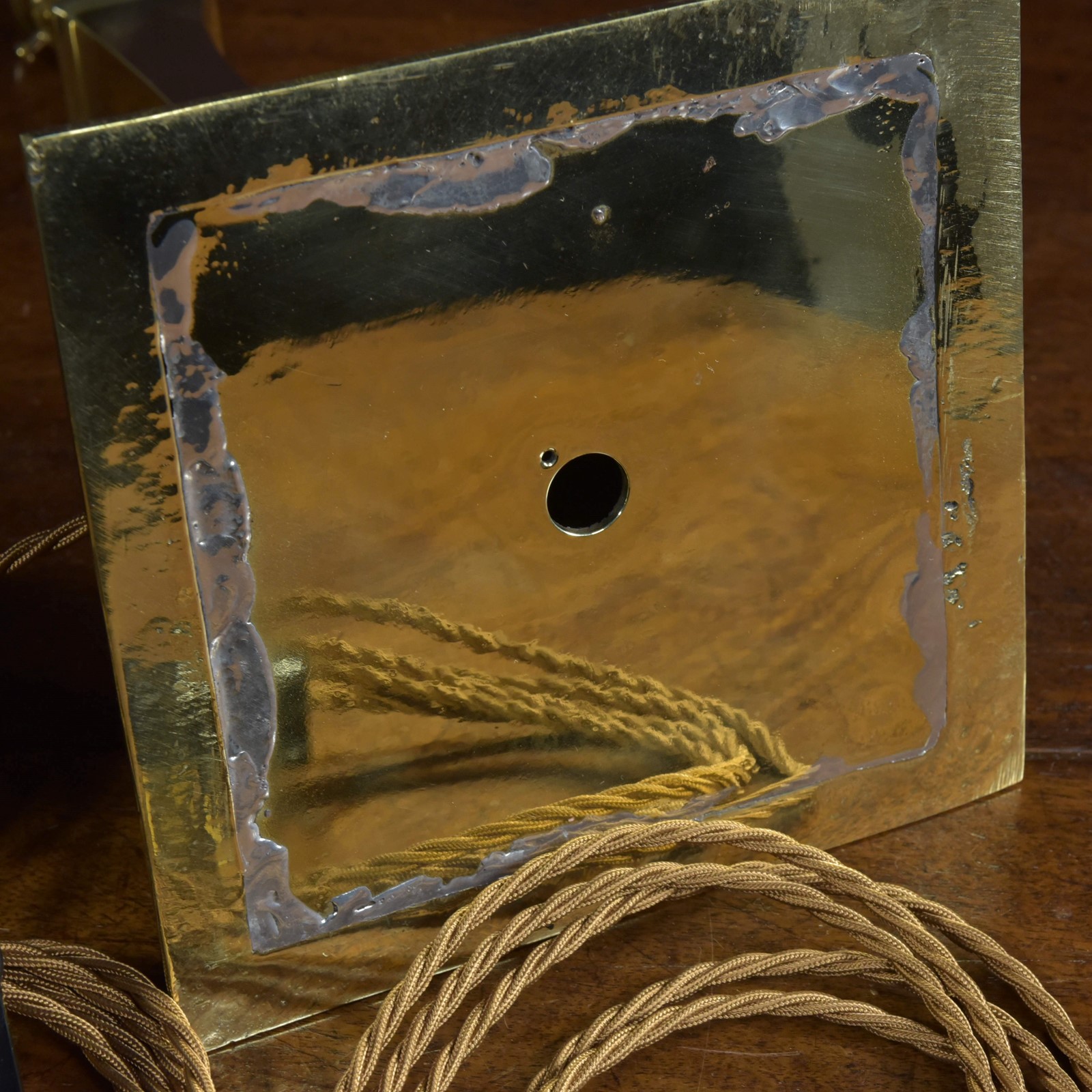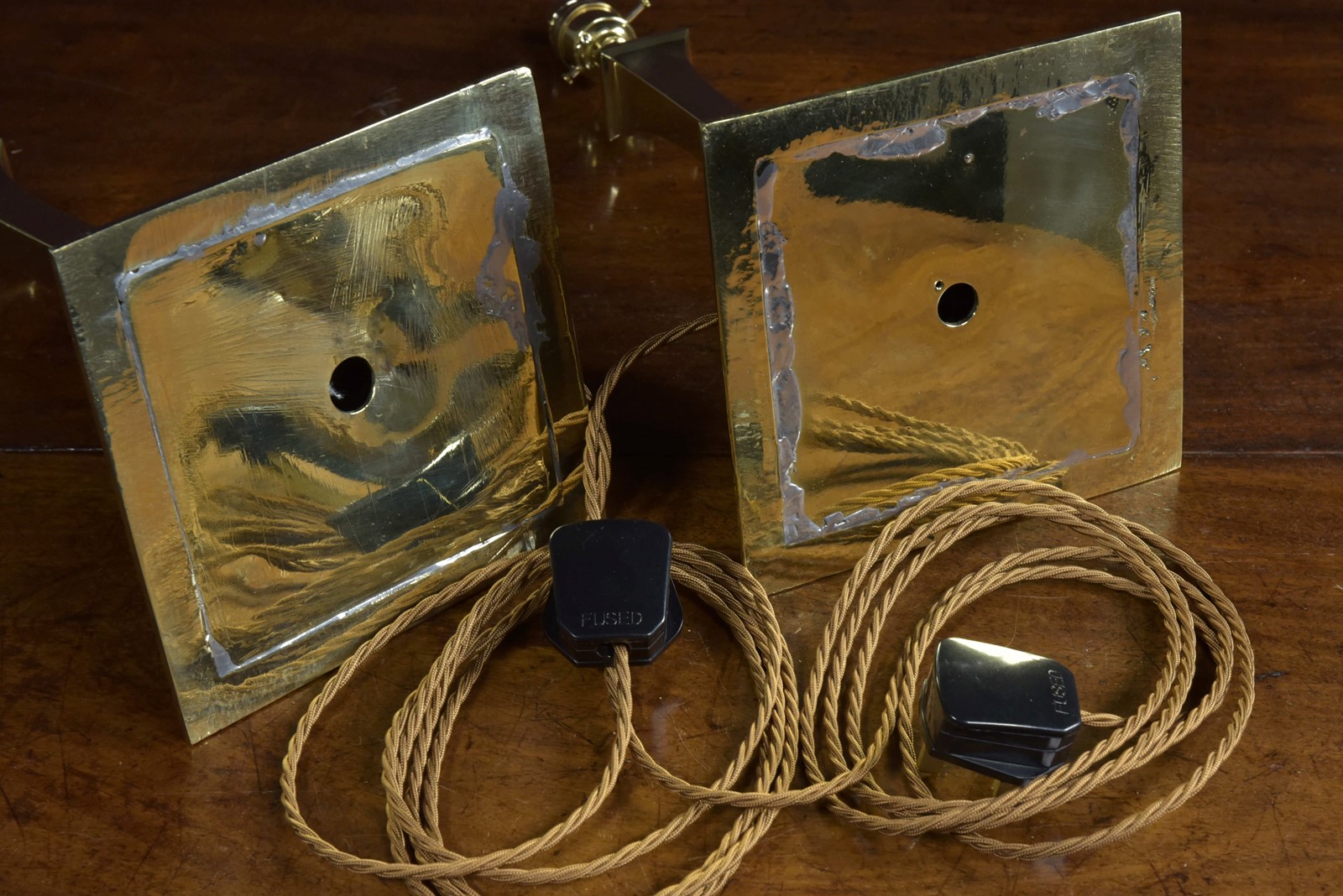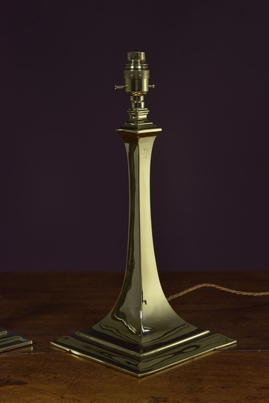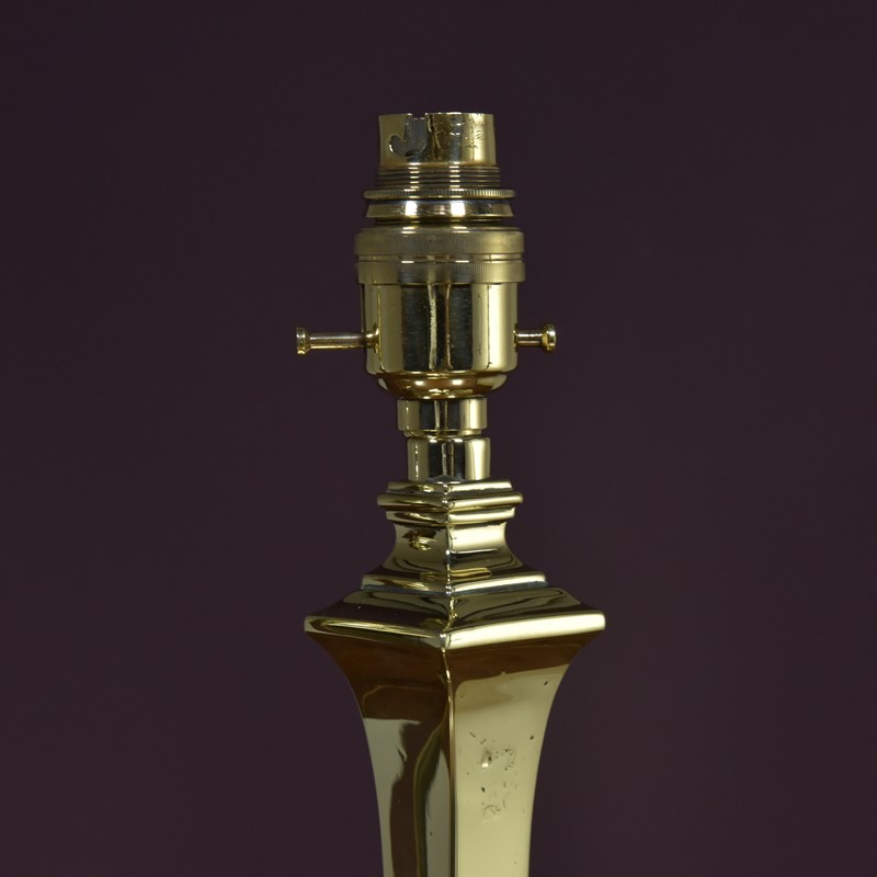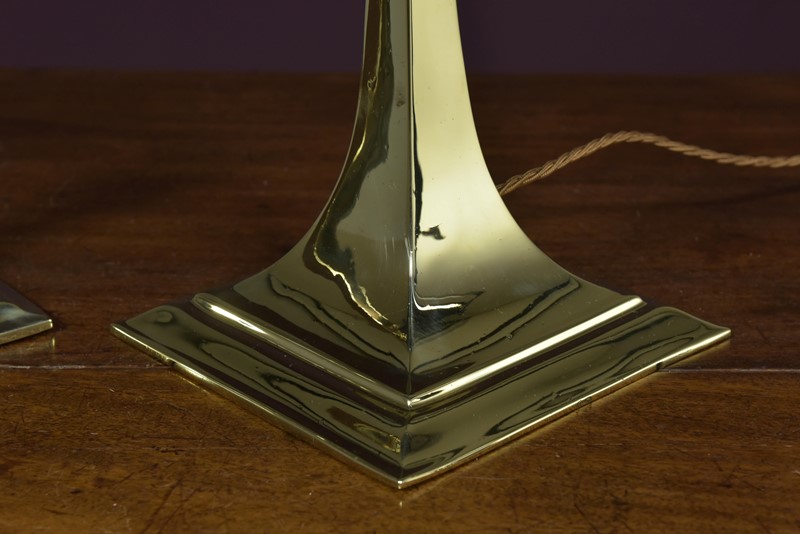 A pair of fabulous quality and design antique cast brass lamps, the square waisted stems spreading concavely to wide moulded bases. English, c1920. The undersides are filled in with a thick brass plate (pics). The odd one of these surfaces from time to time and can be marked REVO (so either made or distributed by them). Maybe these were designed for a specific ship or for use on boats in general, i don't know but they are very stable and could possibly have also been fastened down. I have highly polished these (including the bases to make them smooth so as to not scratch surfaces - they could have fabric added too). Rewired with 3m fabric flex and new traditional phenolic 3A plugs. Original switched brass lampholders (lovely quality). Price is per light, sold as a pair. Dimensions in inches/cms; 16"/40.5cm tall. 7.25"/18.75cm square base. 3.4kg and 3.2kg.