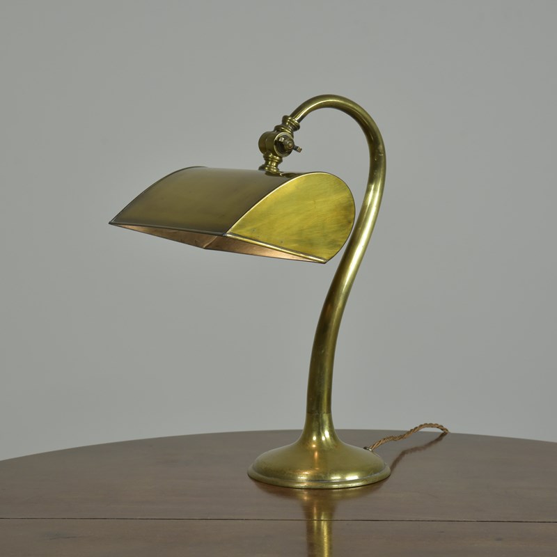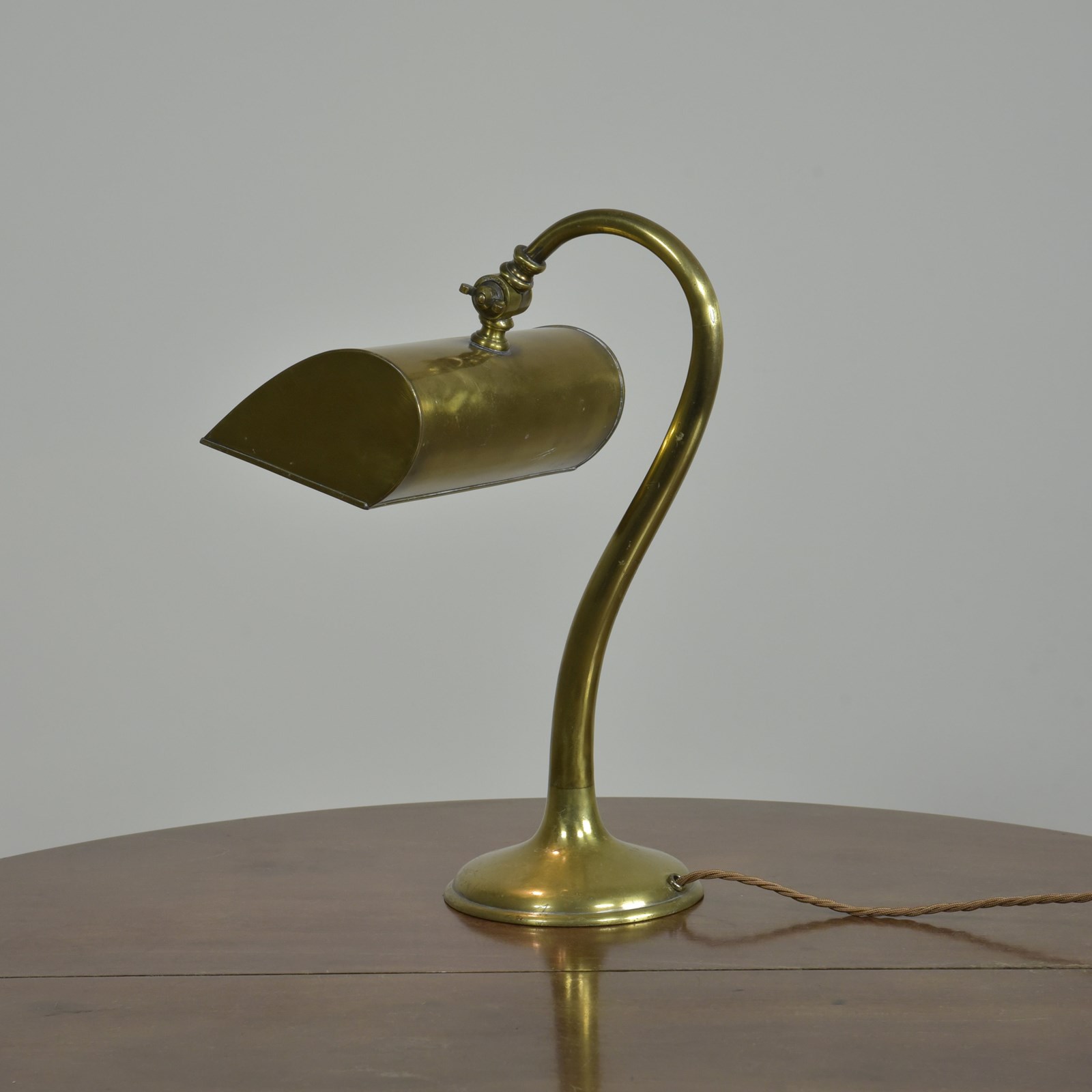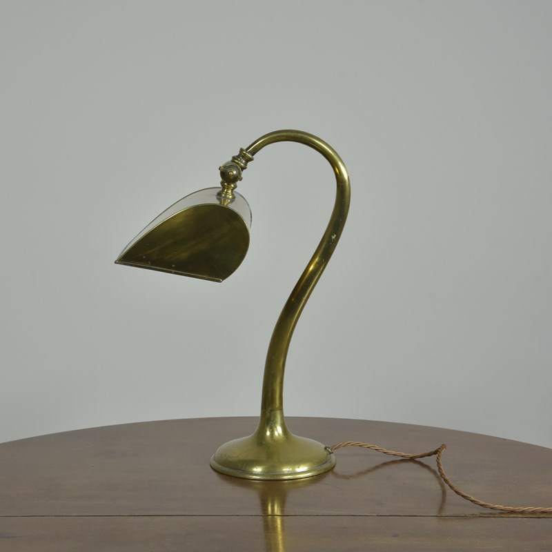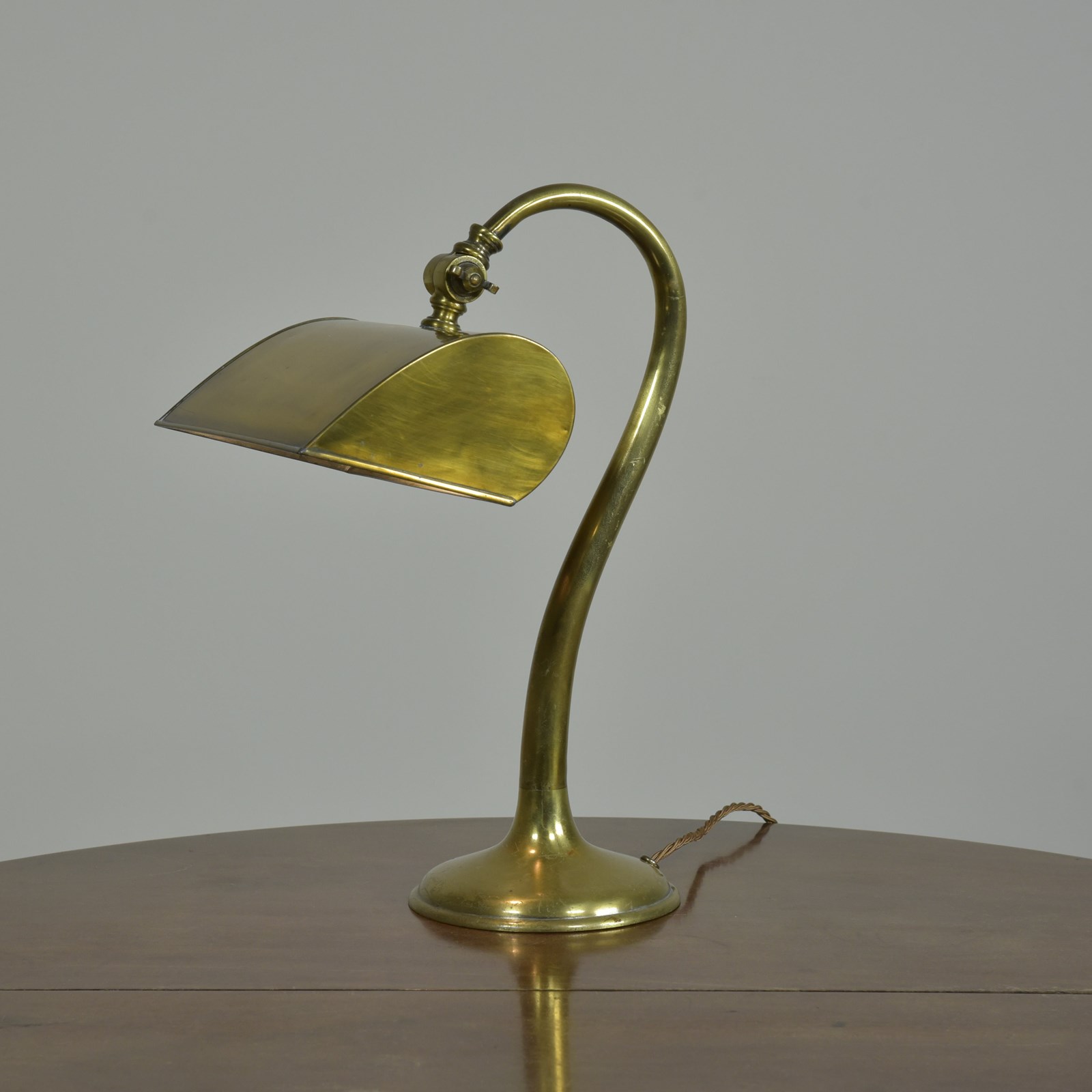 An unusual, gracefully tapering, cast brass swan necked bankers lamp. English approx 1920s