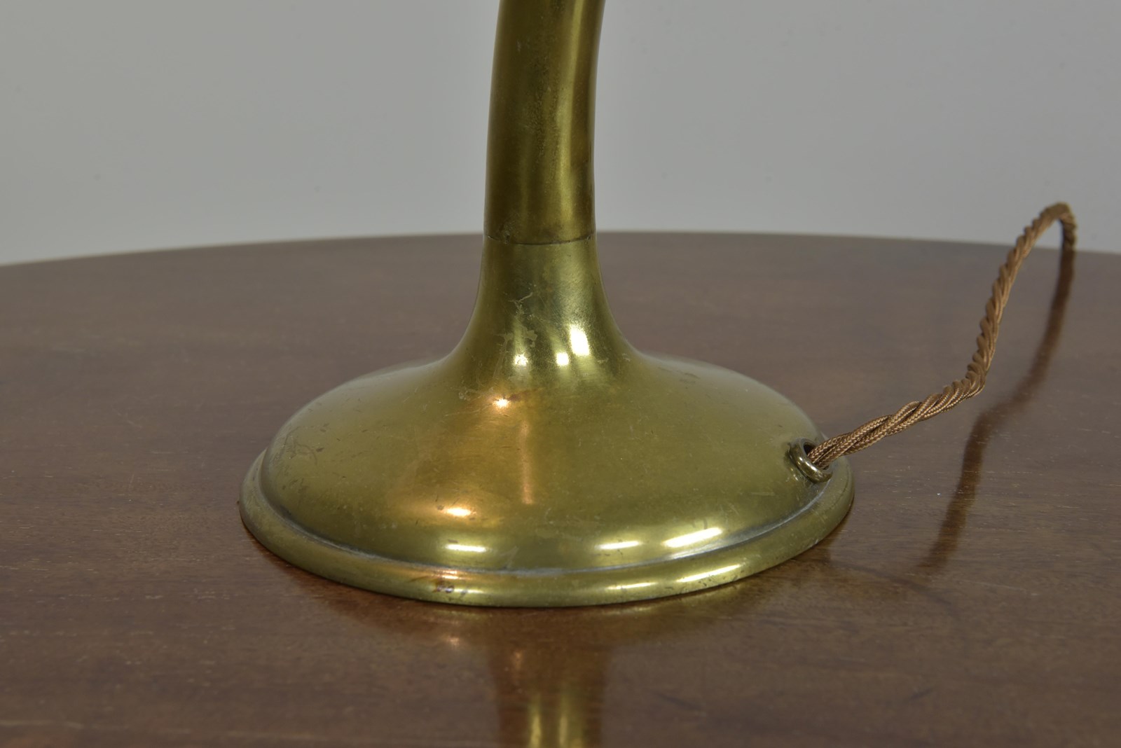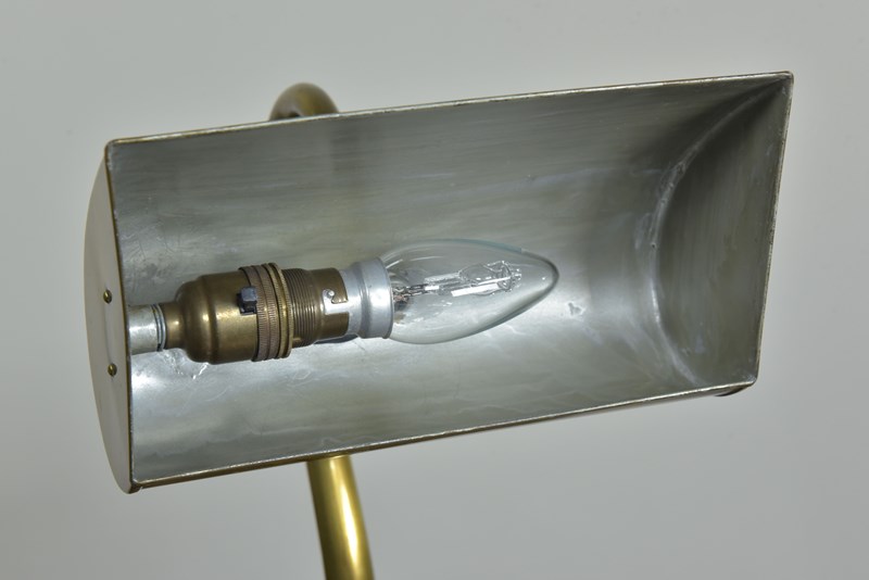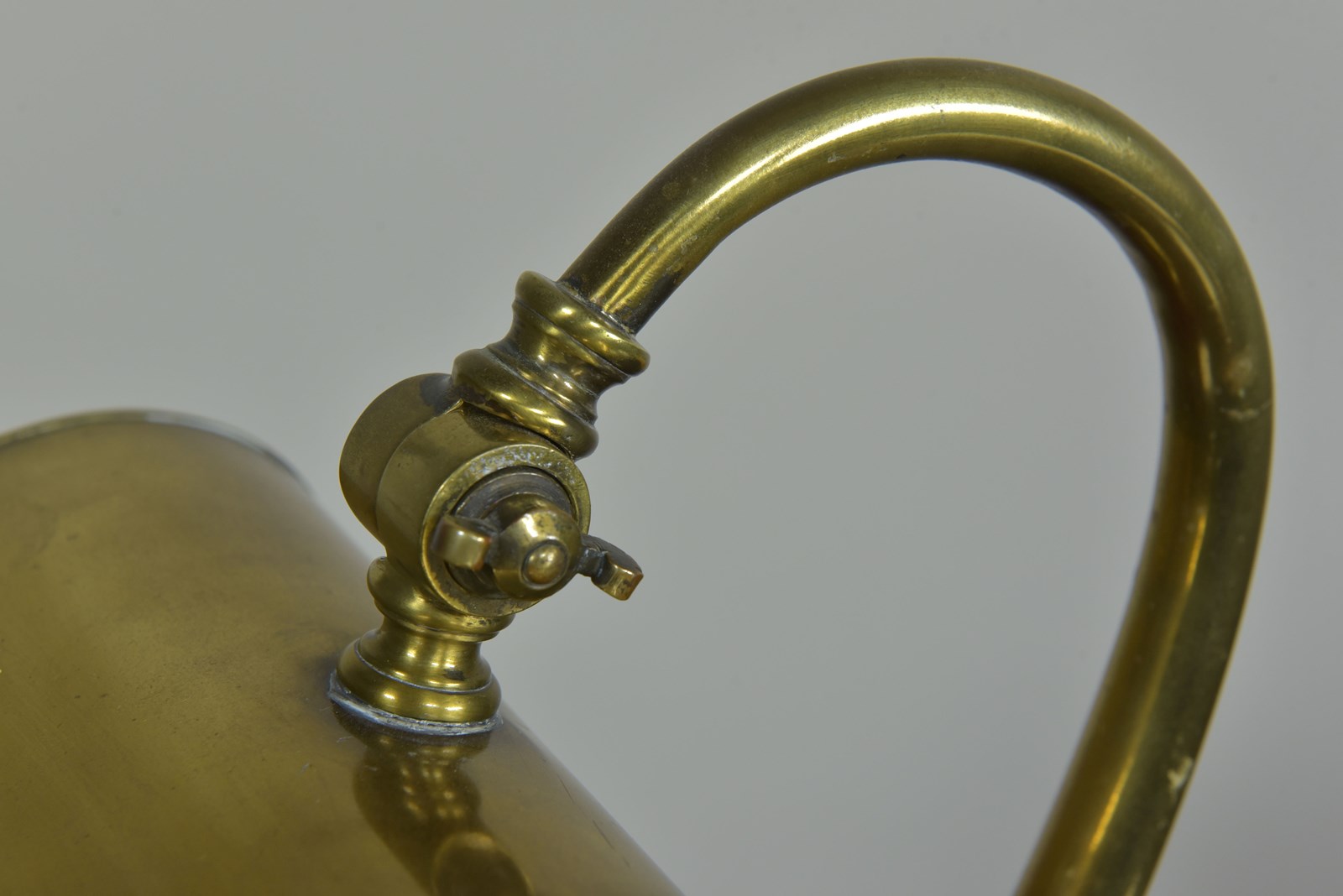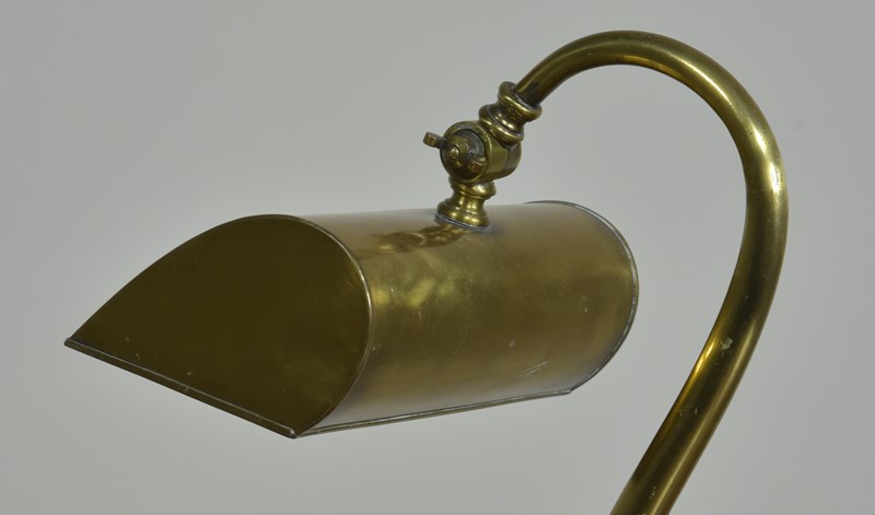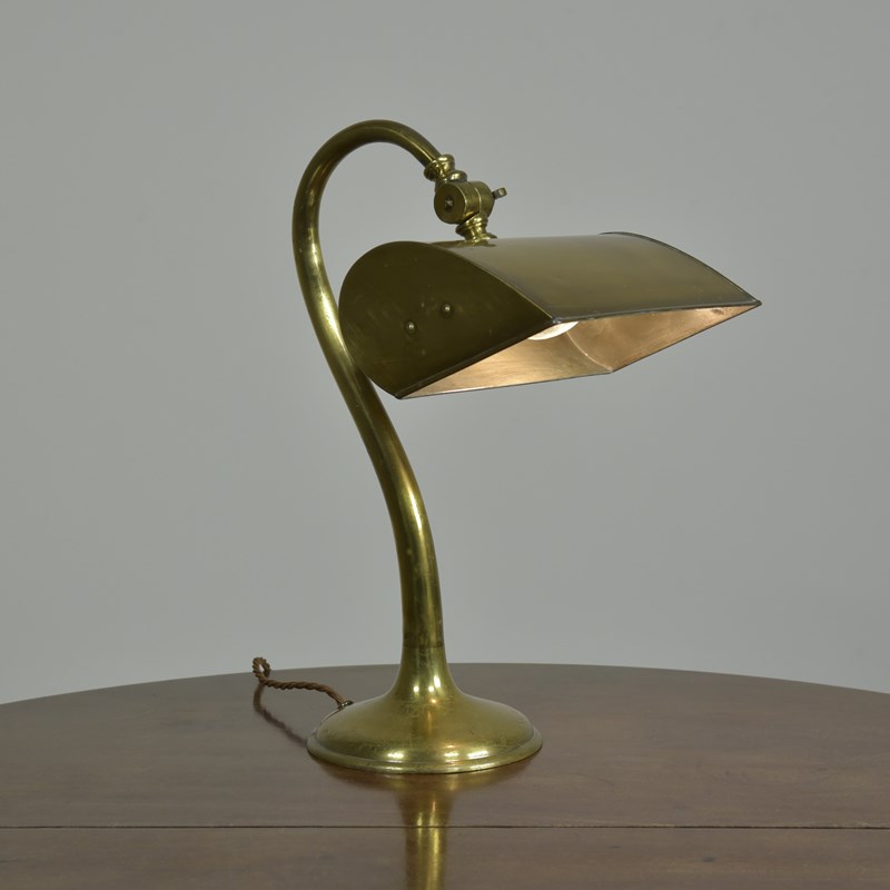 An unusual, gracefully tapering, cast brass swan necked bankers lamp. English approx 1920s