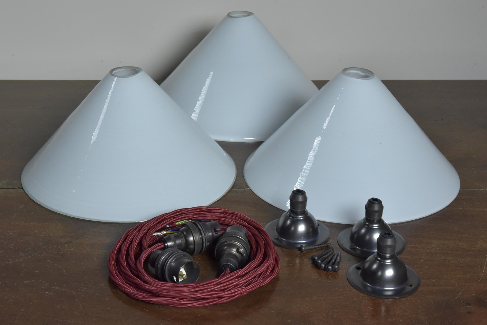 A vintage trio of conical coolie shades with all fittings (see pics).