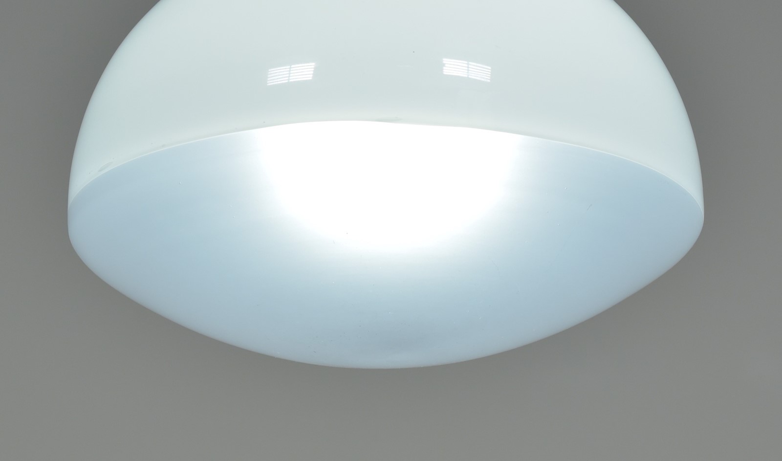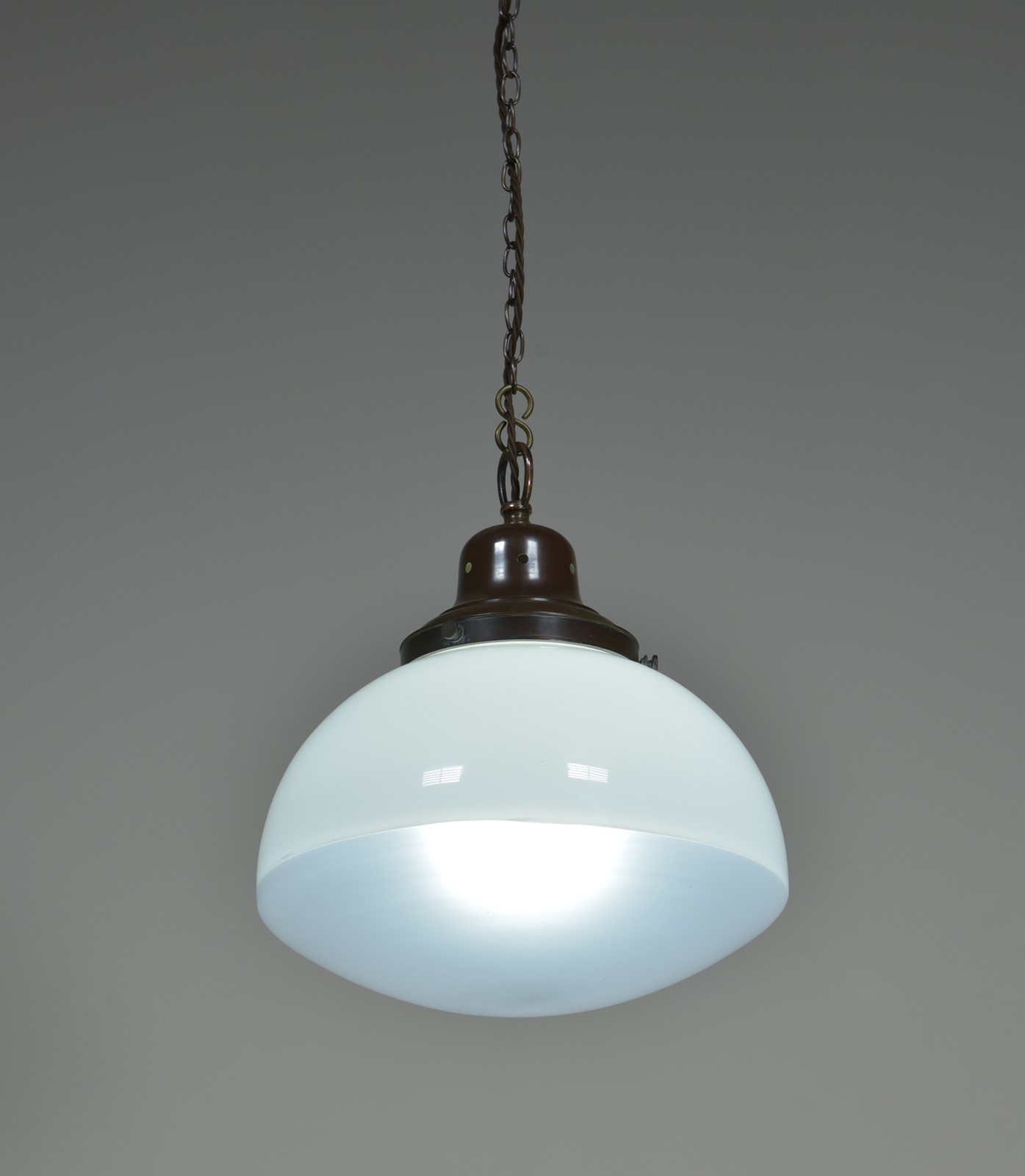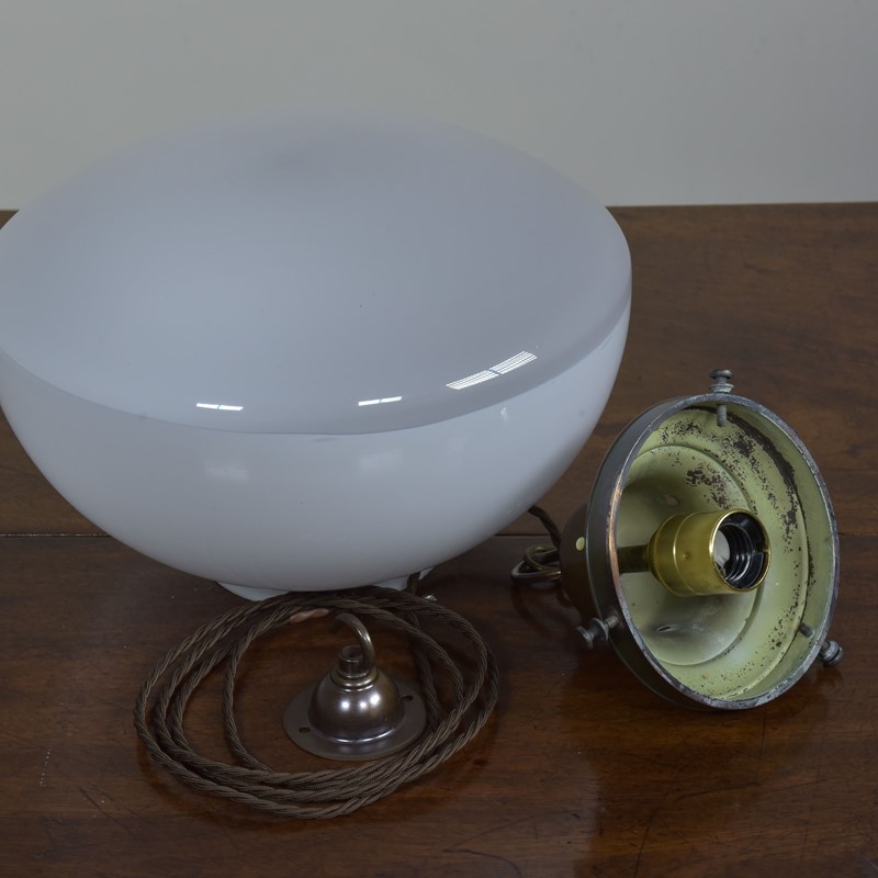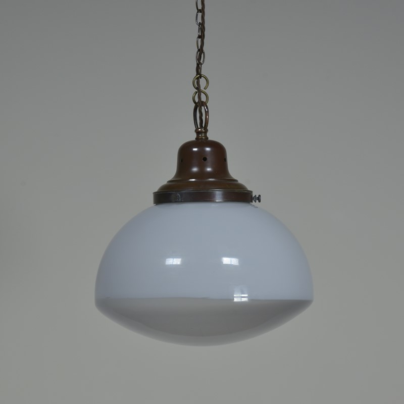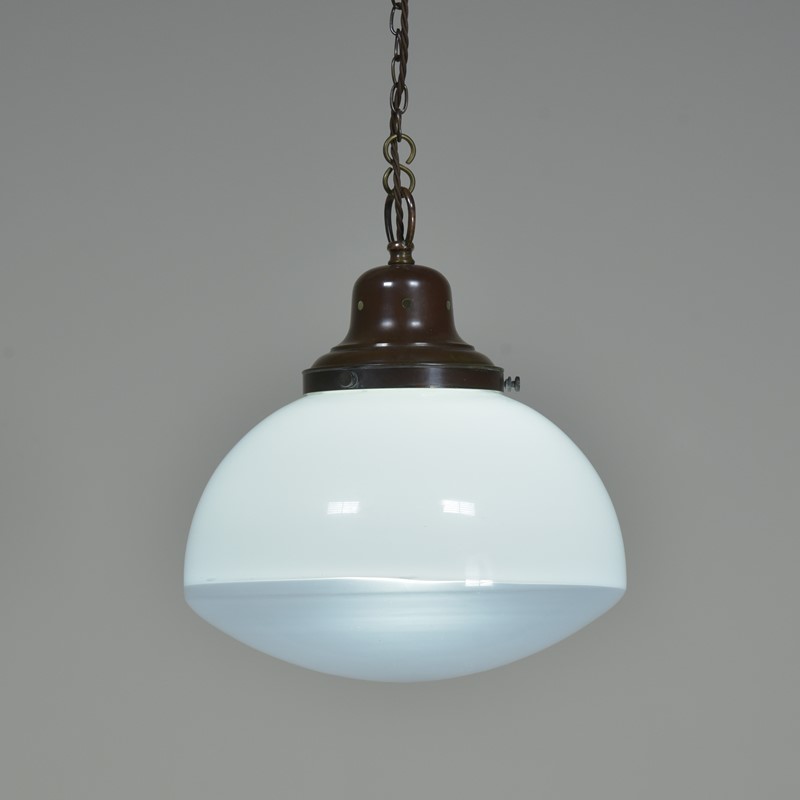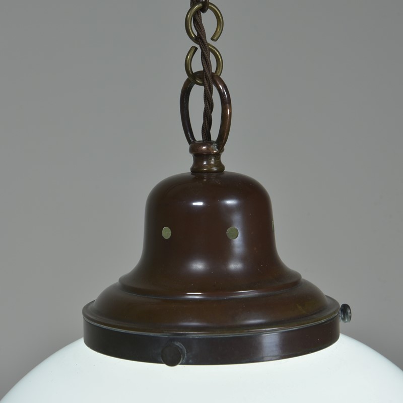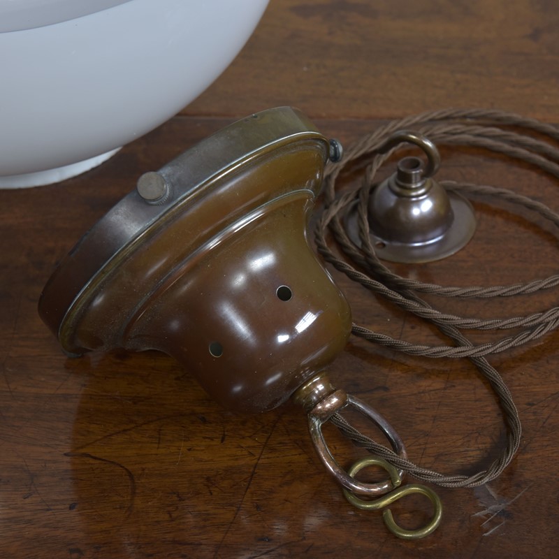 An unusual opaline / translucent glass pendant light with a very good original patinated brass gallery and hanging loop. Rewired with a new brass ES lampholder, 2 meters dark brown fabric flex. Comes with new hooked ceiling plate in patinated brass. Brass S hook included. Solid patinated brass chain can be supplied in whatever length required. Dimensions in inches/cms; 12.25"/31cm diameter. 14"/35.5cm tall. 2.25kg.