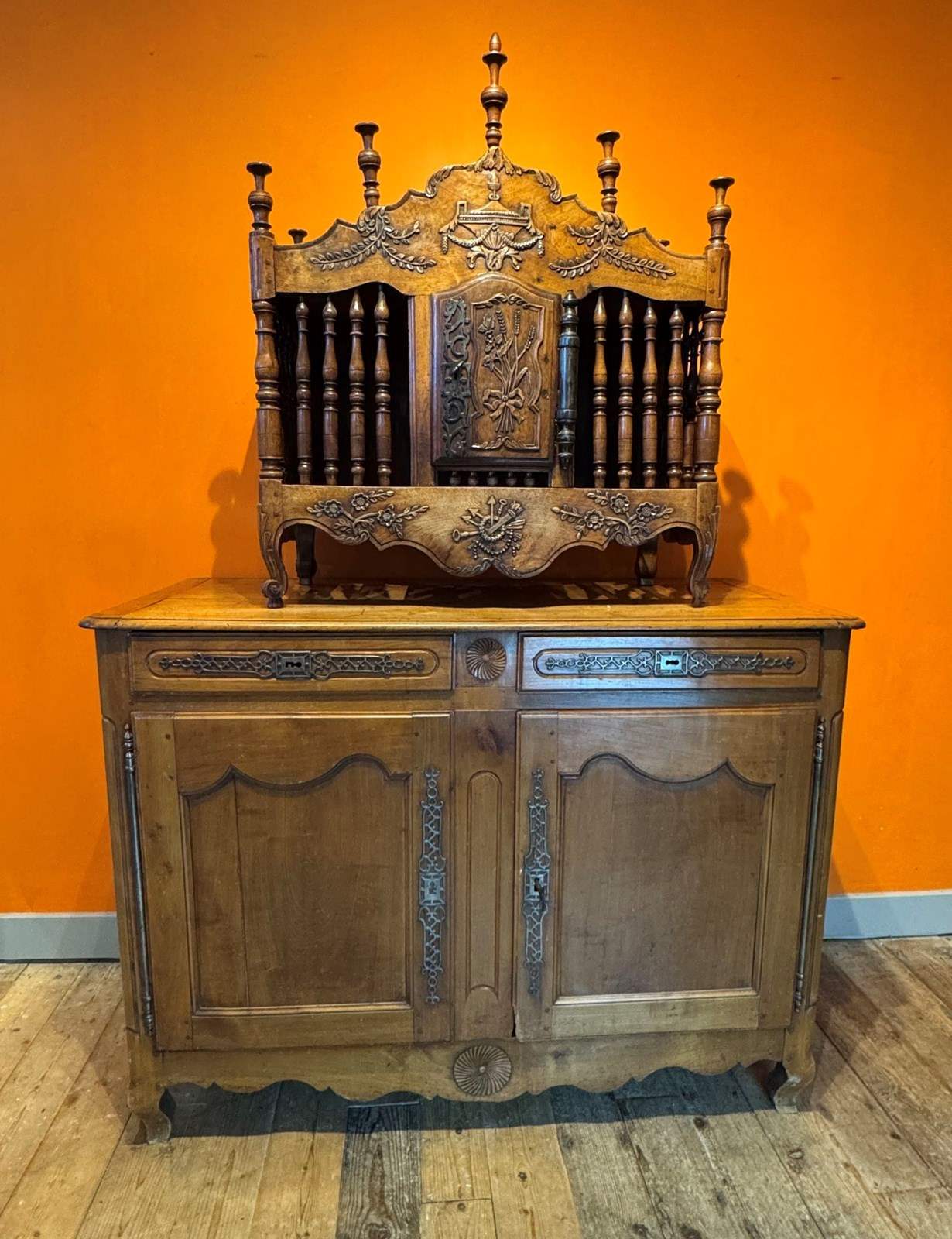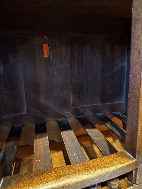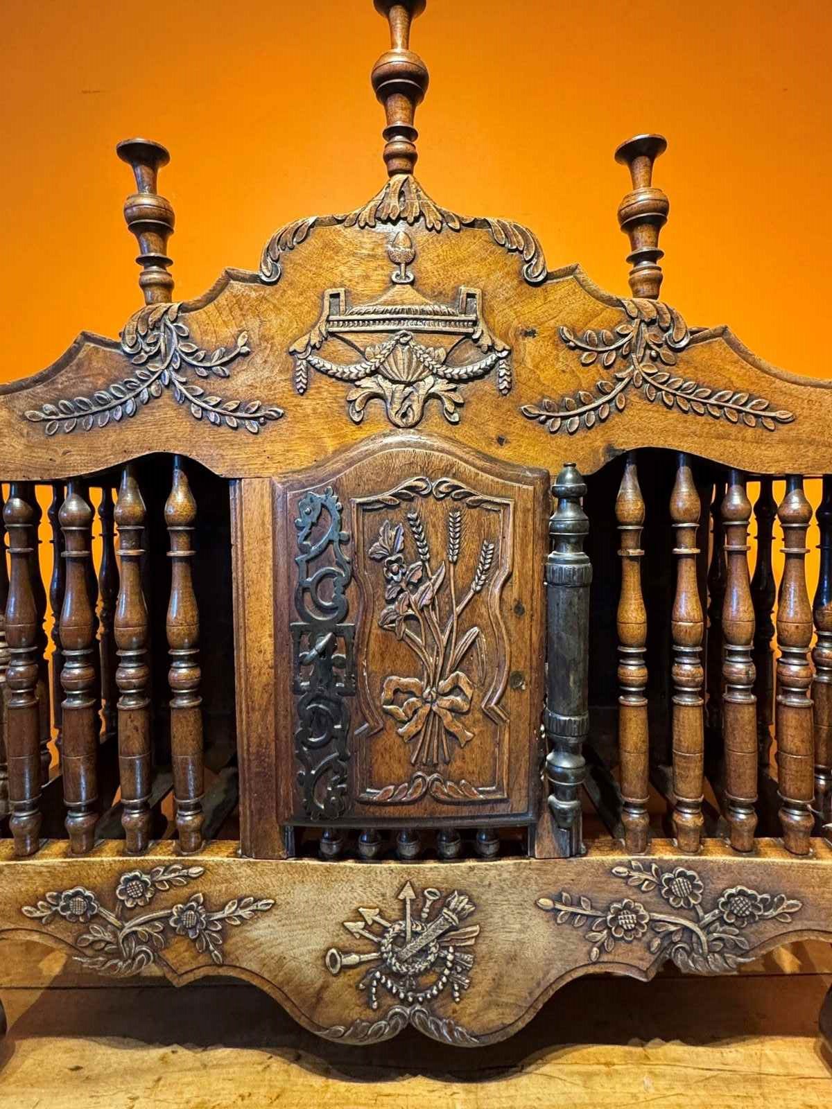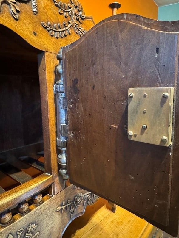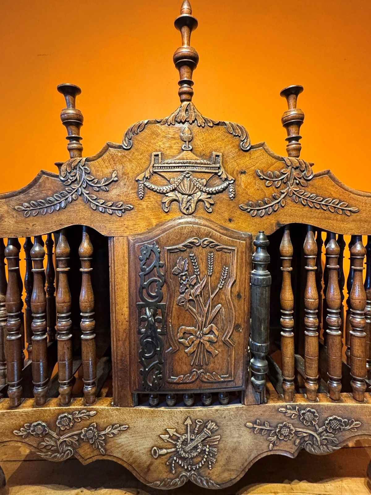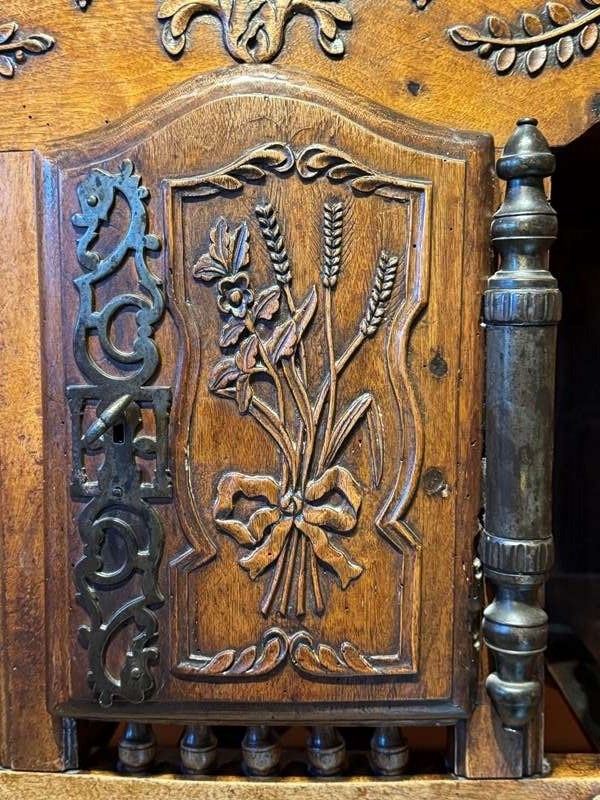 A lovely example of a French walnut Provencal panetière or food cupboard dating from the late 18th / early 19th Century, with turned finials and rails to the front and sides, the shaped frieze carved with a swagged urn flanked by foliage, the central door decorated with wheat sheaves and ribbon tied flowers and with large steel hinge, piered escutcheon and original working key, the shaped apron carved with a quiver, arrows and keys within a wreath, raised on foliate carved cabriole legs and scroll feet. The interior with slatted bottom and panelled back with hanging hooks for wall mounting.