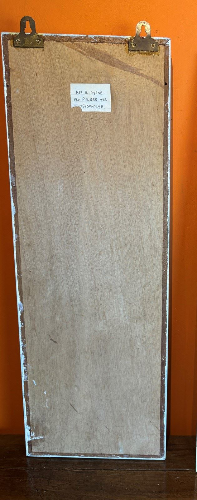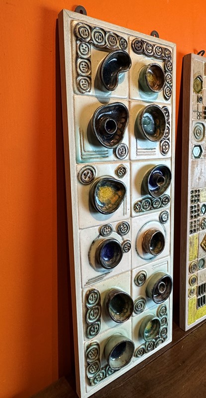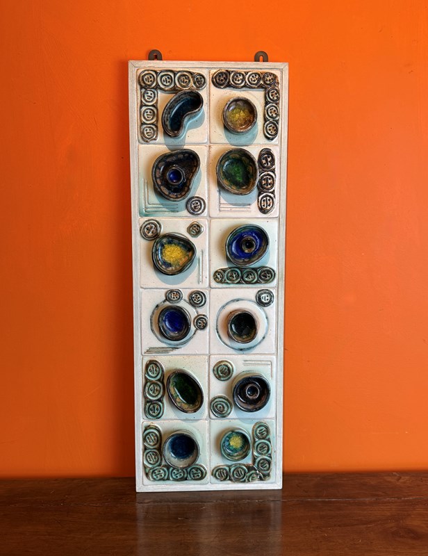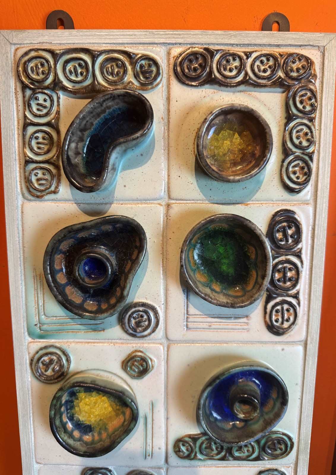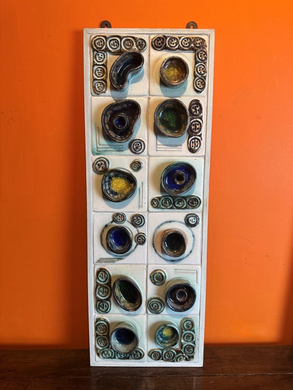 A funky 1970's ceramic tile panel, formed from12 individual tiles applied with a dished from in varying shapes and glazes, mounted on a backboard and with wooden frame. The reverse with attached paper label inscribed 'Mrs E Byrne, 130 Pioneer Avenue, Desborough.