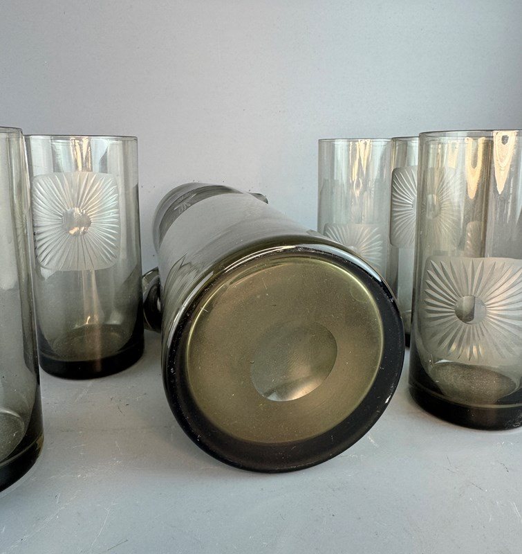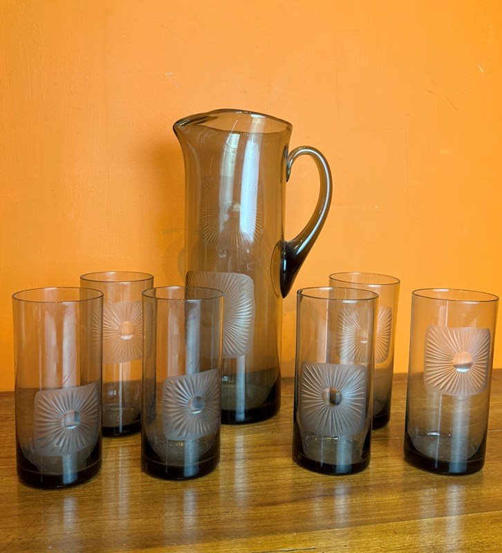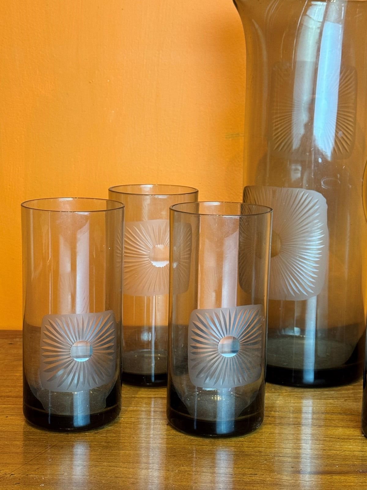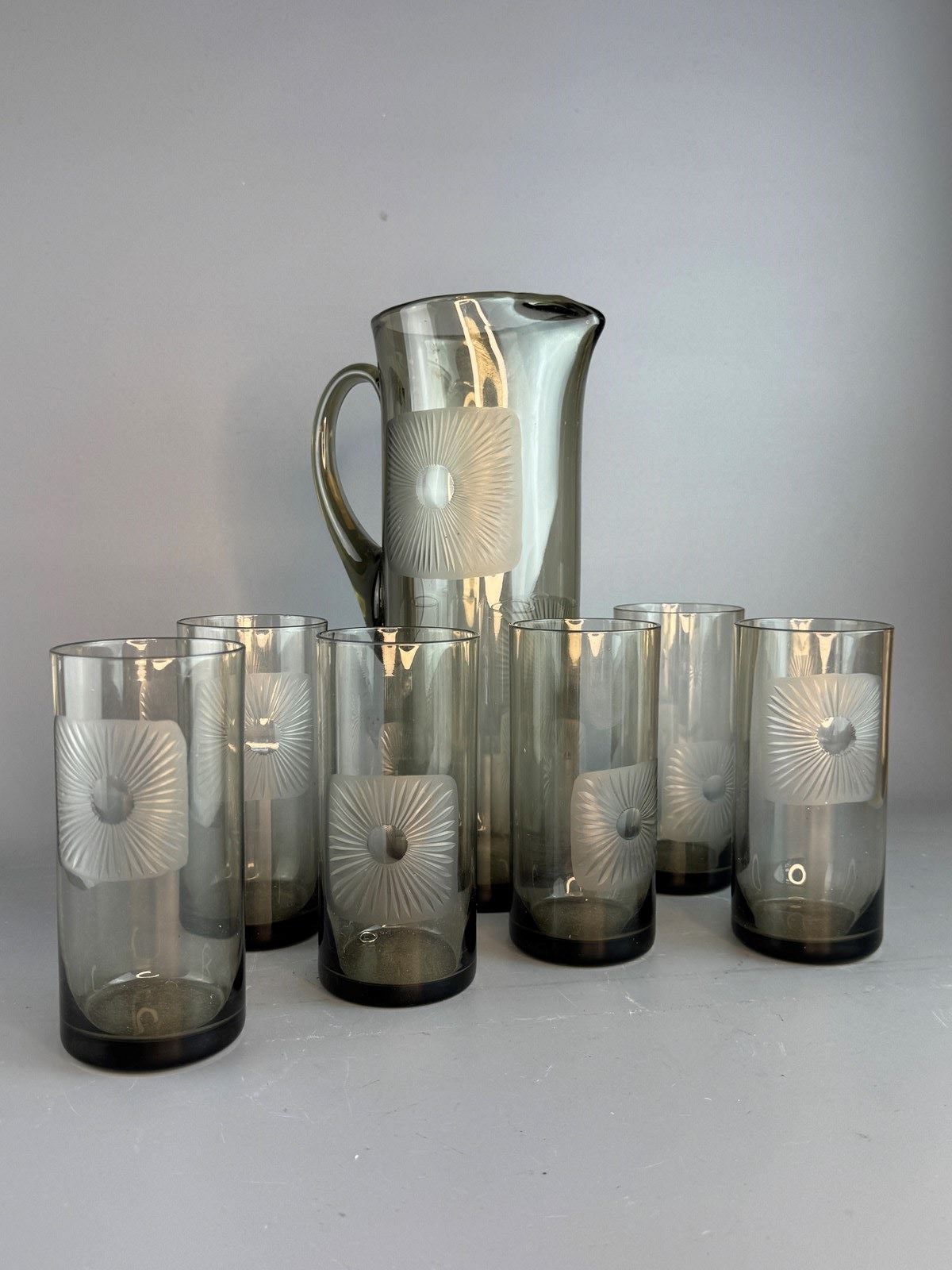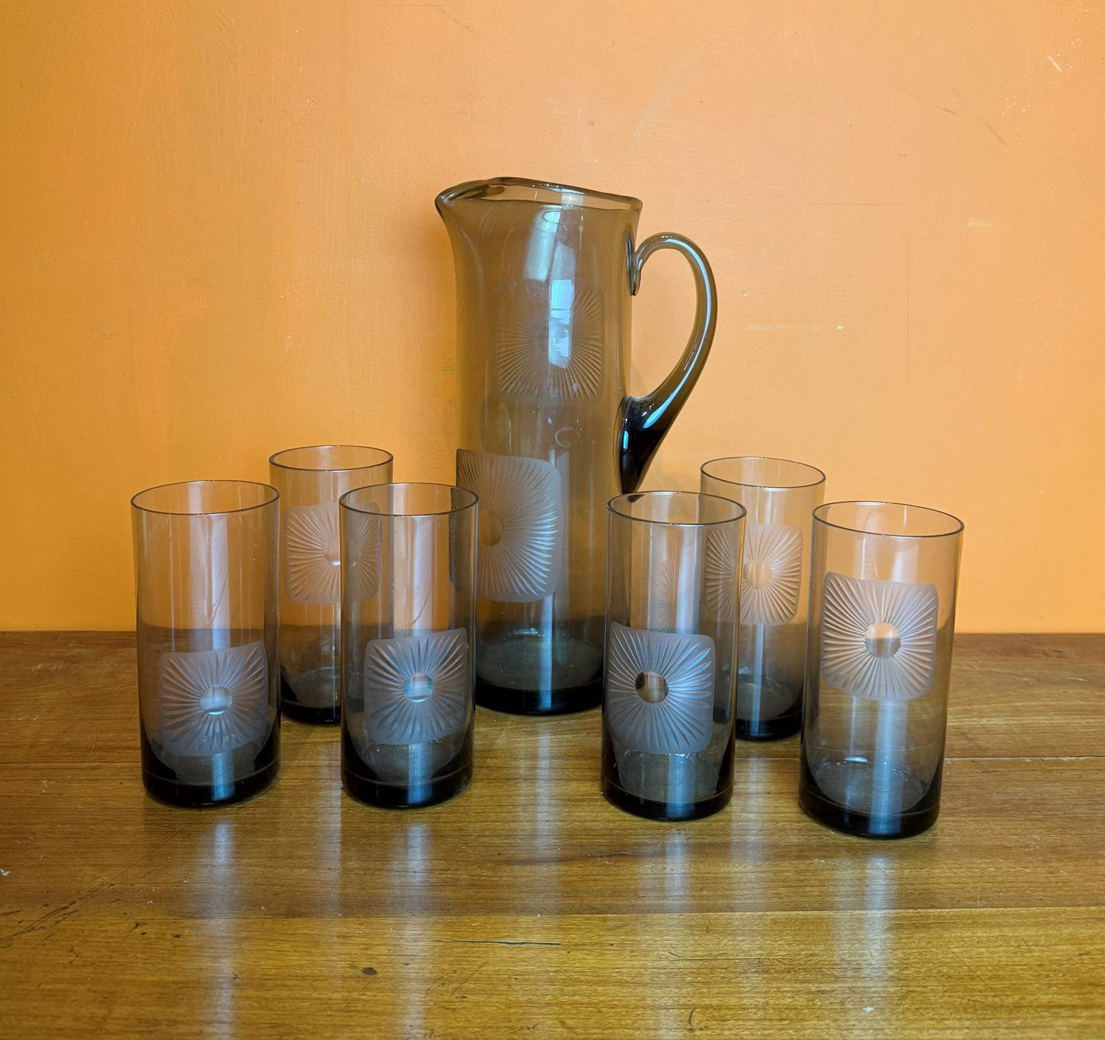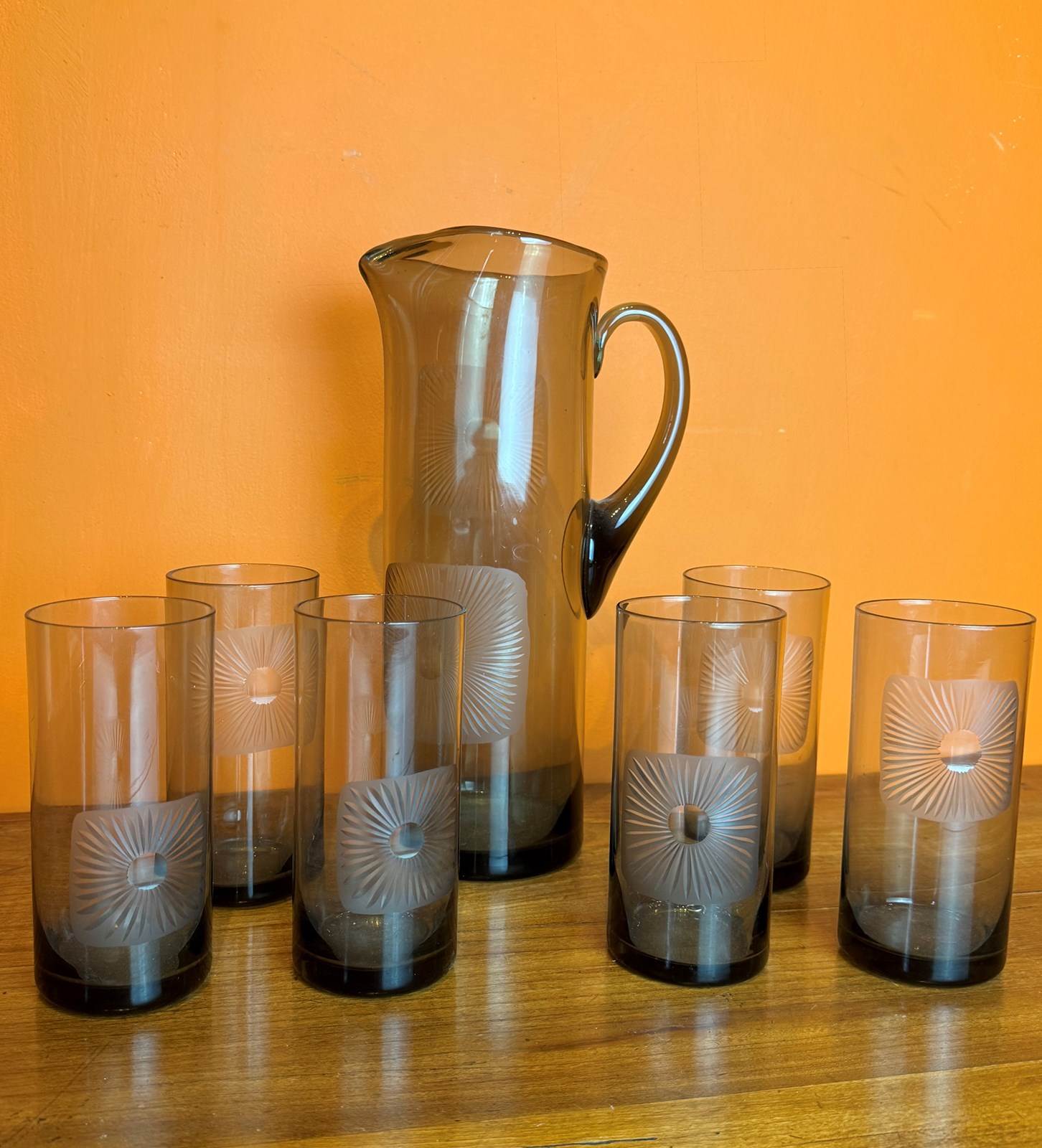 A 1970's Danish smoked glass water or lemonade set, possibly Holmegaard, comprising a jug and six highball glasses, hand-blown with cut sunburst decoration to the glasses and ground pontil to the bases.