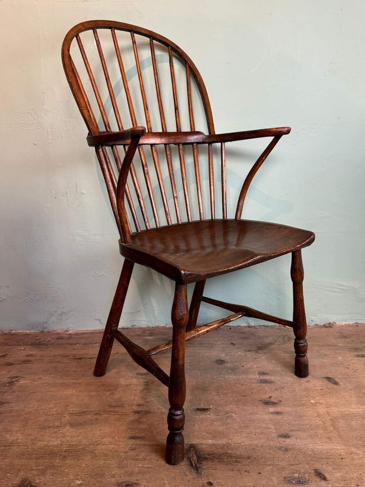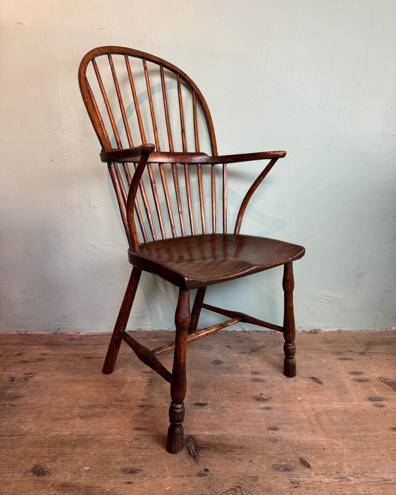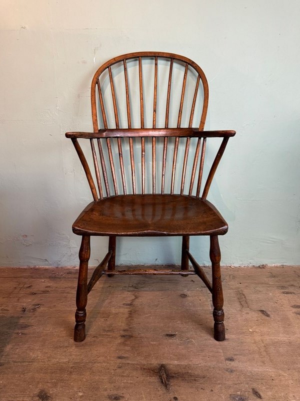A 19th century ash and elm hoop and comb back elbow chair with saddle seat, on turned legs united by an H-stretcher.