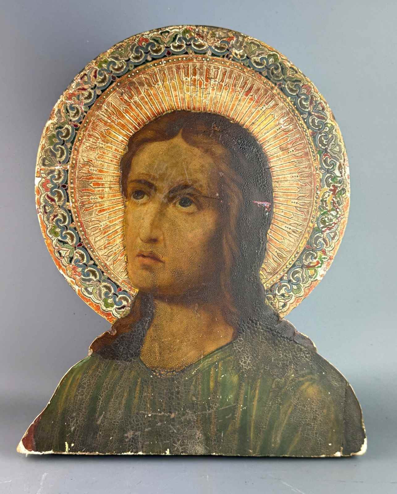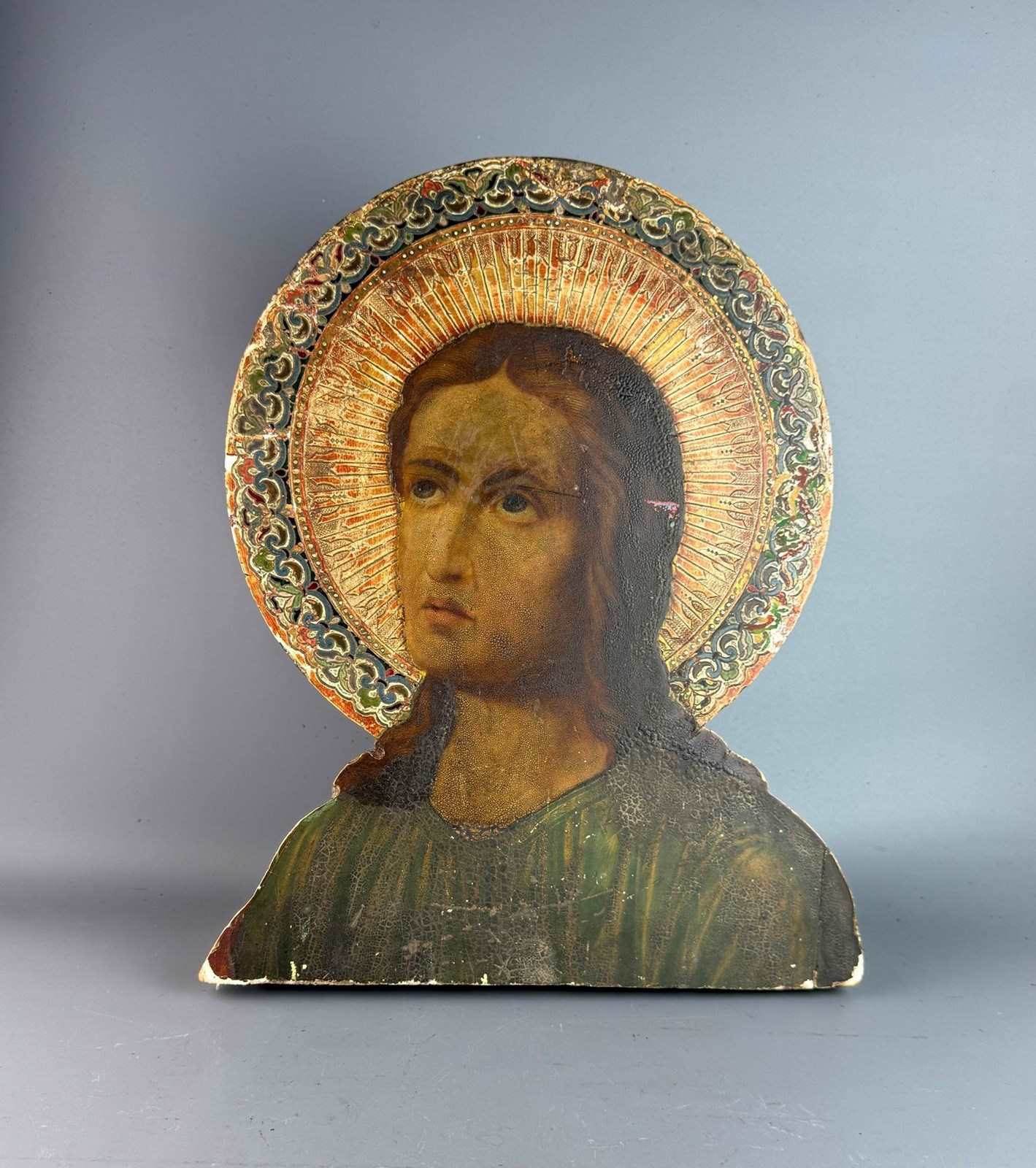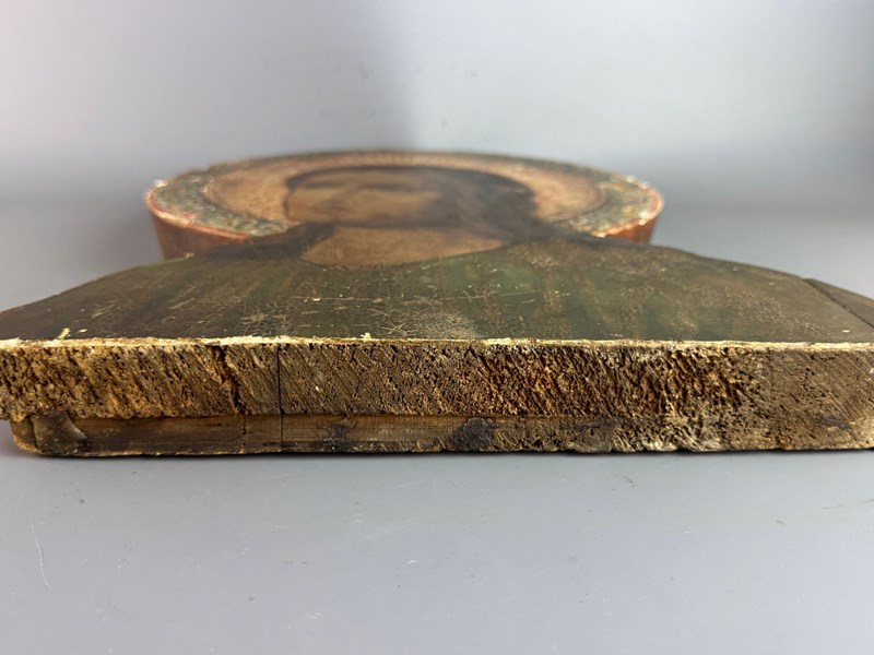 19th Century Sicilian School, head and shoulders of christ, oil on panel with sgraffito decorated gesso nimbus in Byzantine style.