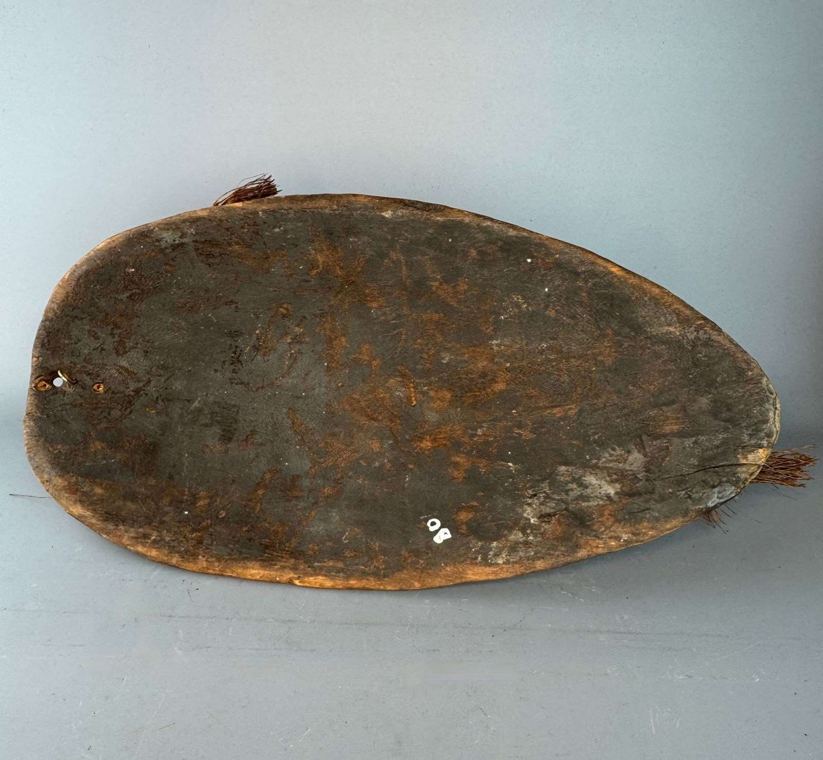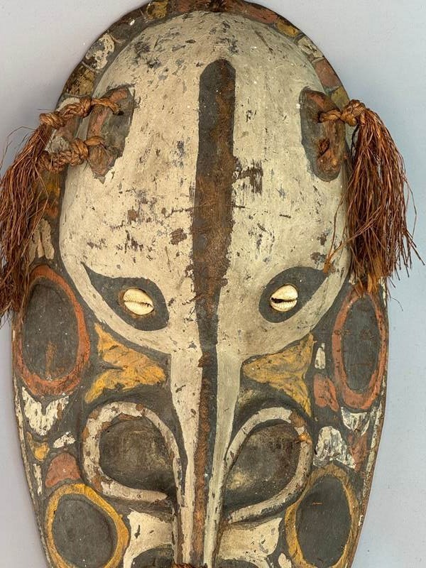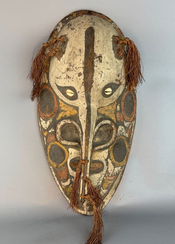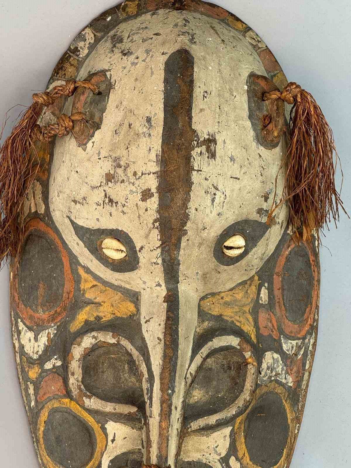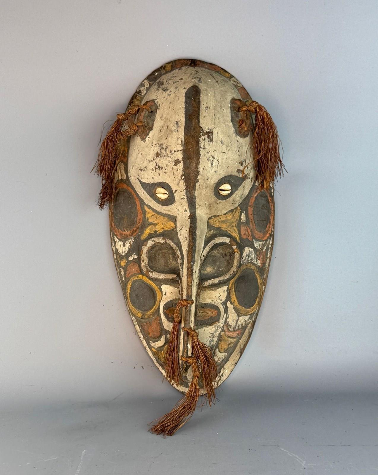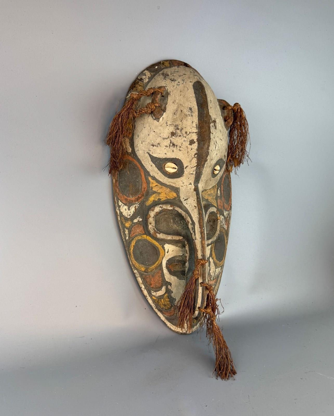 A Yessan 'Mwai' mask, Middle Sepic River, Papua New Guinea, carved wood decorated with pigment and fibre and with cowrie shell eyes.