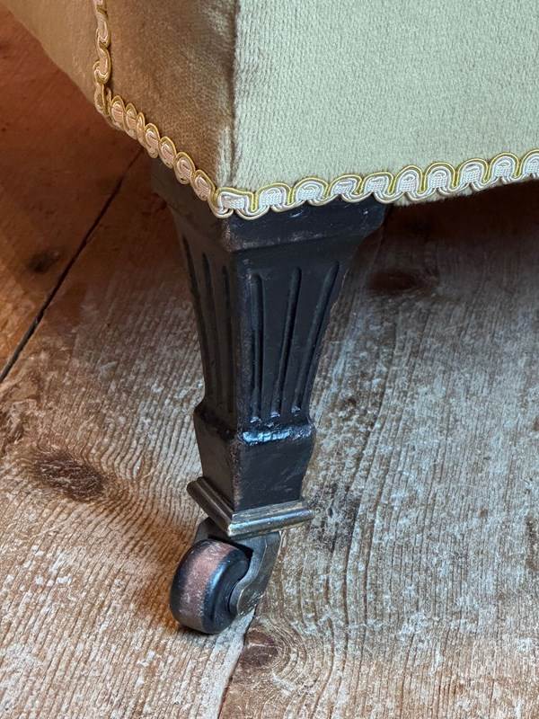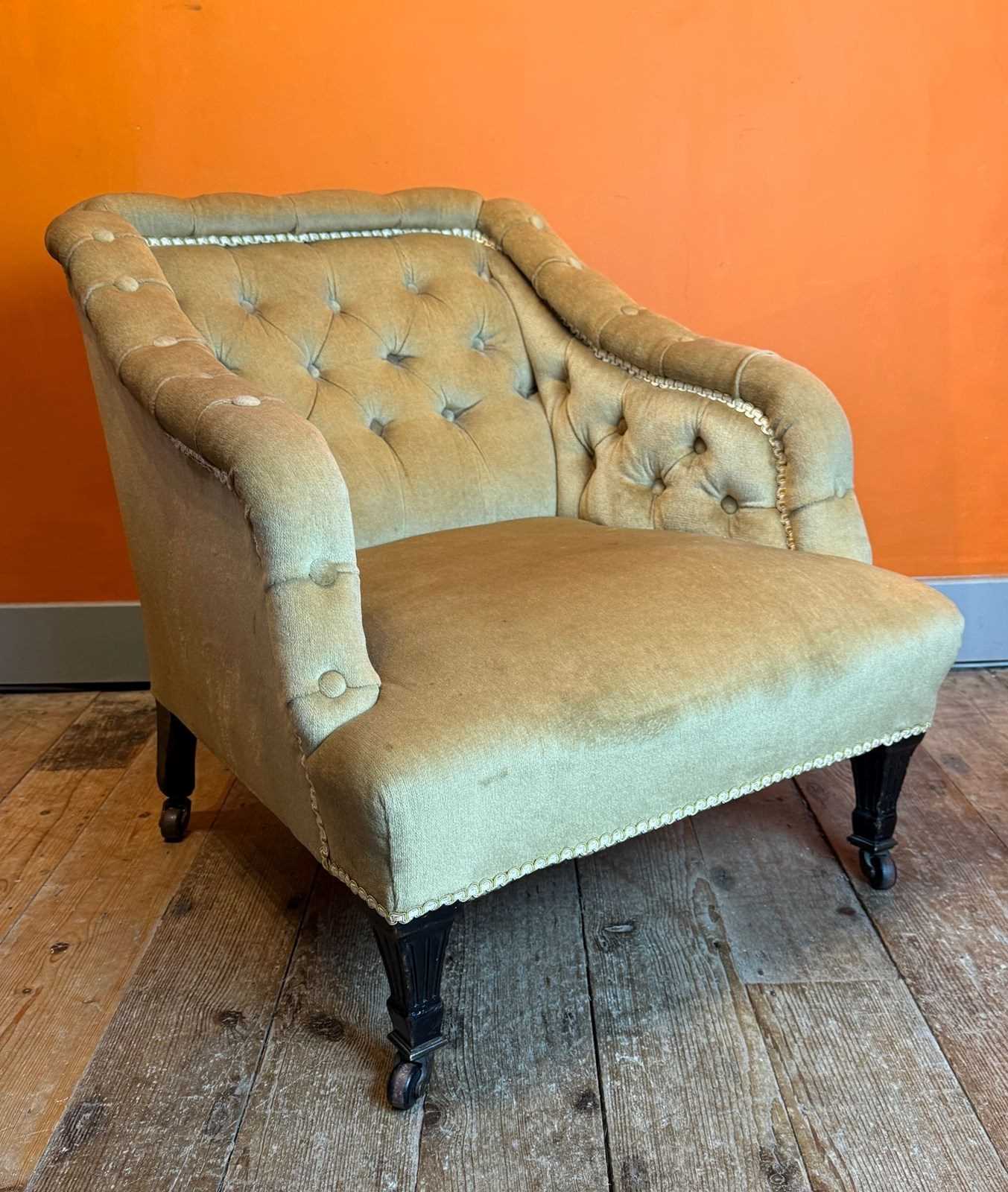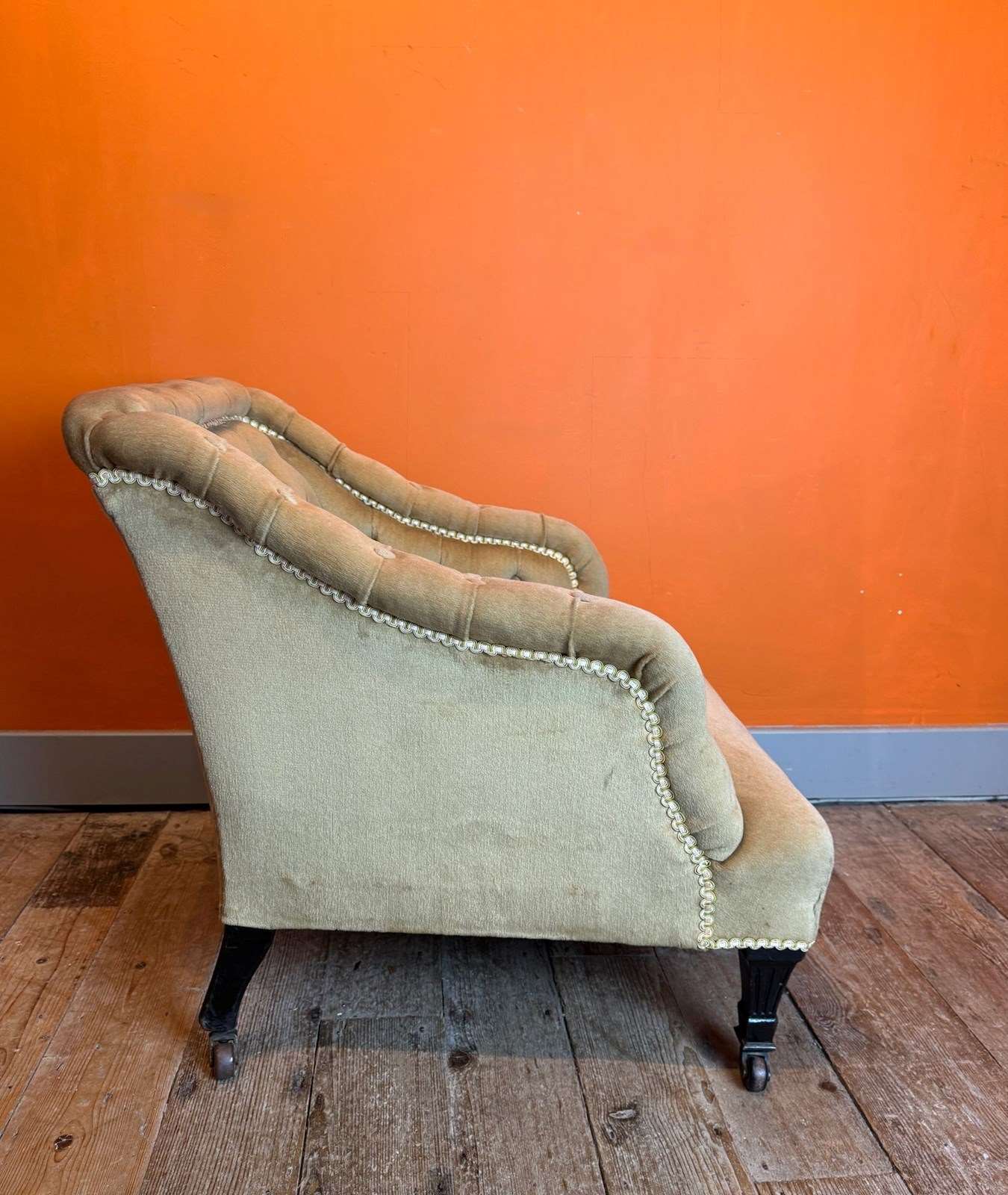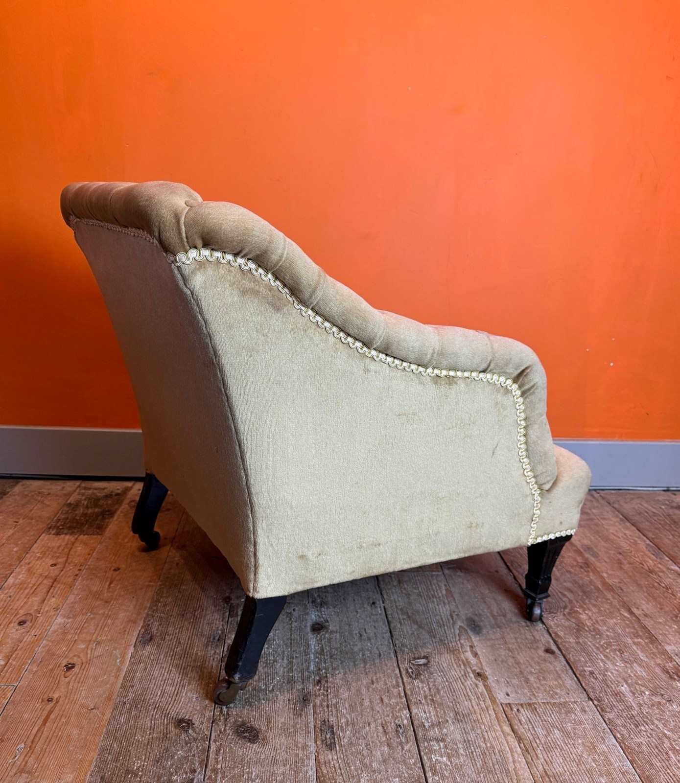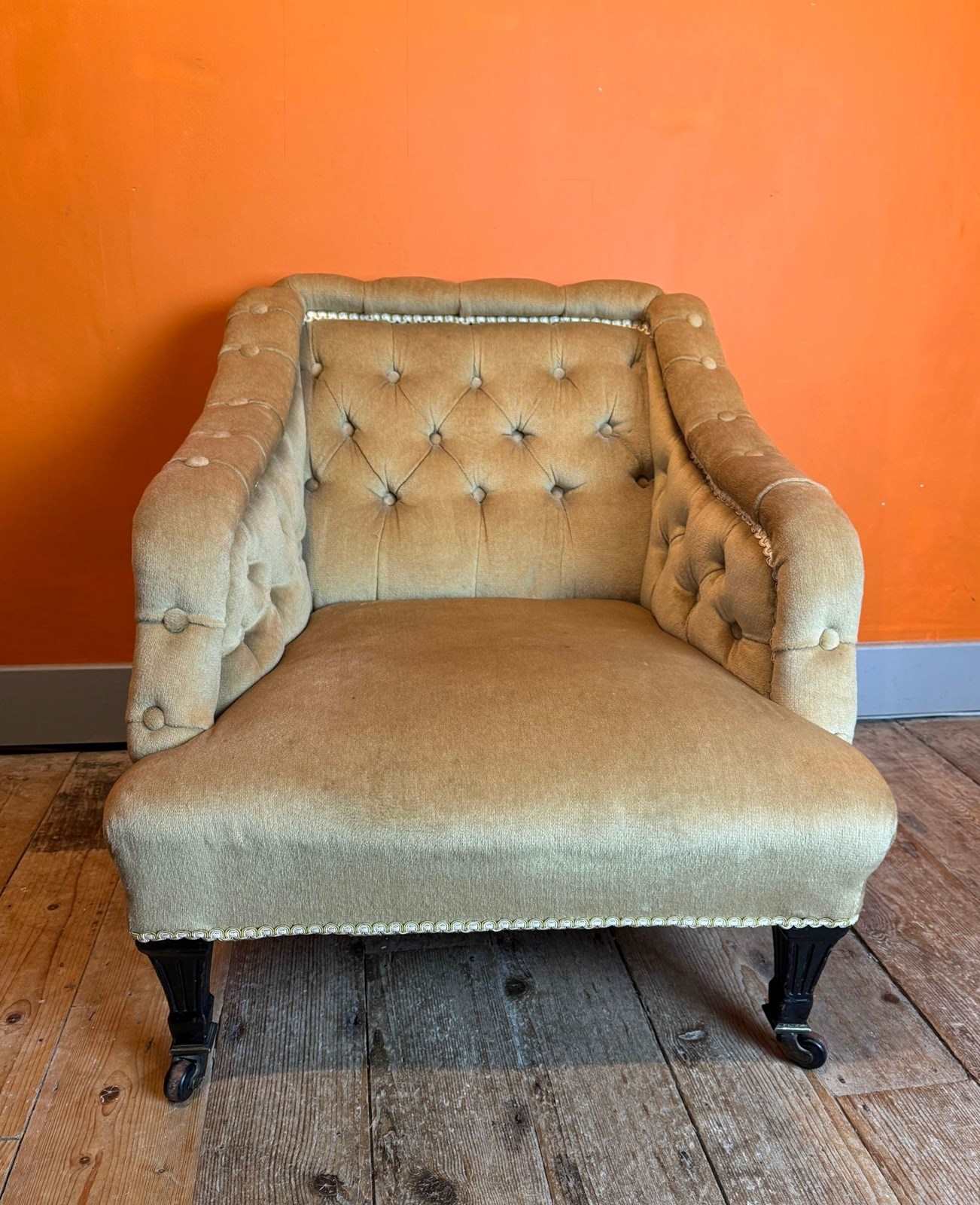 A comfortable, mid size occasional chair, in good structural condition with original castors. The upholstery is in good condition but not new. It's perfectly serviceable but would benefit from a steam clean / refresh. I can arrange re-covering with my upholsterer and supply fabric if required - please get in touch for further details.