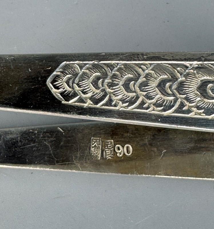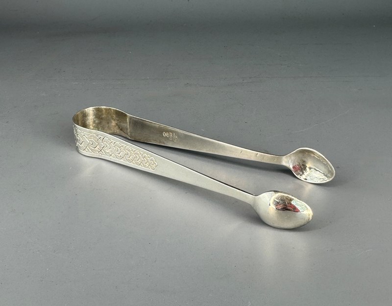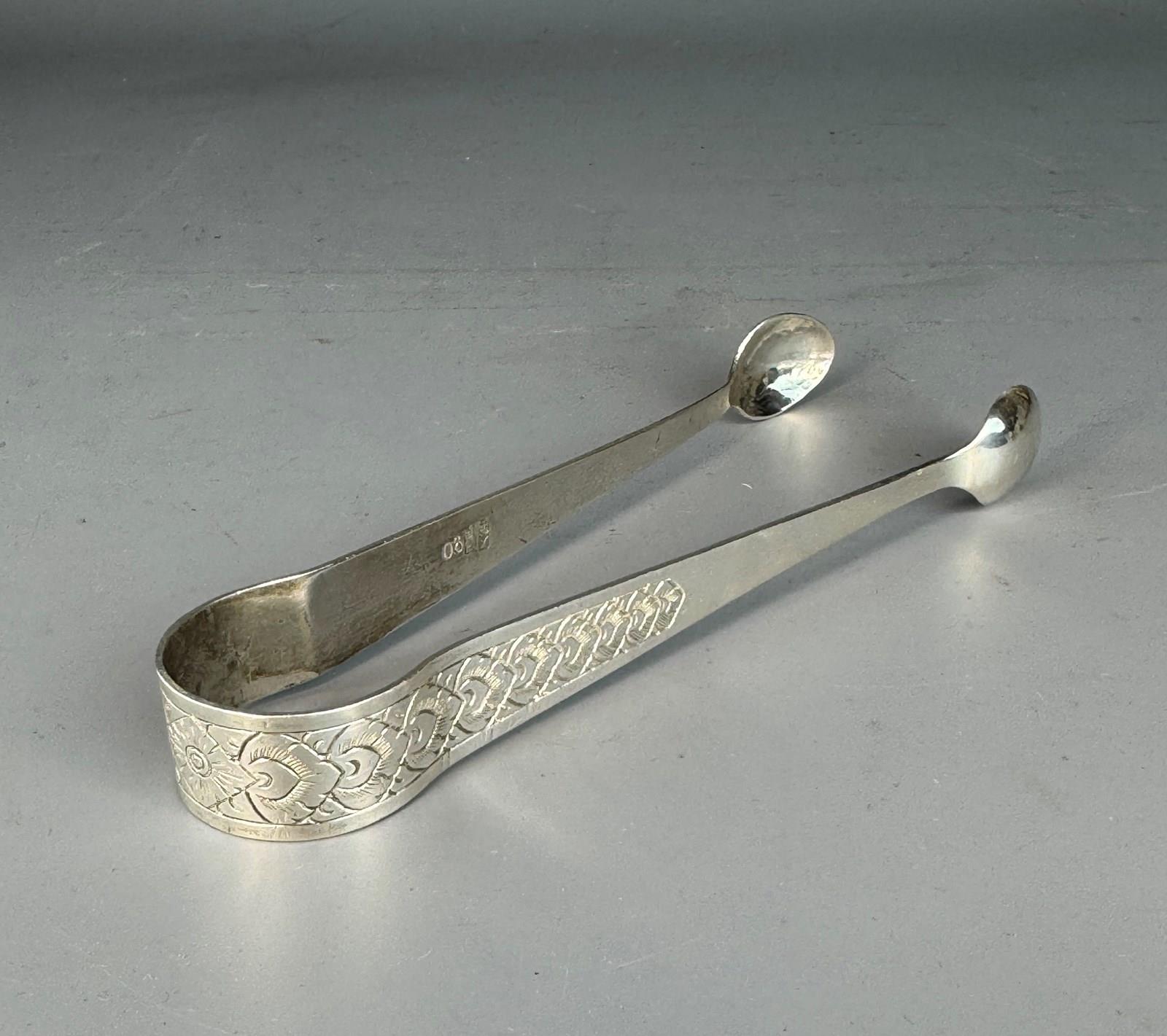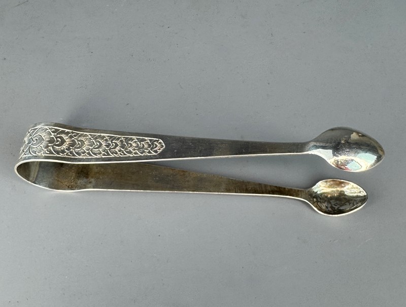A pair of Cantonese silver sugar tongs with foliate engraving.