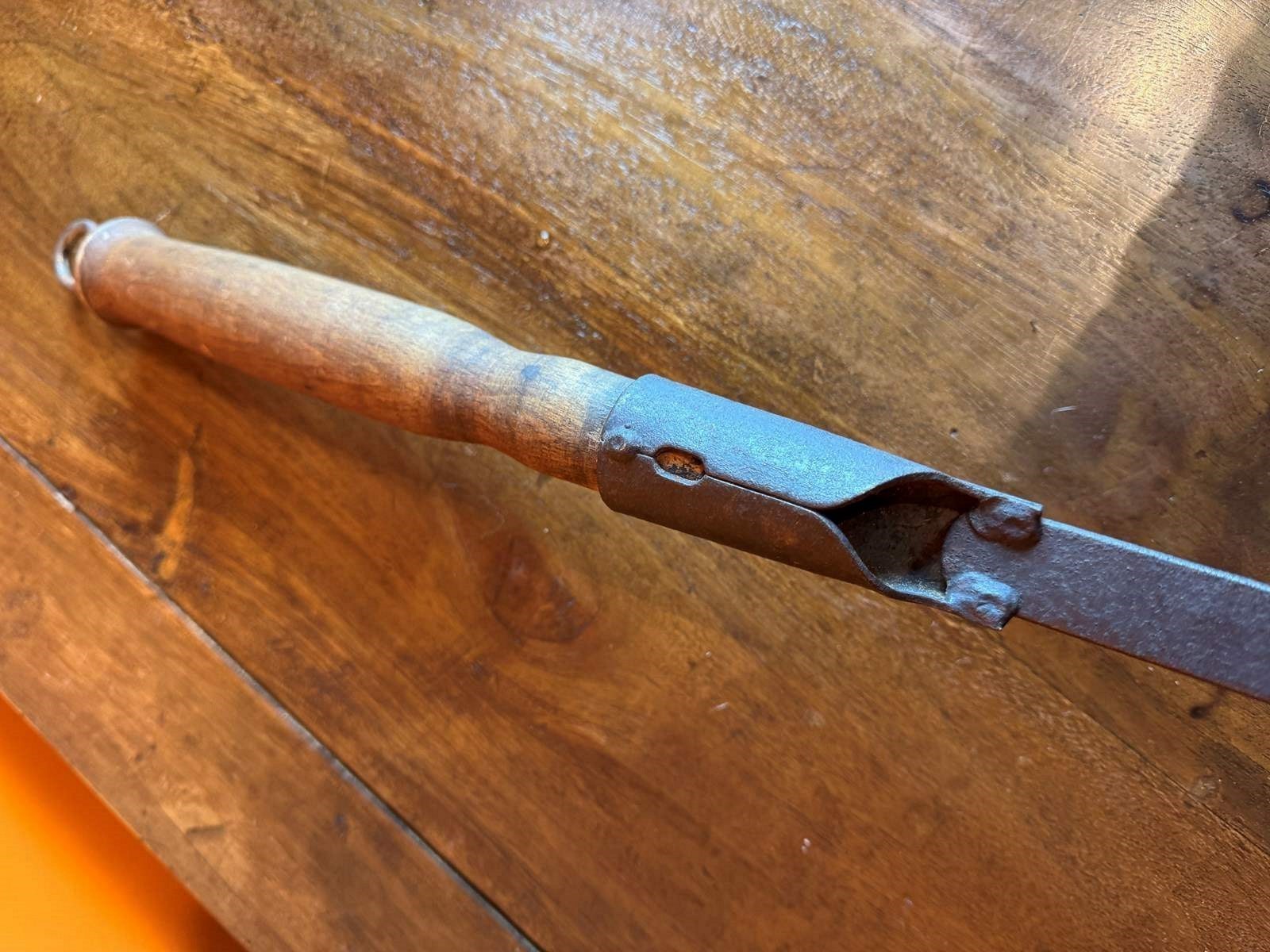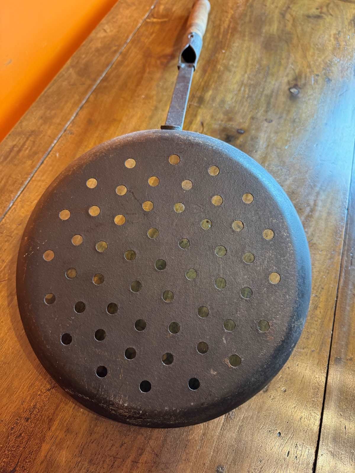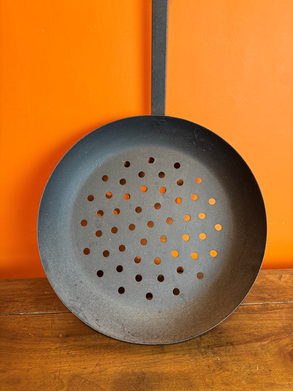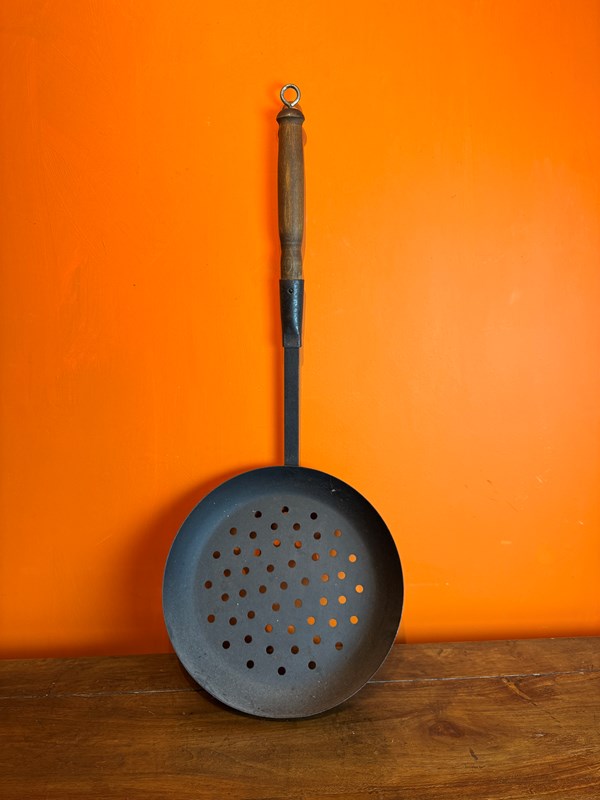 An antique chestnut roaster, the pierced dished iron pan with and oak handle and with a later hanging loop to the end.