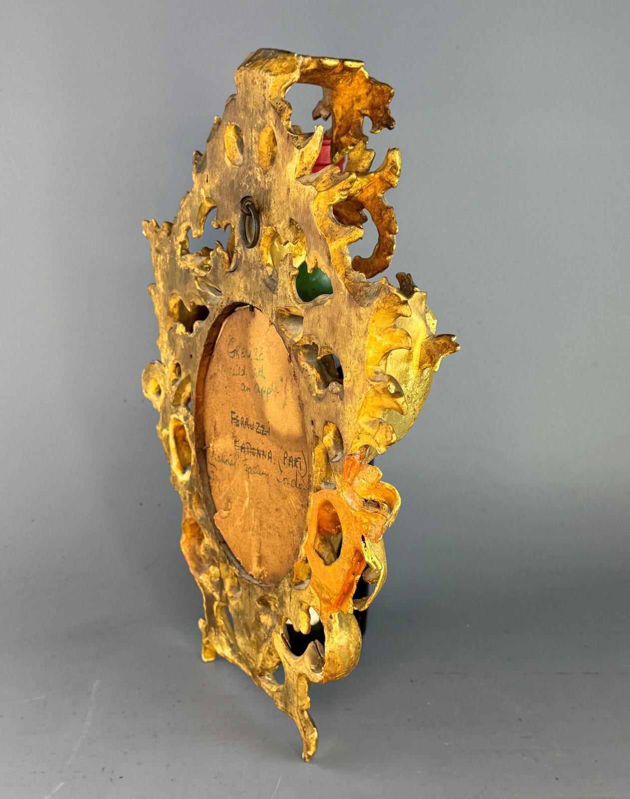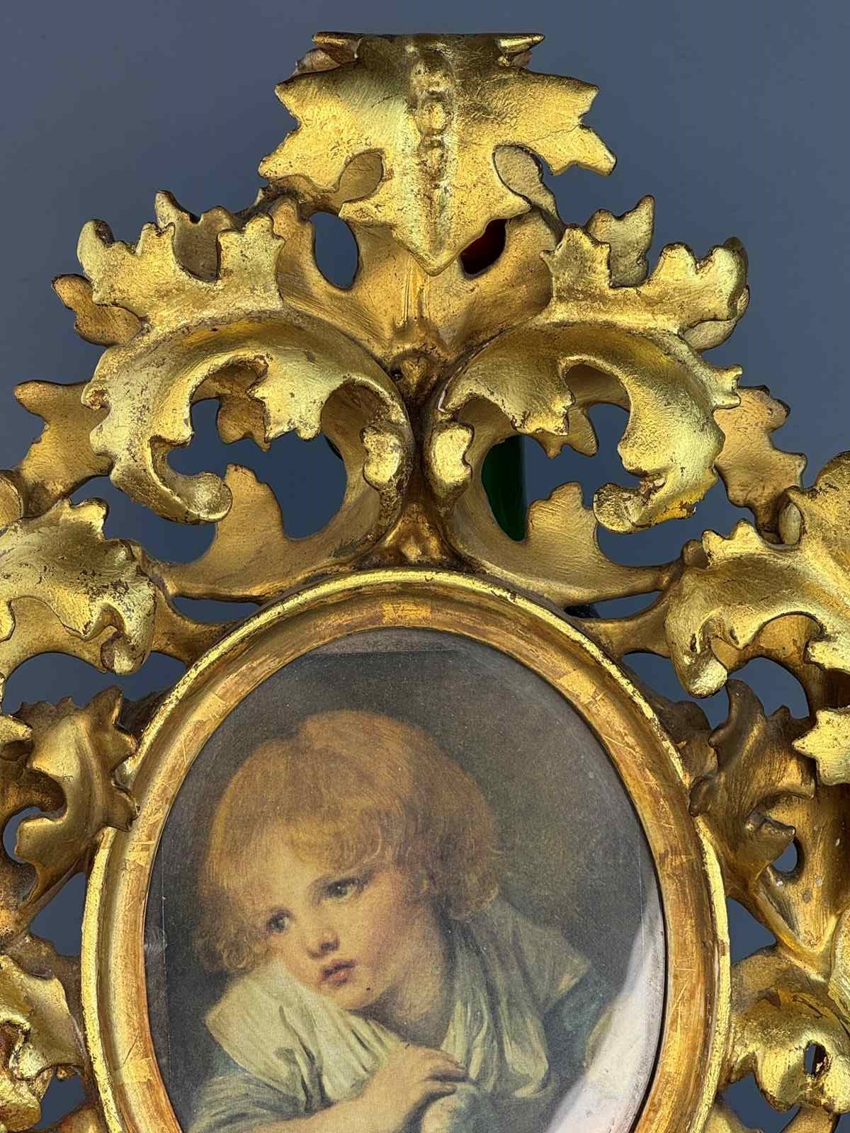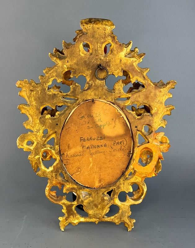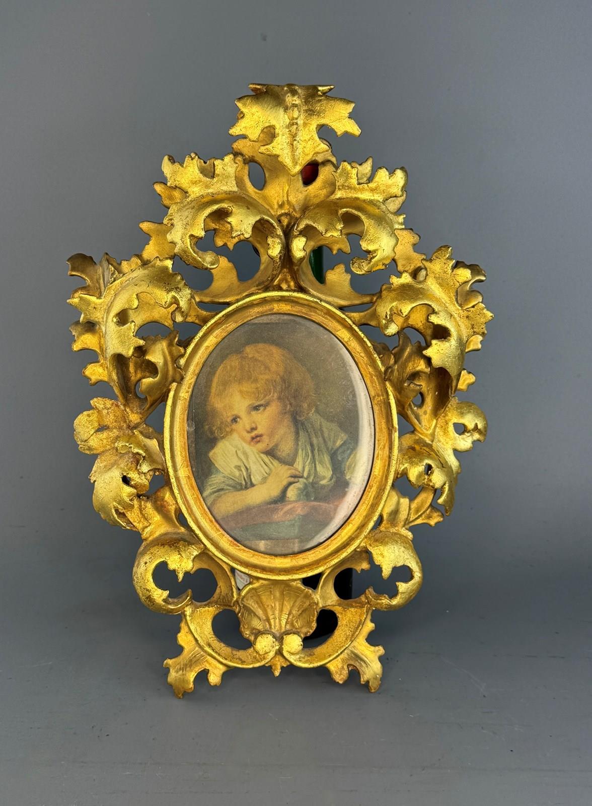 An antique Florentine gilt-wood frame, deeply carved in high relief with foliate scrolls and with glazed oval aperture now containing a coloured print. With original gilded finish, some very good old repair to the left hand side.