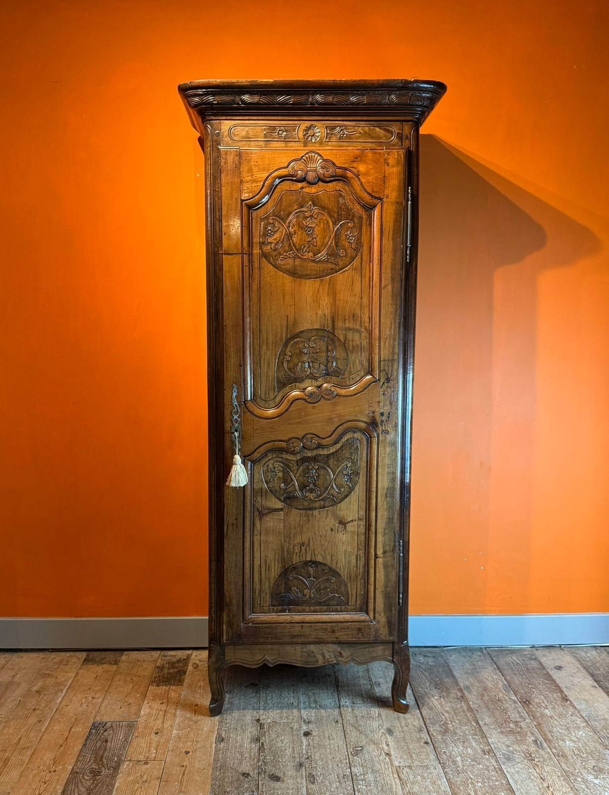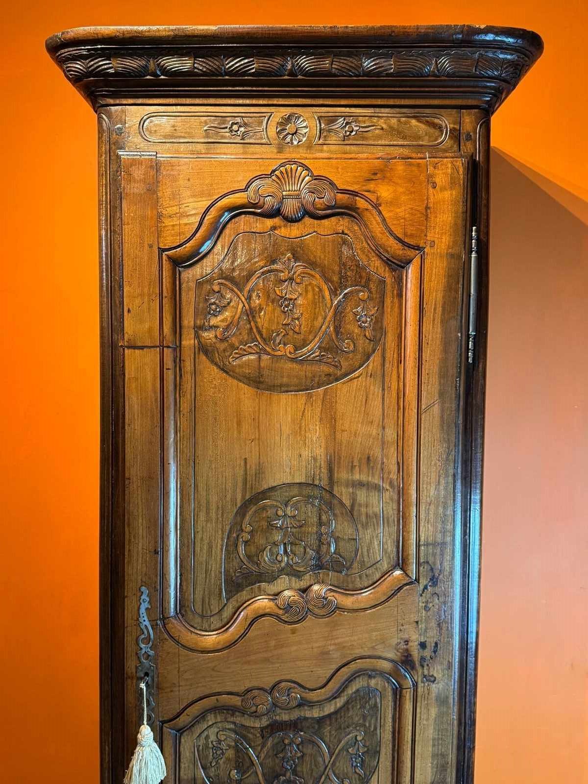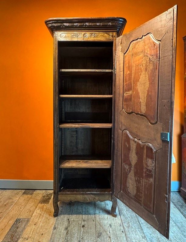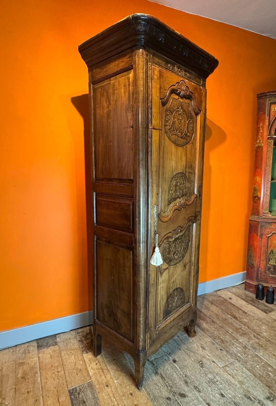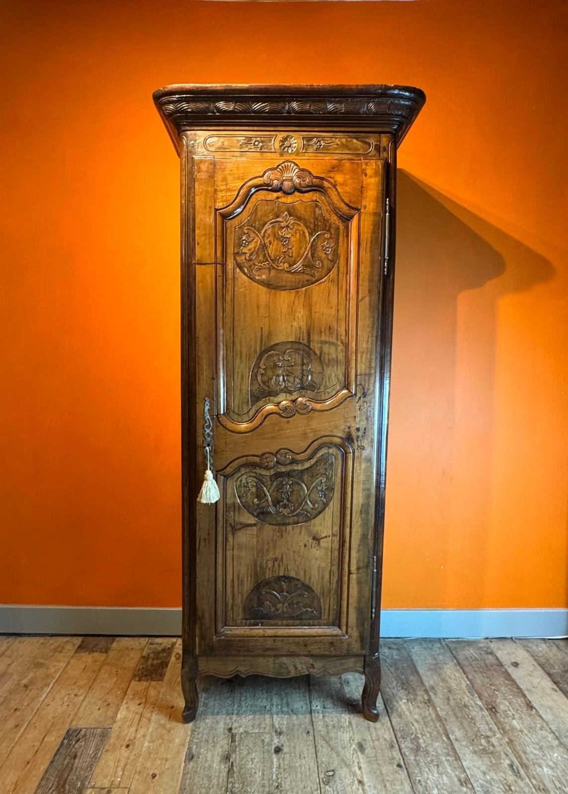 A charming French walnut bonnetiere / narrow armoire in Louis XV taste, late 18th / early 19th Century, with single scroll and folitate carved panel door, raised on scroll feet, the interior with five adjustable shelves, with pierced metal escutcheon and original working key.