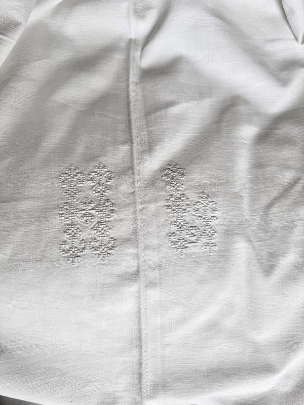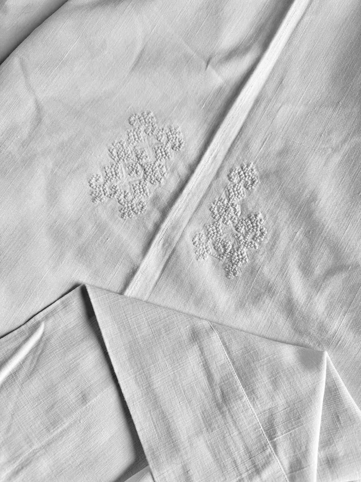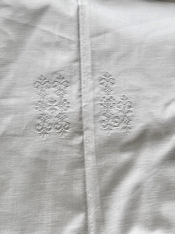 An antique French monogrammed double dowry sheet of snowy white soft homespun monogrammed H.L. in raised stumpwork stitches, made from two lengths of homespun joined down the centre with tiny hand-stitching.