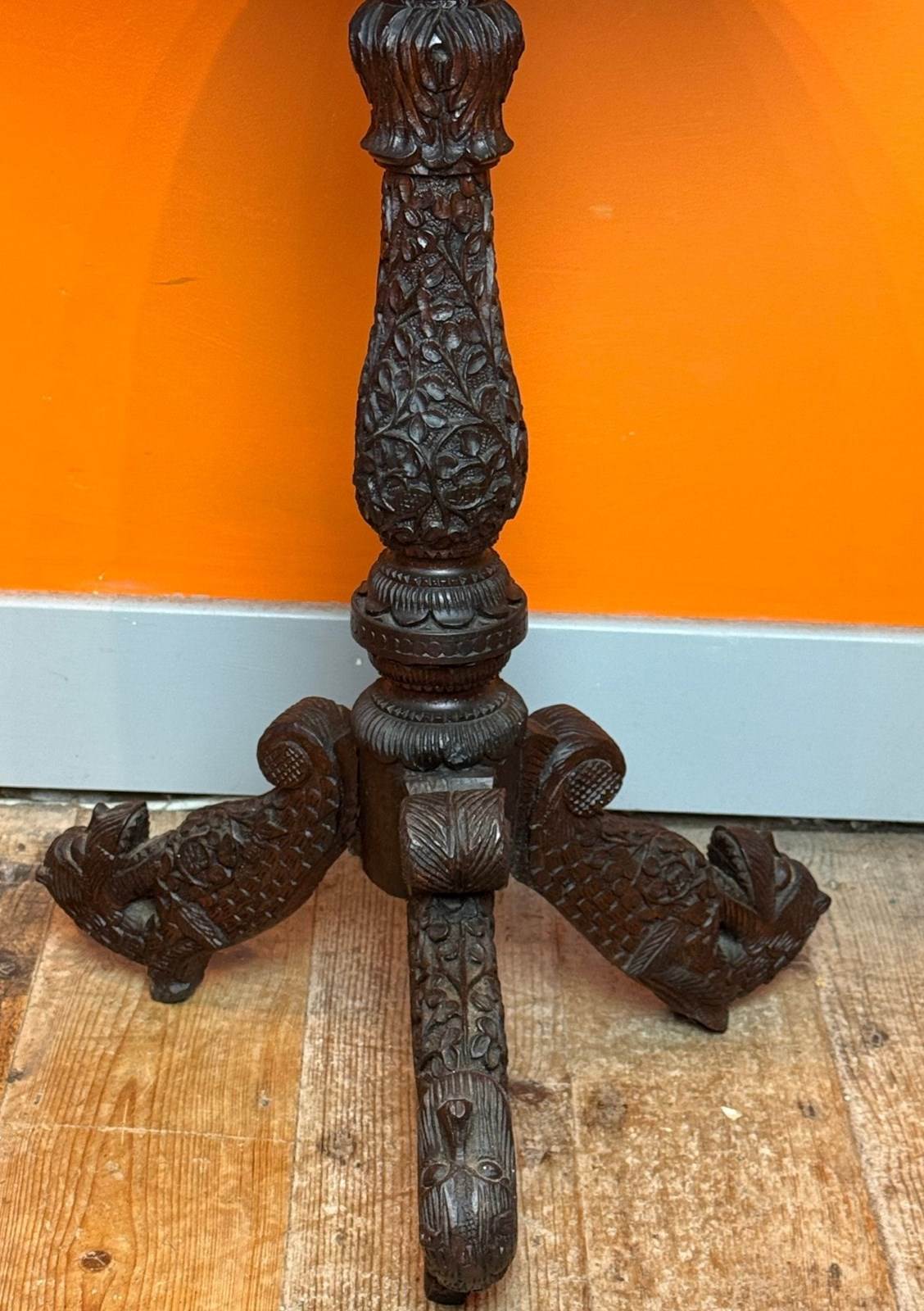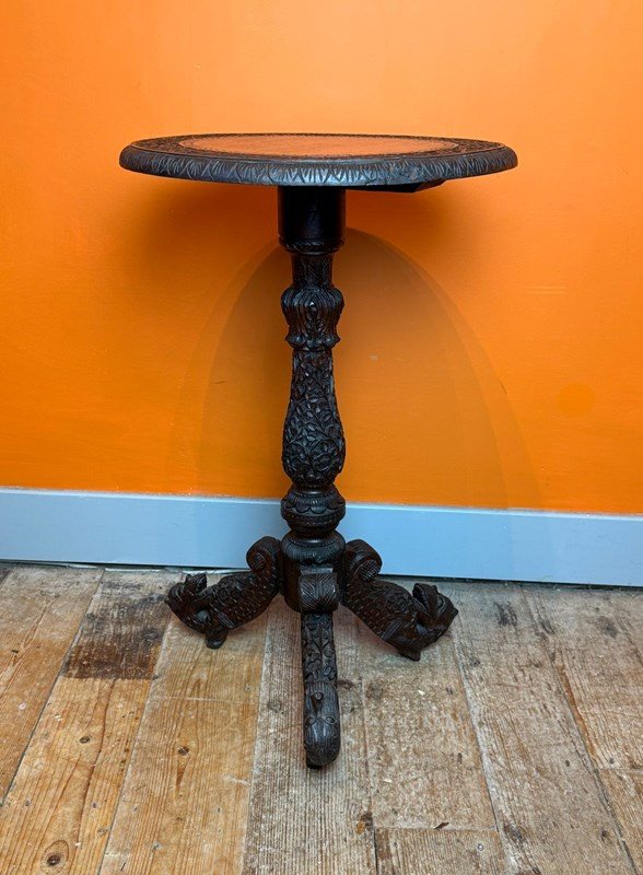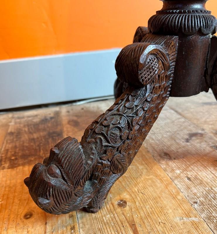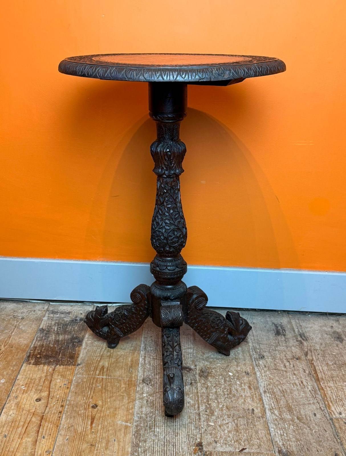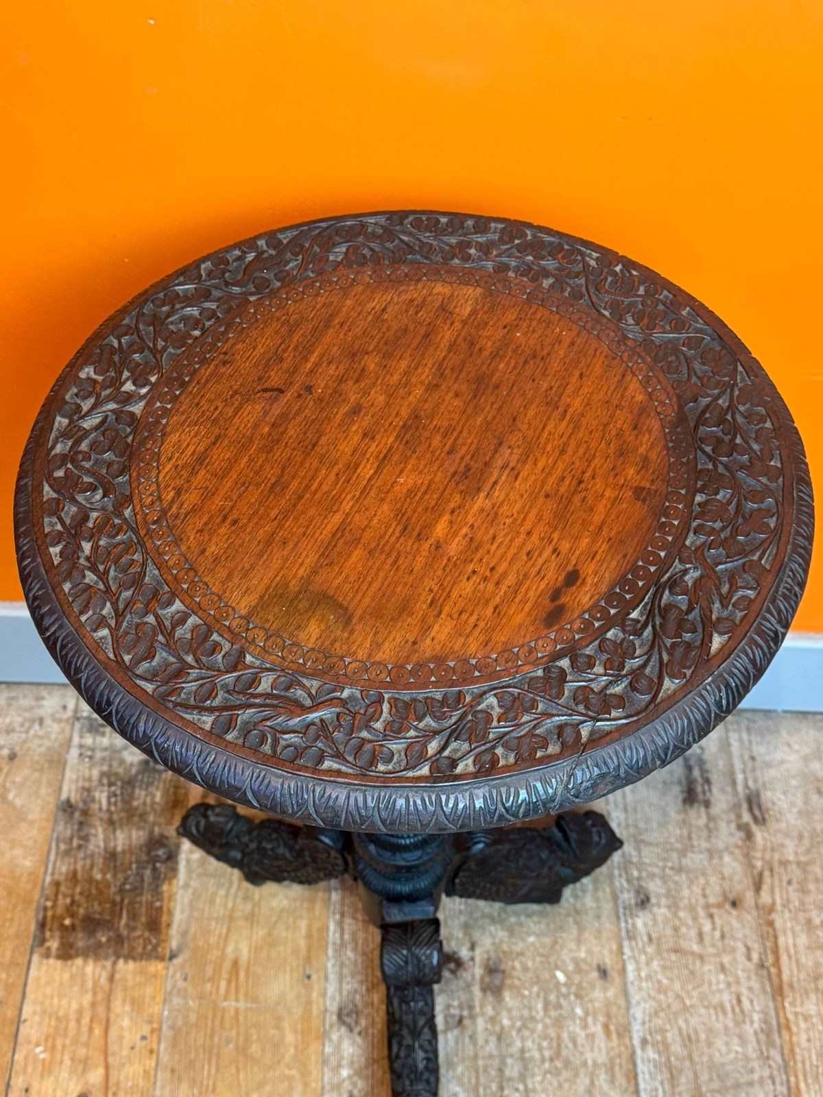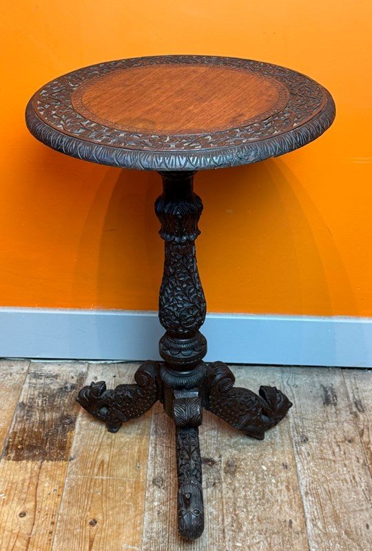 A 19th Century Indian carved rosewood tripod table, the circular top with a wide foliate carved border upon a baluster turned and carved column terminating in a tripod base with grotesque mask feet.