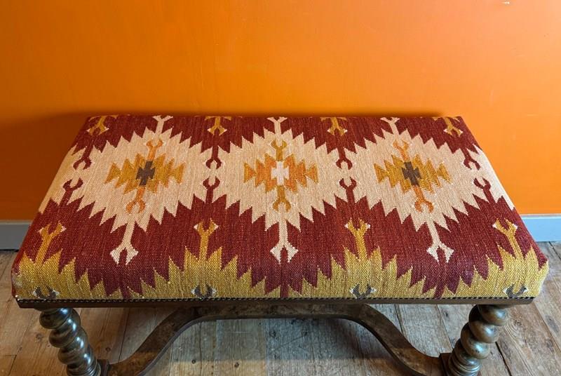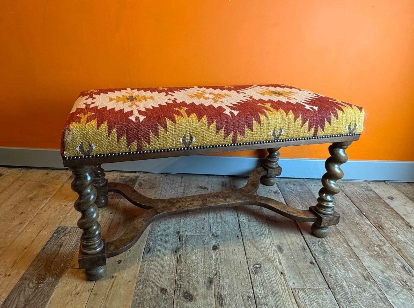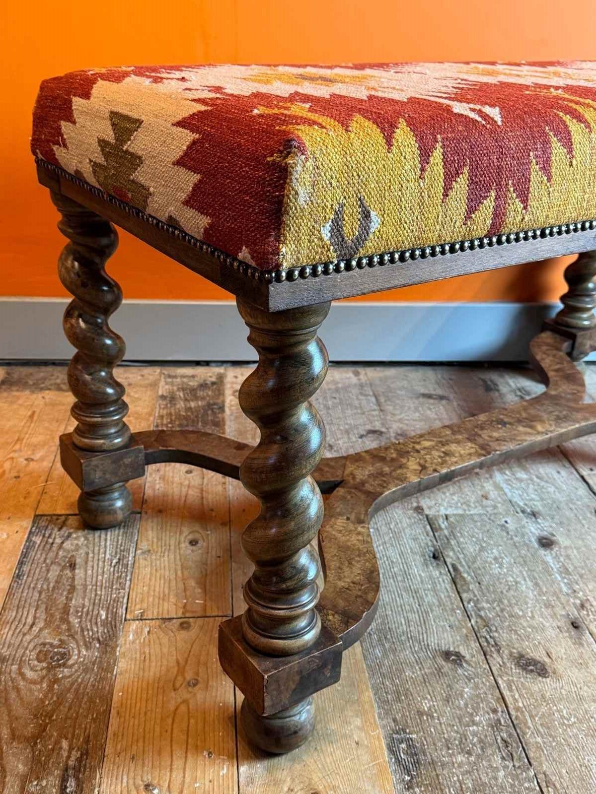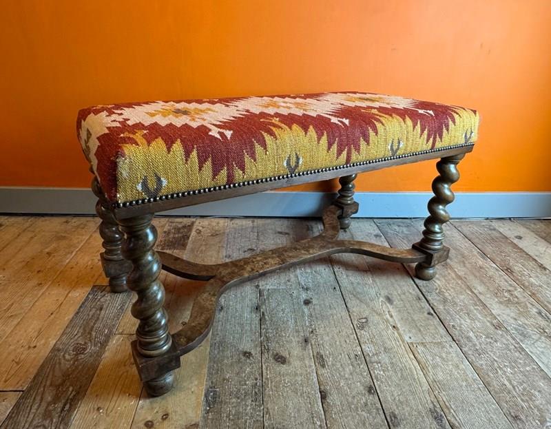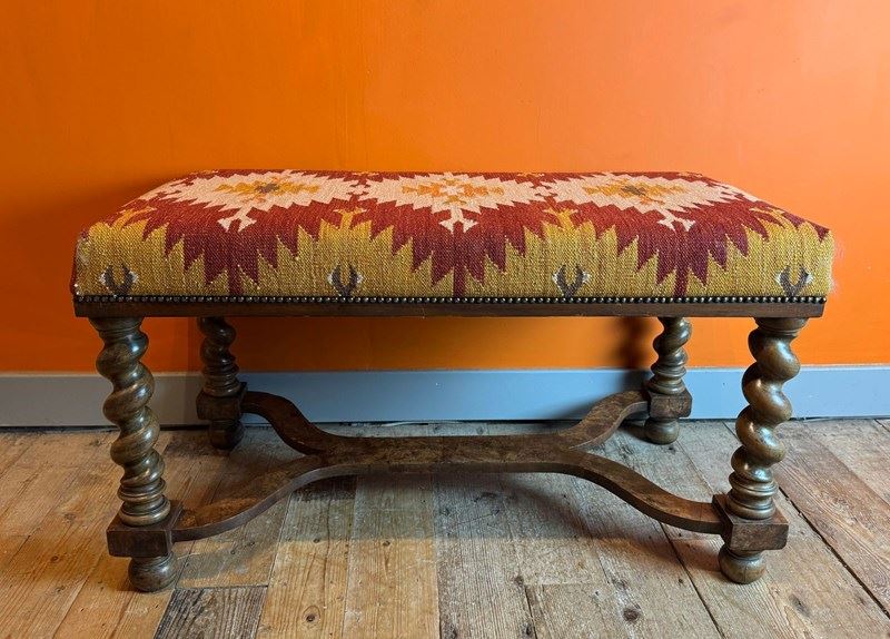 Antique Kelim Upholstered Stool With Burr-Walnut Barley Twist Base
